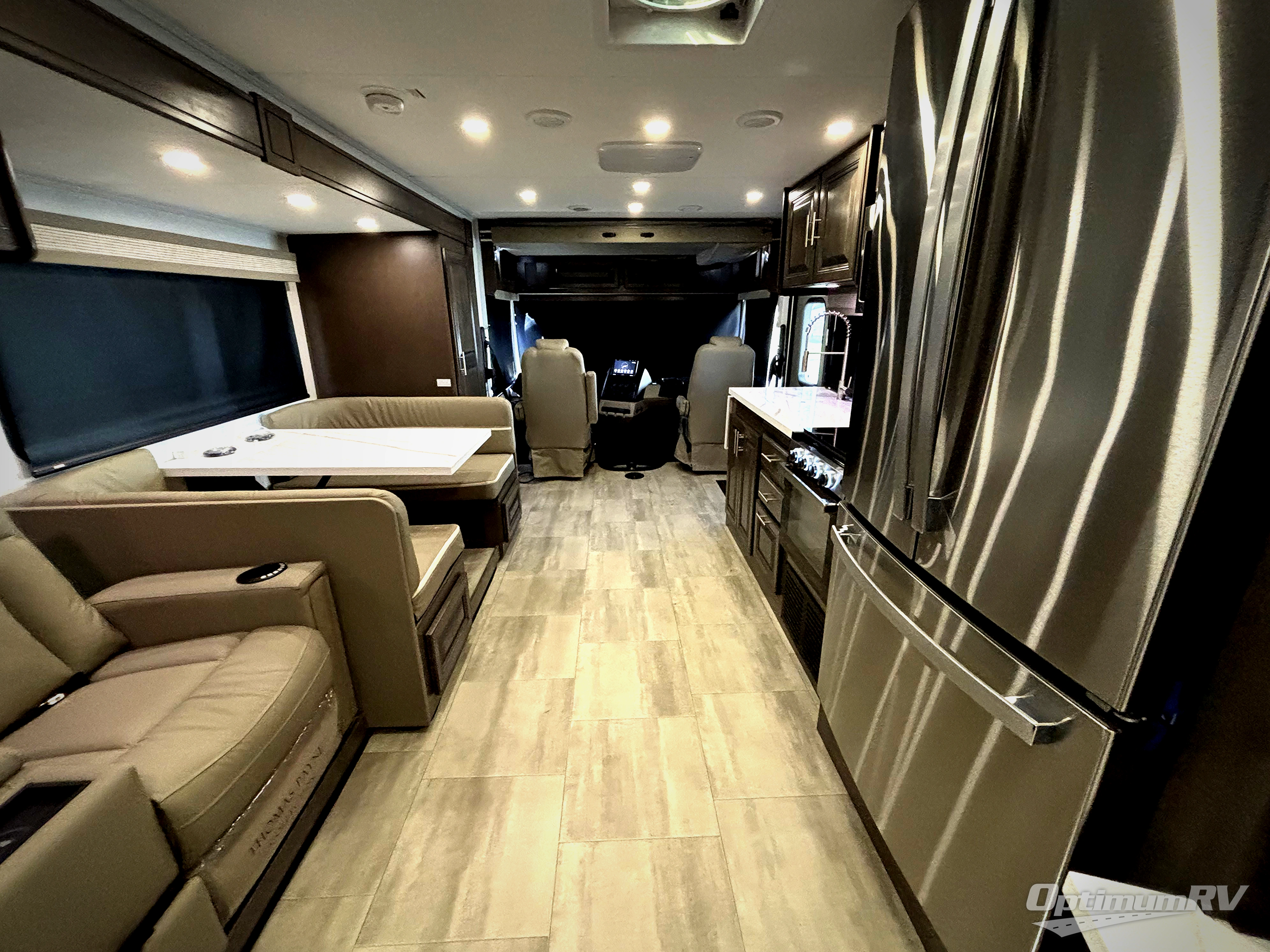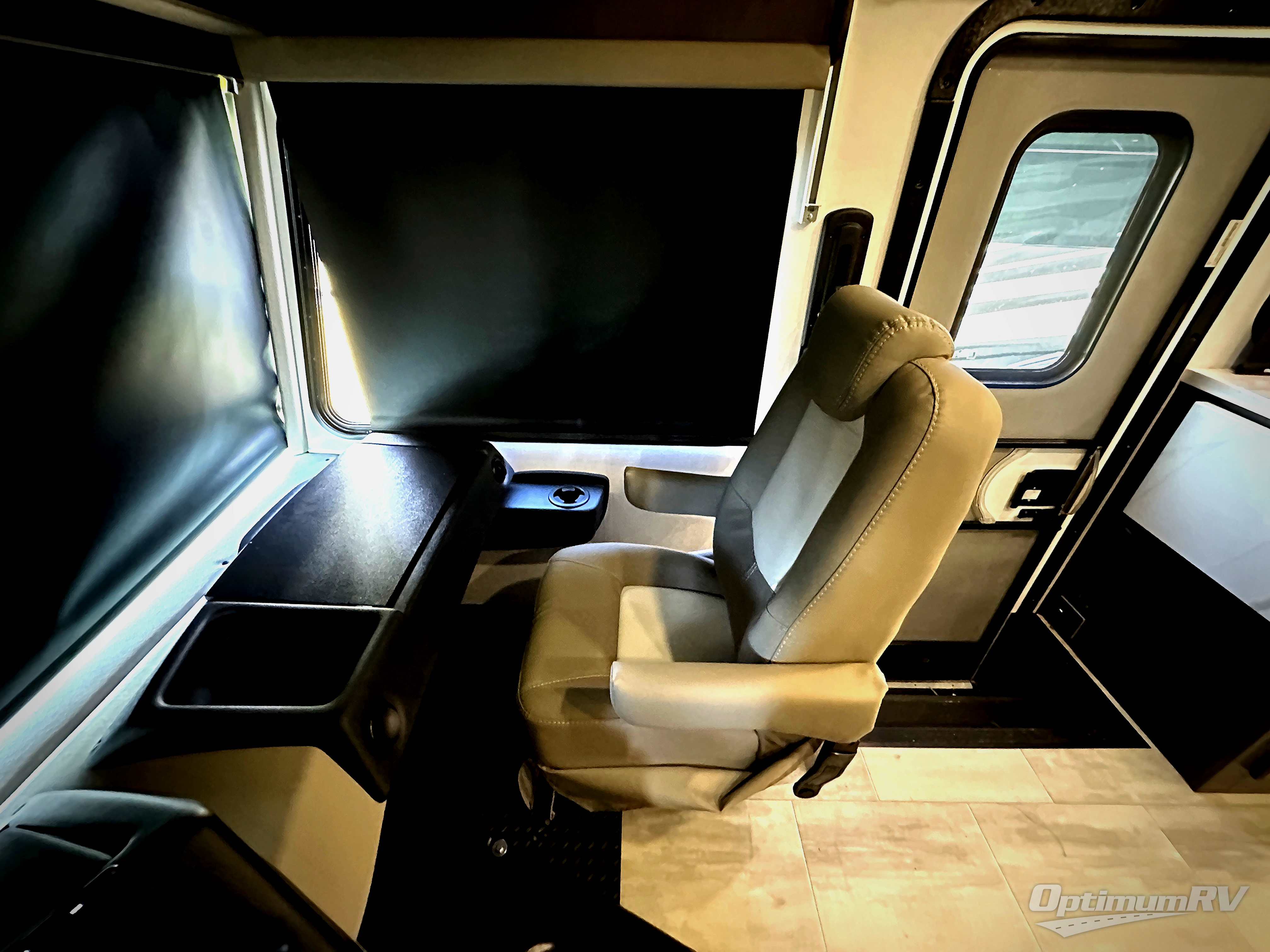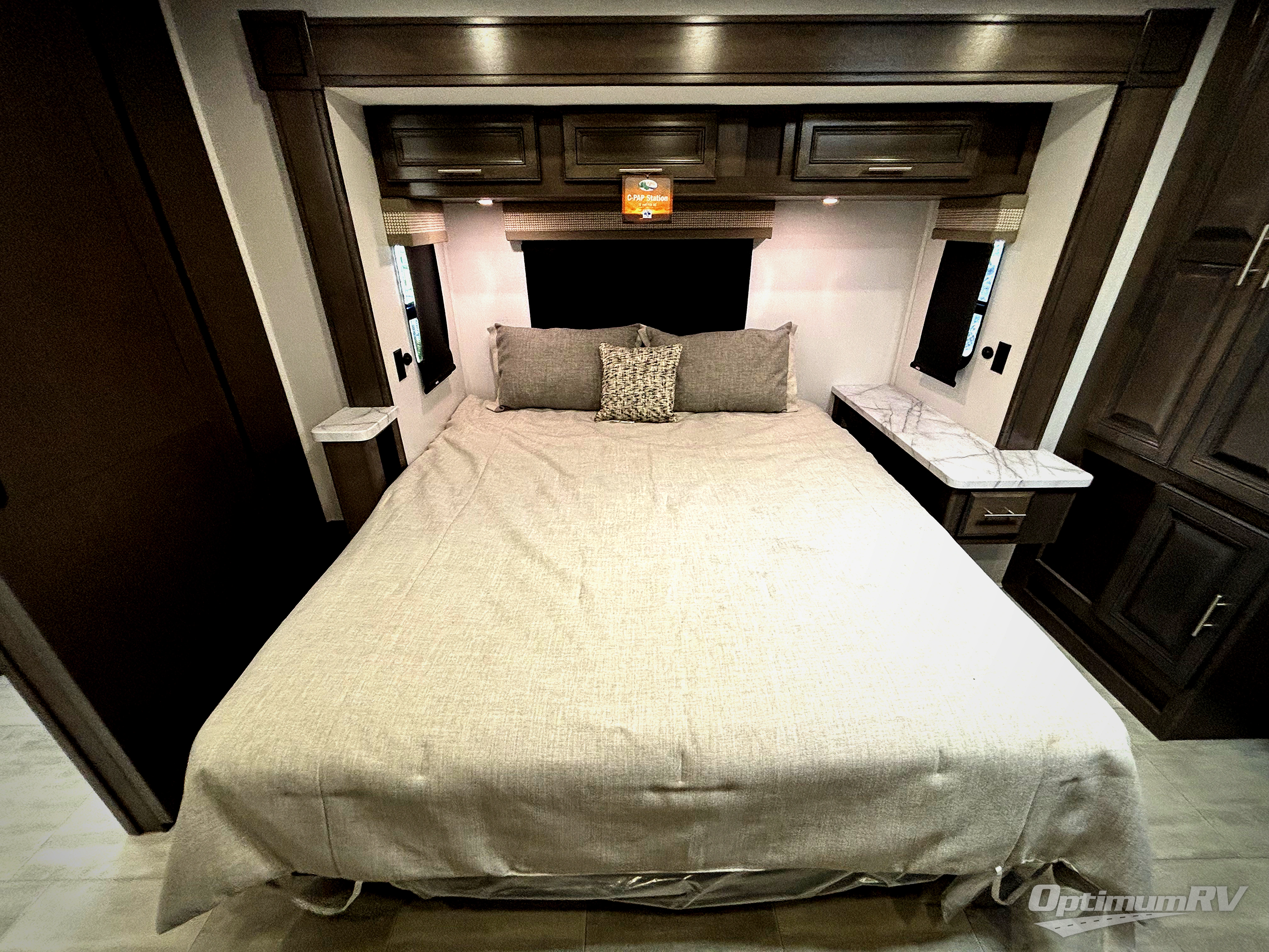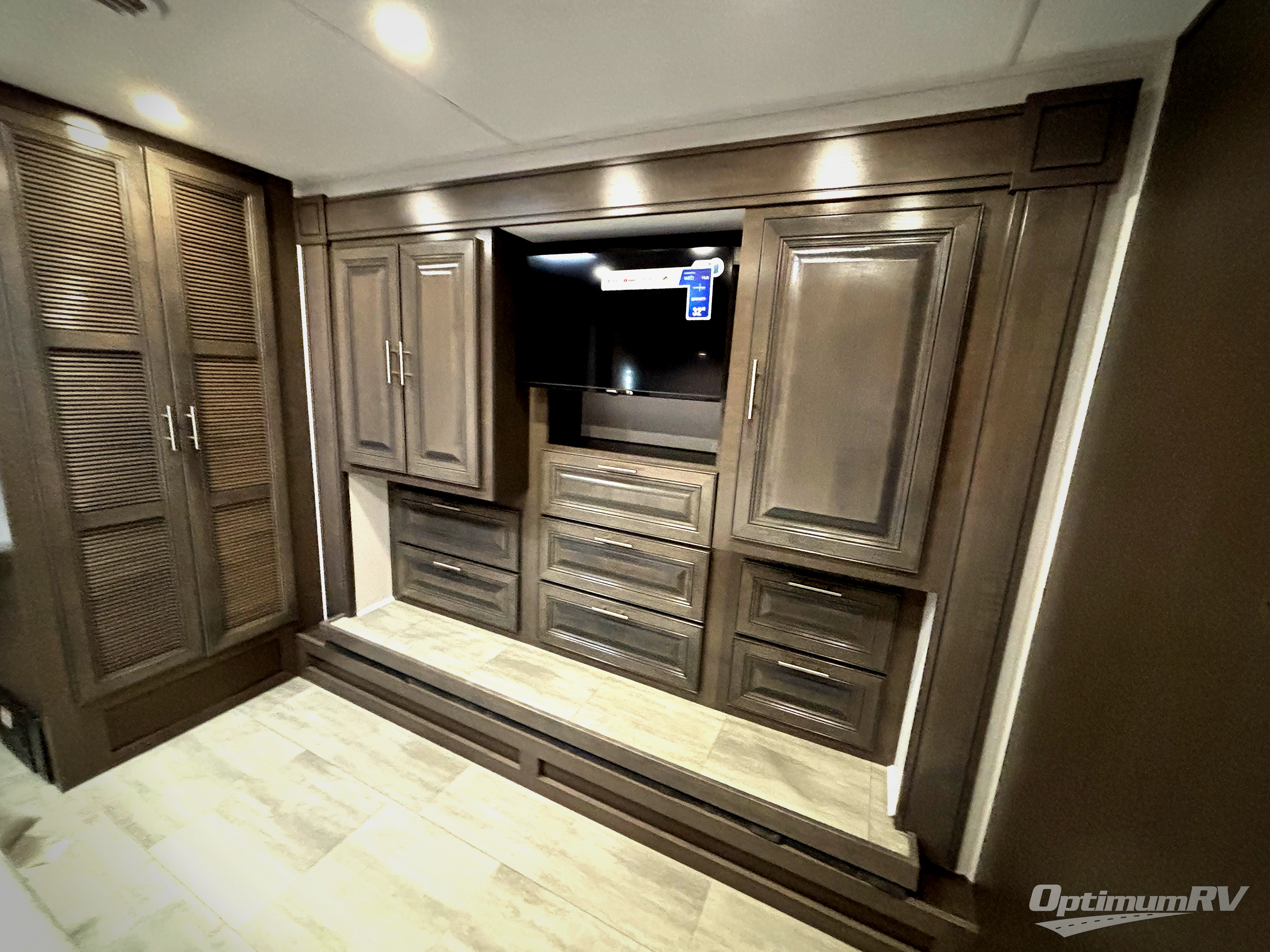 You won't believe all that the rear private bedroom has to offer in this motorhome! It features a 72" x 80" king bed slide with overhead cabinets, a dresser with a 32" TV and overhead cabinets, wardrobes on either side of the dresser, and a desk with wardrobes on either. And one of the wardrobes features an optional stacked washer and dryer for convenience! The split-style bathroom makes it easy for one person to freshen up in the shower with a seat while another uses the private toilet and sink. After a long day of traveling, you can relax on either the Thomas Payne theater seating with heat and massage across from the 5,000 BTU fireplace with a 40" LED TV above it or play a game and eat a meal at the Dream Dinette. There is also a power front overhead bunk for more sleeping space!