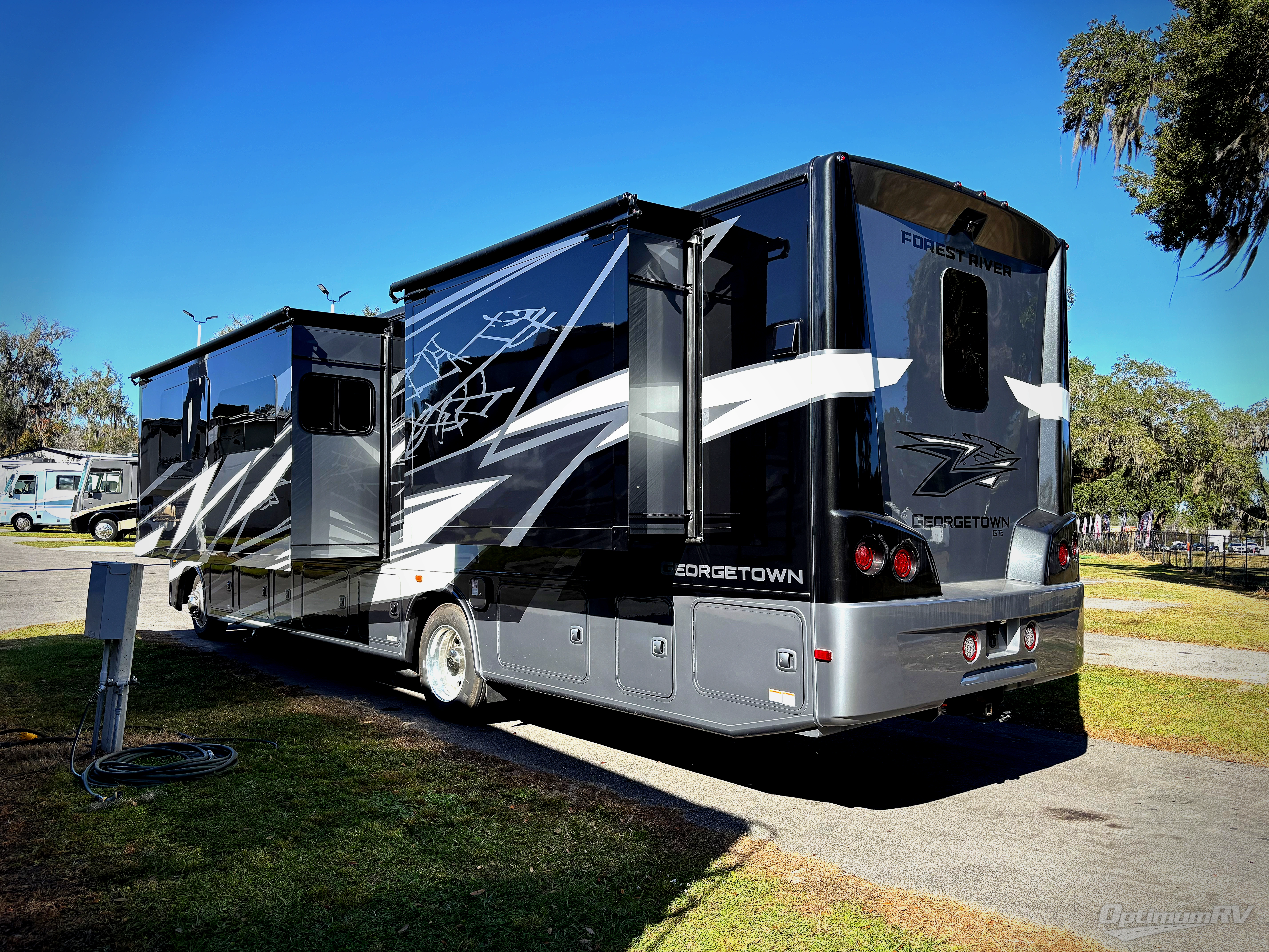 A spacious design and true luxury come together to create these Forest River Georgetown 5 Series Class A gas motorhomes! Their solid surface kitchen countertops, day and night shades throughout, and designer bedspread will have you feeling right at home. The color side and rear cameras help to prevent any dings or bumps while you travel, and the automatic hydraulic leveling jacks will keep your unit leveled where ever you set up. Durable construction consists of a crowned roof, 2" aluminum framed vacuum bonded gel coated sidewalls, plus high density block foam insulation that will allow you to travel in all seasons. You will appreciate the 50 Amp service, two house batteries, and 6,000 watt Yamaha generator to keep you powered up. An outside shower is also included on all models, along with rotocast storage compartments with drains, a power awning, and so much more!