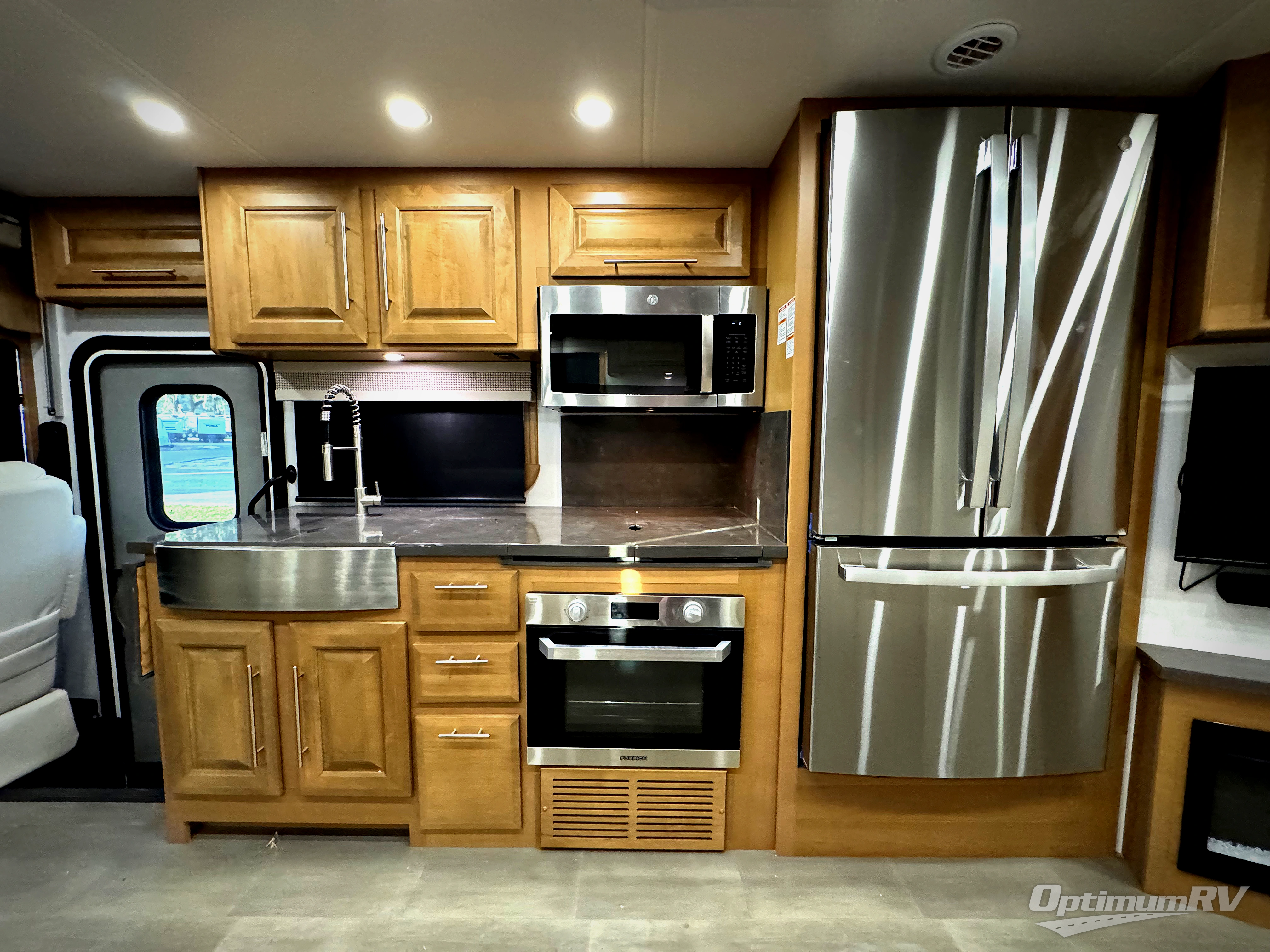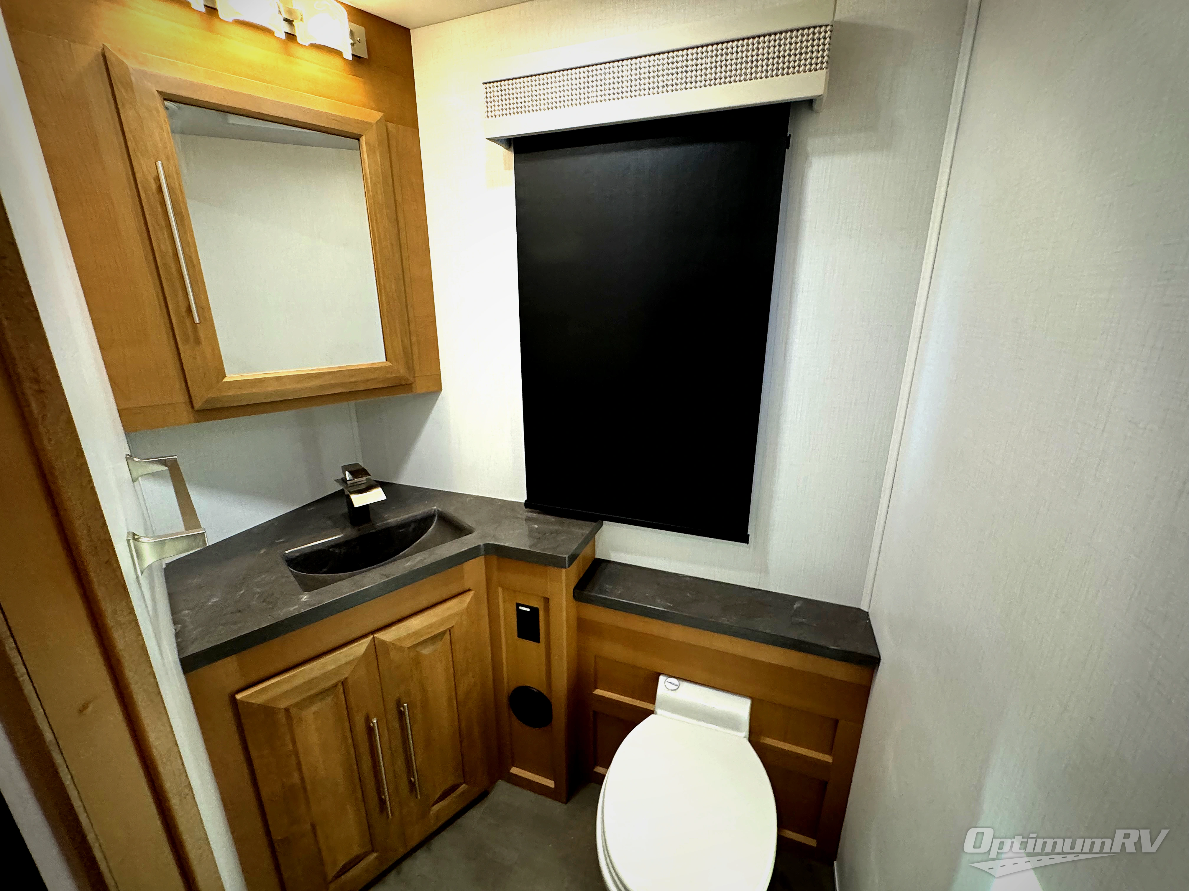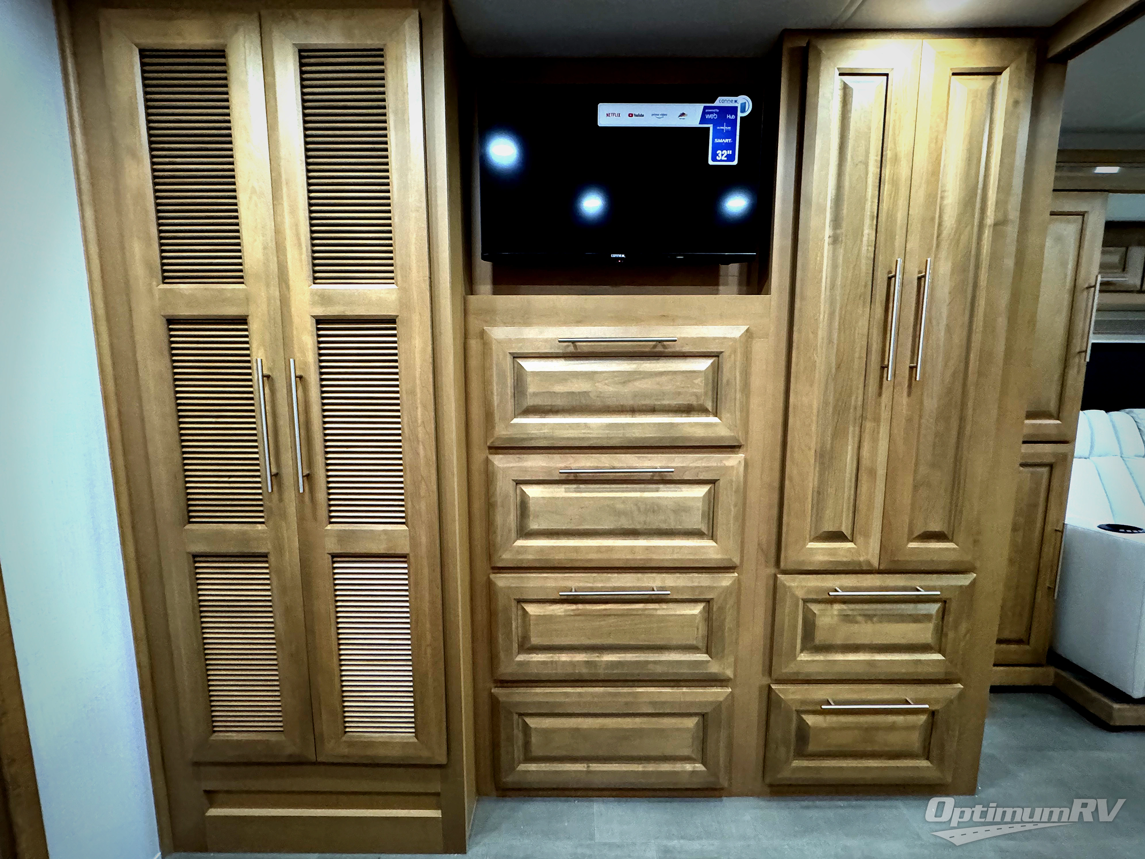 Comfort and convenience is found all throughout this motorhome! Starting with the full rear master bath that has a shower with a seat and a dual sink vanity, plus it leads into the private bedroom. Inside the bedroom is a 72" x 80" Power Tilt king bed slide with overhead cabinets across from a dresser with overhead cabinets and a 32" LED TV, a wardrobe, and another wardrobe that is prepped to add an optional stackable washer and dryer. The half bathroom is conveniently near the fully equipped kitchen so you can get back to creating your best home cooked meals fast. Relax in true comfort each night by either playing games at the booth dinette or on the theater seating that comes with power recline, heat, and massage!