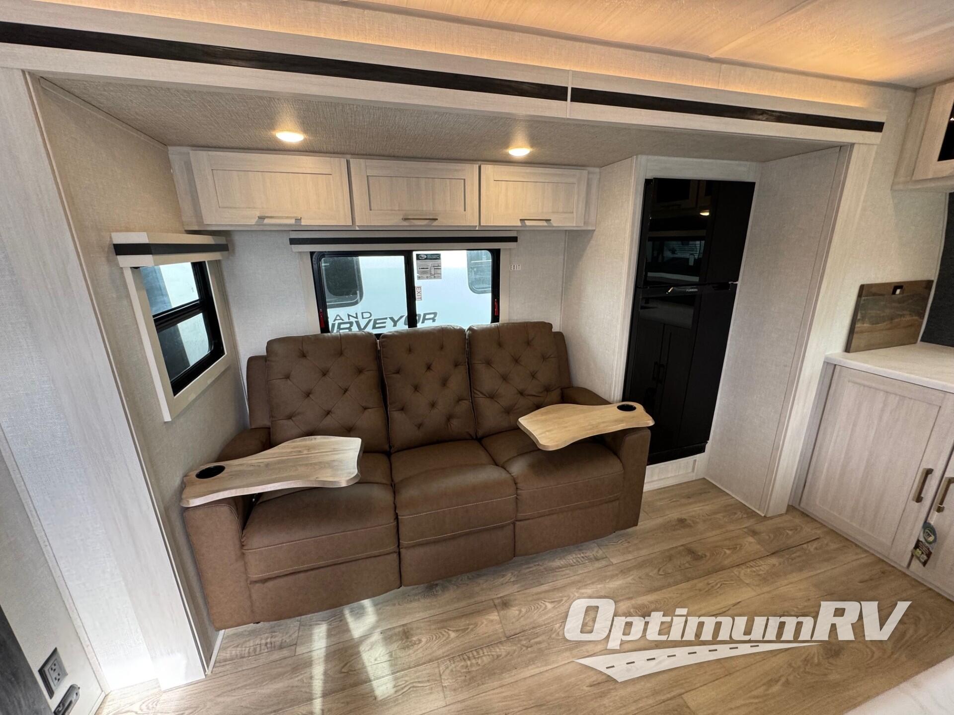 With any Grand Surveyor travel trailer by Forest River you will enjoy turn-key ready-to-go features and quality construction! Each model includes Azdel composite walls and a gel coated fiberglass front cap with an automotive style tinted windshield for a sleek look. There are friction hinge black glass entry door(s), an adjustable platform step with a night light, plus Goodyear tires and a power tongue jack for easy towing. The interior will have you feeling right at home with roller shades, residential faucets, sinks, and bathroom vanity, plus Surf(x) seamless countertops throughout. You can also plan for adventure with a 2" rear accessory and exterior spray port, and there are slam latch exterior baggage doors throughout to keep all your gear secure. Other stand-out features include a central vacuum system, a 200 watt solar panel with a 30 amp controller, a tankless water heater, carpet-free interiors, and the list goes on!