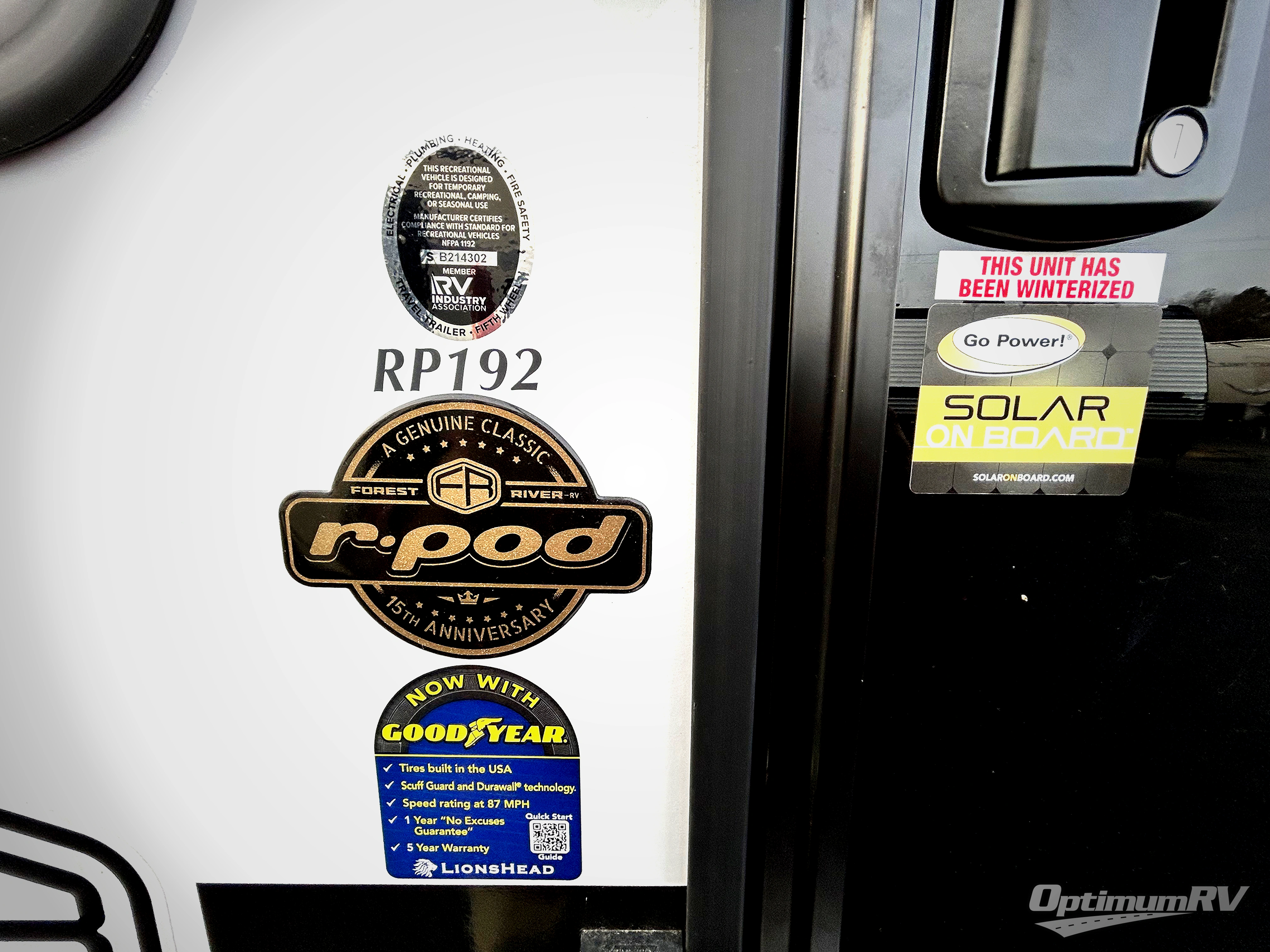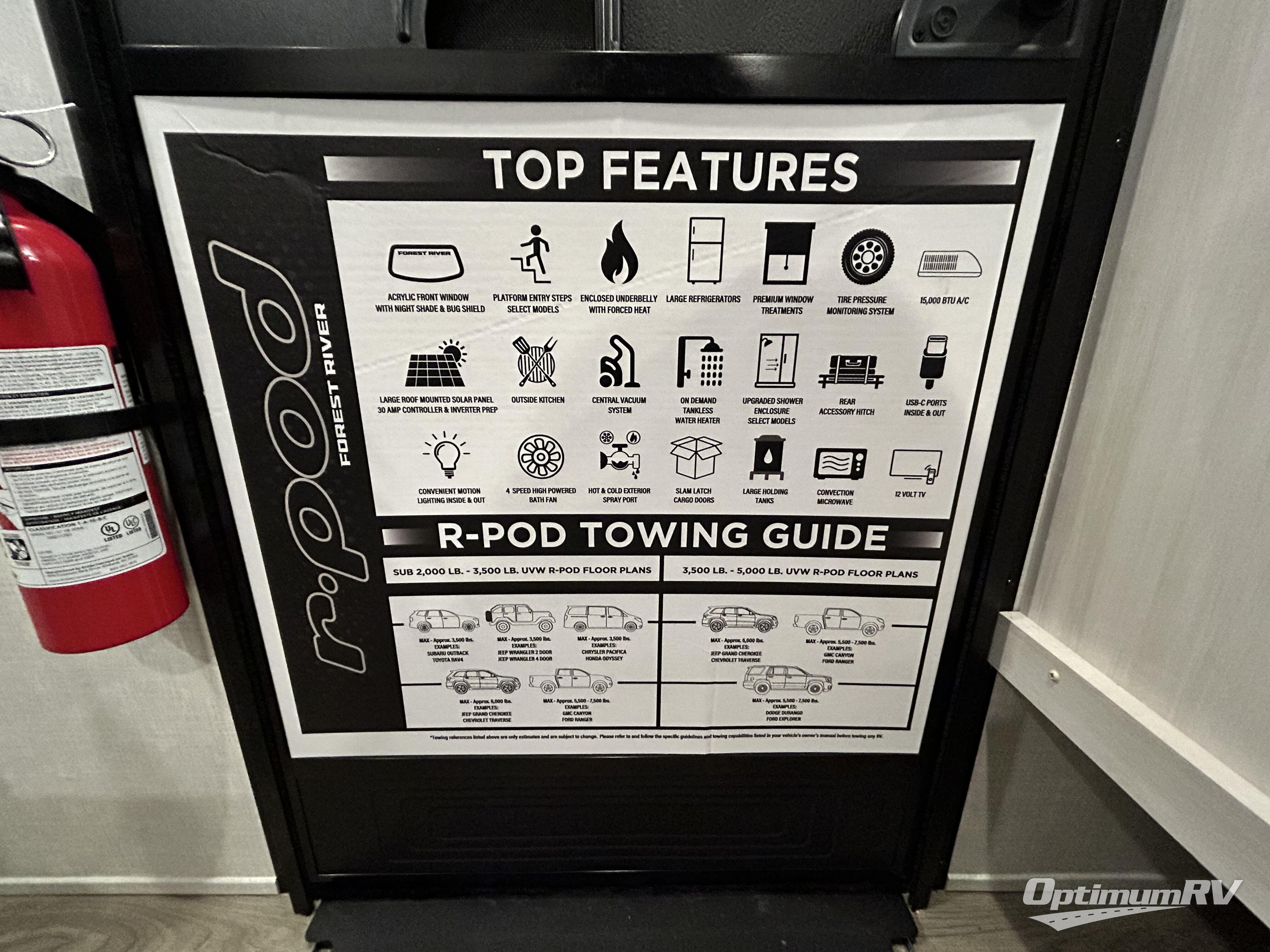 With any R-Pod travel trailer by Forest River, you will enjoy affordable luxury at the lowest tow weight in its class! There is a sealed underbelly with forced heat, a curved dual-pane acrylic front window with a bug screen and night shade, plus a large roof mounted solar panel for off-grid capabilities. The 15K A/C unit will keep you comfortable during the summer camping months, and the tankless water heater will provide endless hot showers after hiking, biking, swimming and more! Each model also includes a black glass friction hinge entrance door, roof ladder prep, exterior motion lighting, plus a hot and cold exterior spray port to wash off sand from the beach. Inside, you'll enjoy seamless Surf-X kitchen countertops, blackout roller shades, and a central vacuum system for hassle-free cleaning!
