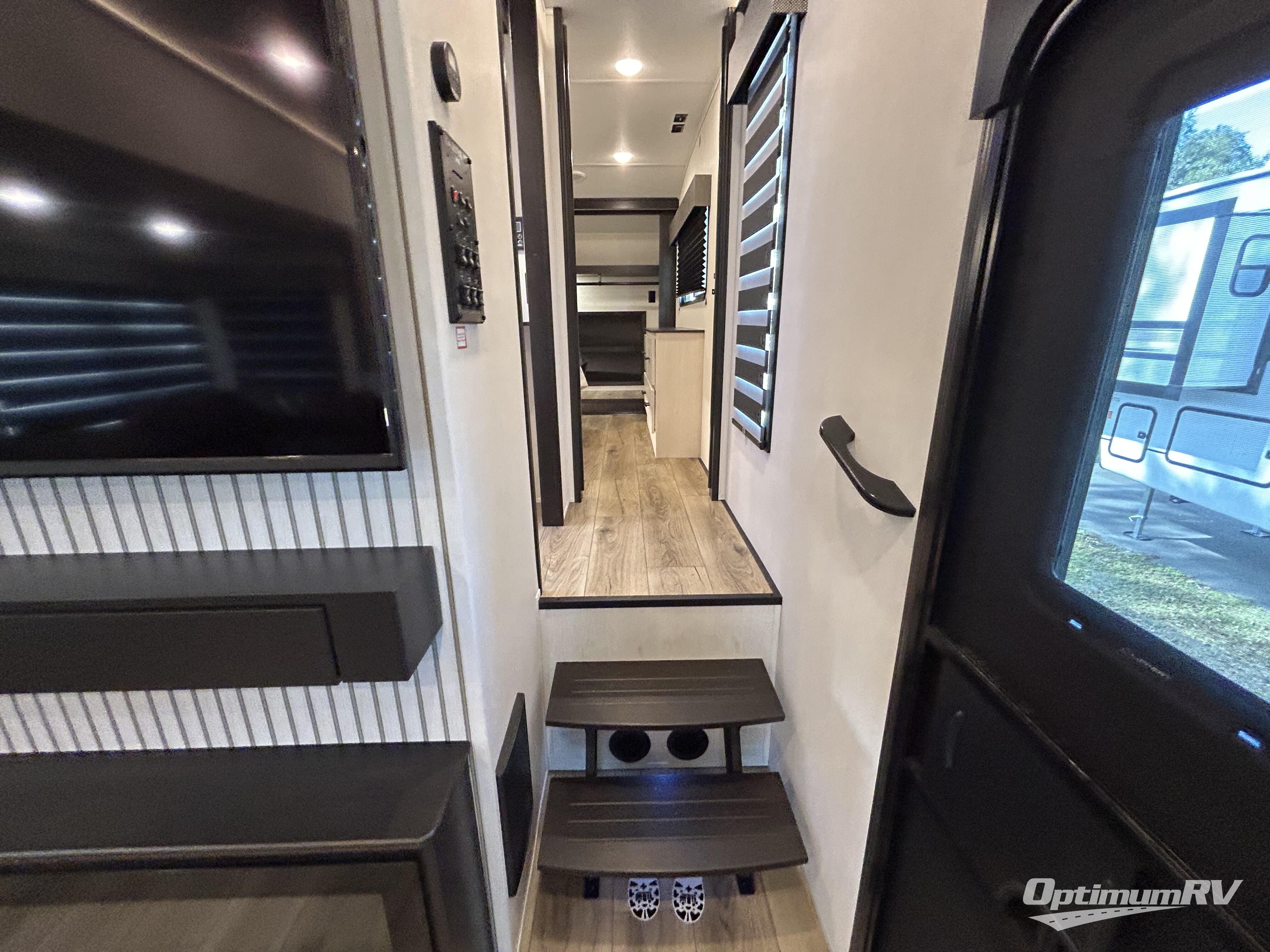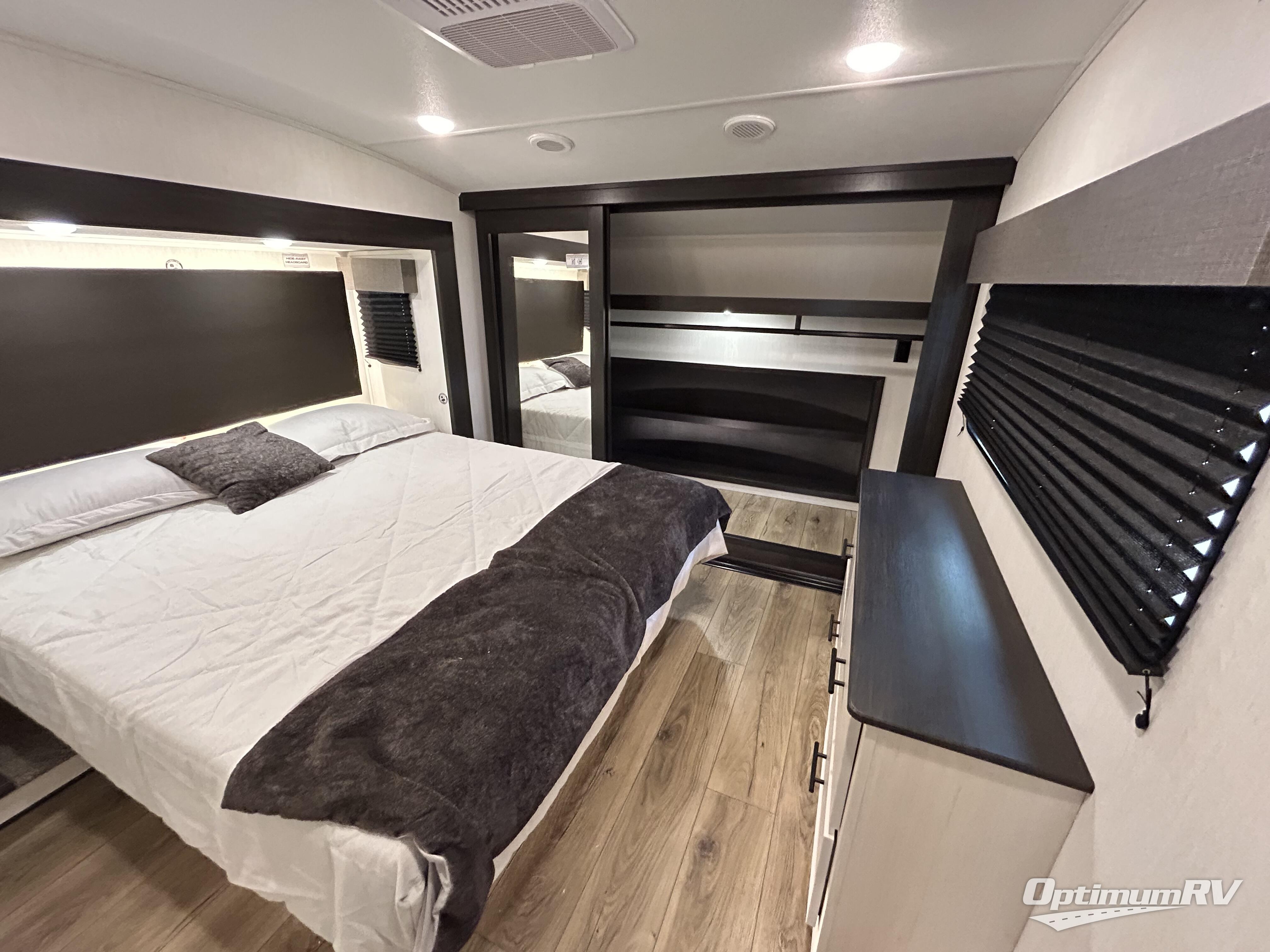 Whether you're weekend warriors or going full-time, this fifth wheel is sure to bring many happy days! The rear deck provides a place to relax in the evenings, and there is an overhead loft above here to use as storage or sleeping space. Once you head through the sliding patio doors, you can make dinner in the full kitchen before relaxing in the middle living room on the sectional sofa with an ottoman. There is also a table with chairs if game night is in order! The full bath includes a spacious shower with a seat for added comfort, and the camper king bed slide out in the bedroom will give you plenty of space to stretch out at night. You'll also appreciate the dresser and wardrobe to keep your space tidy, plus there is washer and dryer prep if you want to add those appliances!