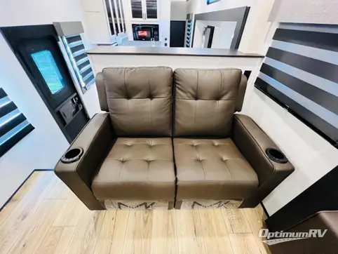 There is only one word that can describe this Sabre fifth wheel; fabulous! You will be amazed by the amount of comfort and convenience that is scattered all throughout this model for you and your family or friends. From the tri-fold sofa slides and theater seating to the rear bedroom with its camper king bed and wardrobe slide out, you will always have a place to relax and unwind. Not only that, but there is also a double loft area up above the bedroom and bath which has sleeping space, storage, a wardrobe, and railing for safety. The cook will enjoy the 12V refrigerator with French doors and pantry for all of your food storage needs, and the table with chairs is the perfect place to sit down and enjoy a delicious meal or play board games.