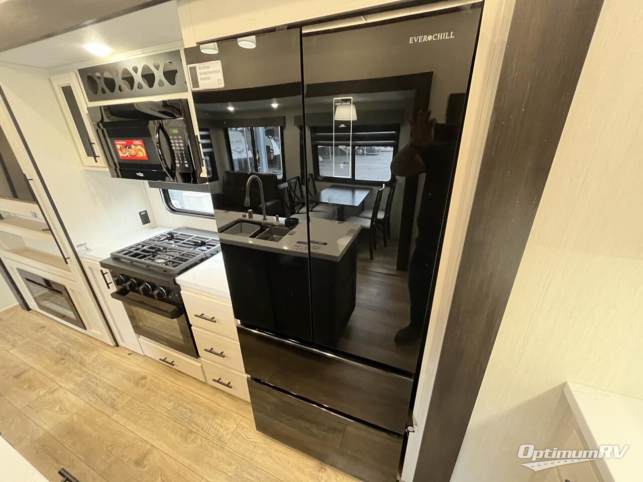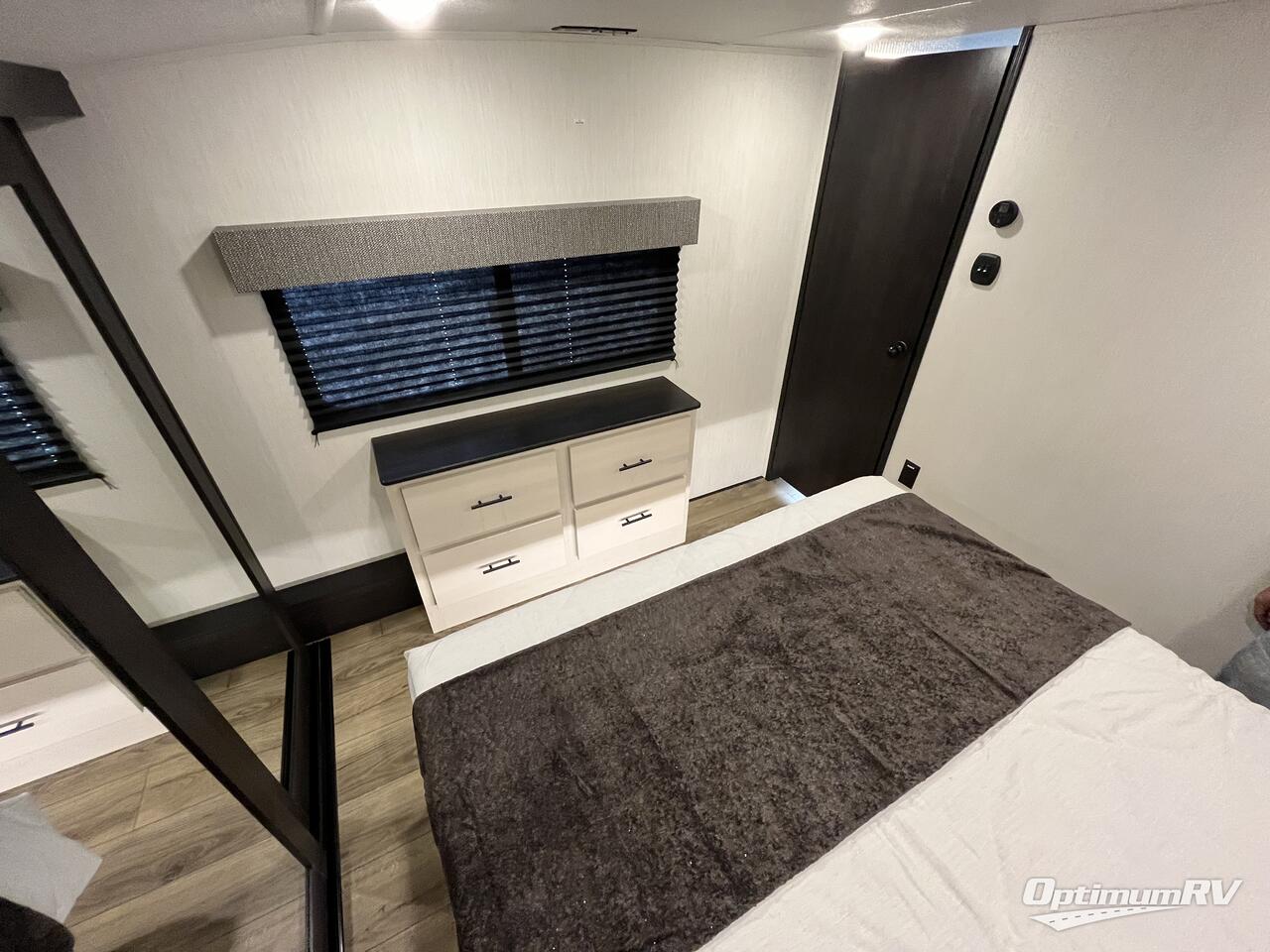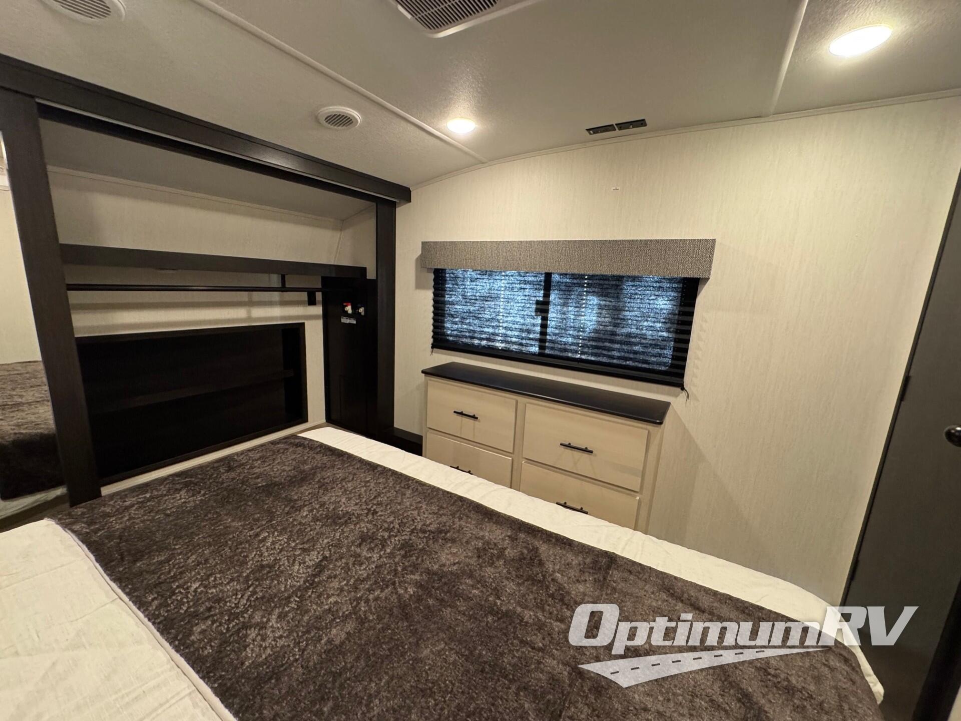 You won't believe all that this fifth wheel has to offer! Enjoy a good night's rest each night on the camper king bed slide in the front private bedroom which also has a front wardrobe with washer and dryer prep, and the rest of your group can sleep in the second bedroom. Inside this bedroom is a slide that houses a tri-fold sofa with a flip-up bunk above it, an entertainment center with storage, and a loft area above it all with two bunks and cabinets. The rear bedroom even has its very own rear full bathroom with a 36" x 24" shower to freshen up in each morning and one of the dual entry doors to the unit. The chef will enjoy using the kitchen island to prepare their best home cooked meals and everyone can gather together at the dinette/sofa combo conveniently across from the entertainment center with a fireplace.