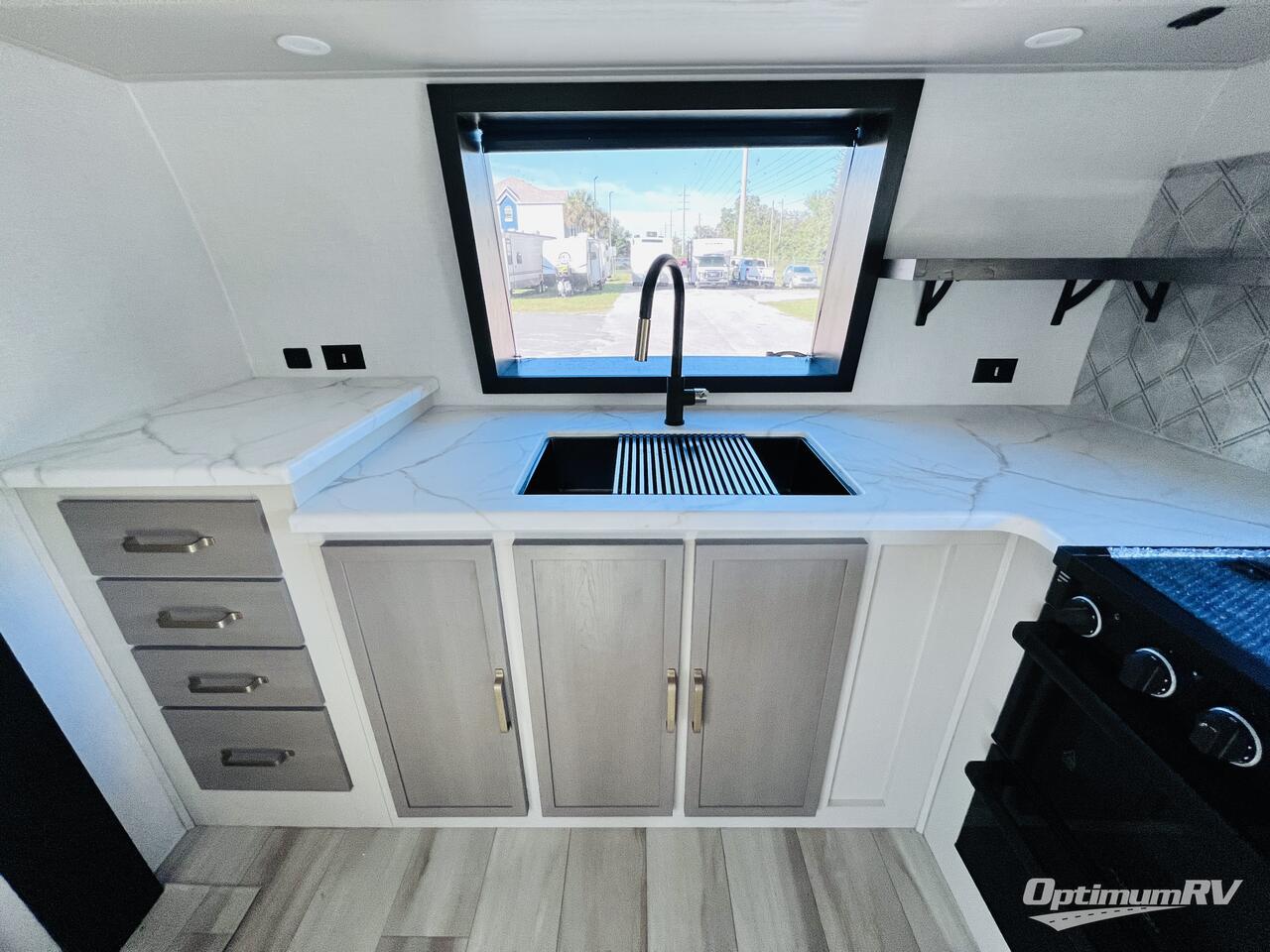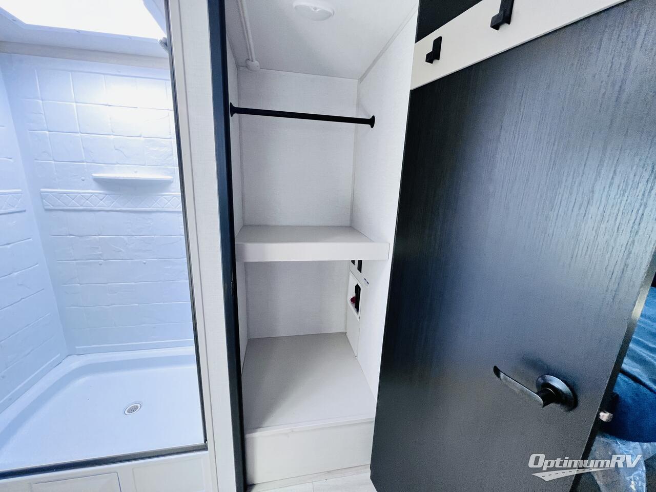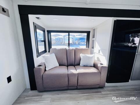 This is the perfect couple's trailer for weekend trips to the campground. The front kitchen includes ample counter space, including a bar top with two stools. You can relax on the theater seat within the slide out here, and the pantry and 12V refrigerator is close by so you can grab a snack. A master bedroom includes a custom king bed slide out, a panoramic window, an ottoman, plus a dresser with a fireplace to make your space cozy. The full rear bath includes dual bath sinks, a walk-in shower with a skylight, plus washer and dryer connections if you want to add those appliances.