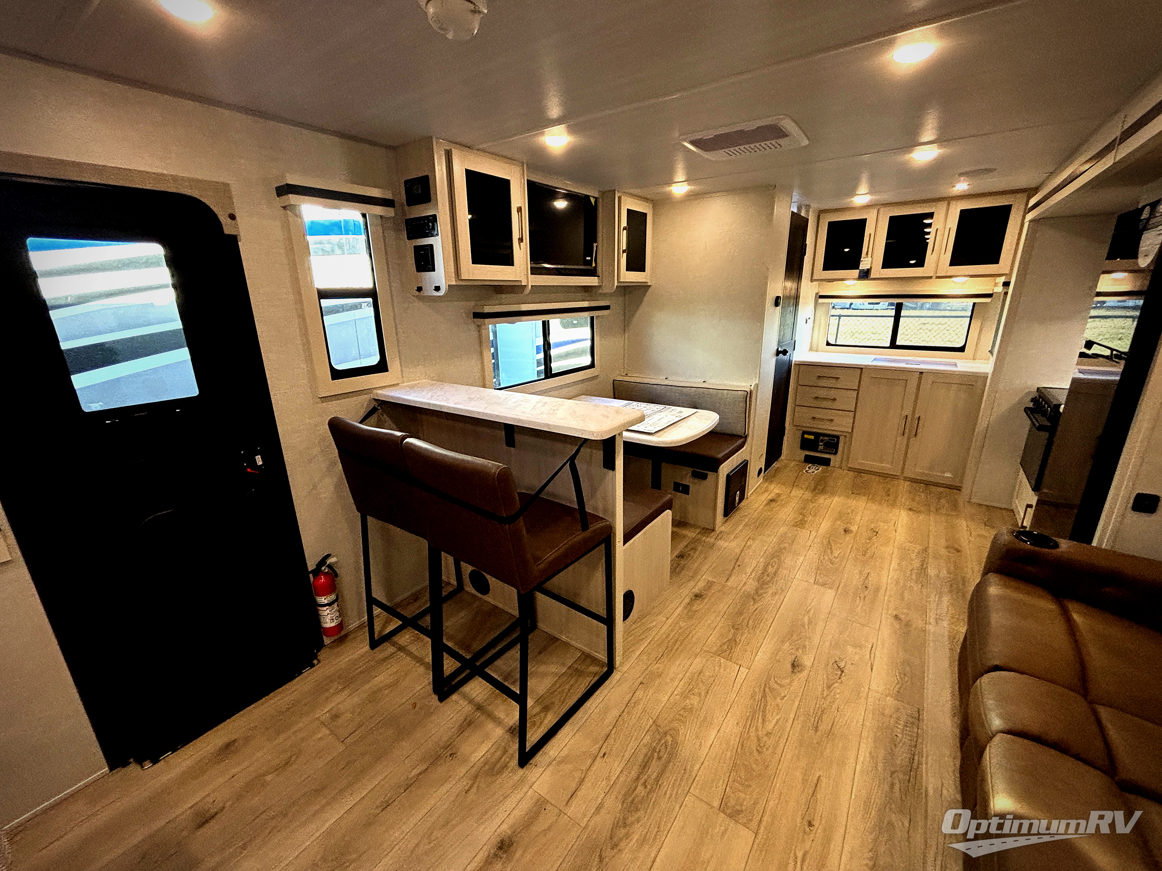 You'll love camping and spending time with loved ones in this spacious travel trailer. The 18' power awning with LED lights can be set up once you arrive at the campground, and you can unload camp gear from the pass-through storage. Head inside to make lunch on the residential range top or in the microwave oven. There is a booth dinette and tri-fold sofa for seating space, plus an additional counter with bar stools beside the dinette. A full bath onboard lets you clean up each day, and the front queen bed is sure to bring a great night's rest. There are also dual wardrobes to keep your space tidy and overhead storage for even more belongings.