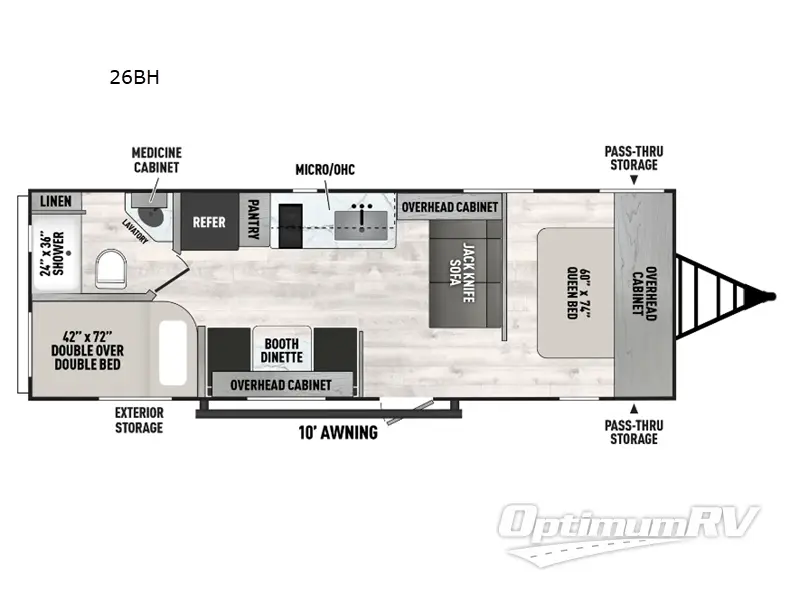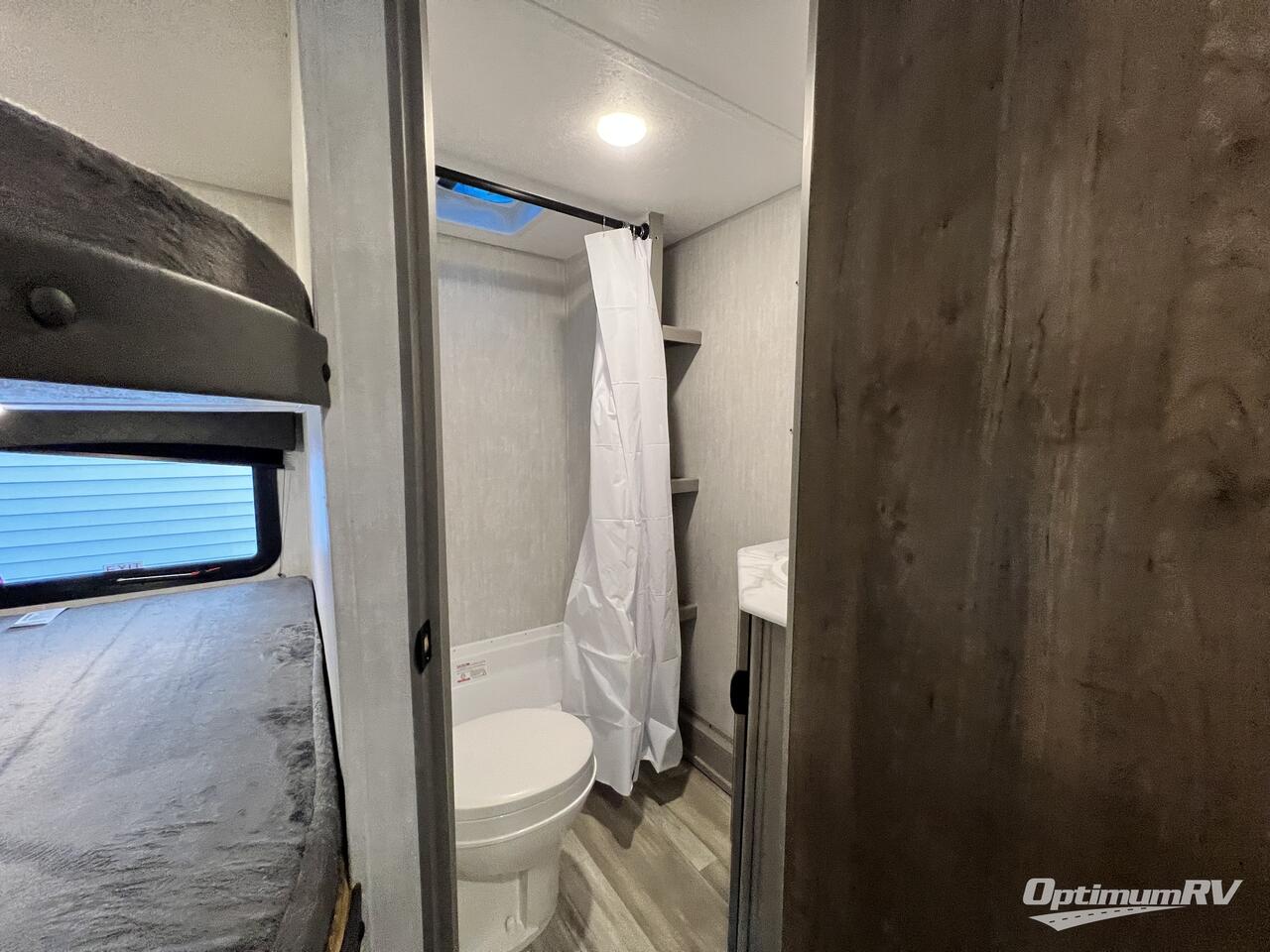 Bring the whole family with you in this travel trailer! The kiddos can sleep on the rear corner set of double-size bunks. The opposite rear corner features a full bath including a 24" x 36" shower, linen cabinet, toilet, and vanity with medicine cabinet overhead. In the main living space, you will find plenty of seating with a booth dinette and jackknife sofa which can also transform into an extra sleeping space if needed. Everyone's bellies will stay full with the induction cooktop, 8 cu. ft. 12-volt refrigerator, and microwave which you can use to pop a bag of popcorn for movie night. You will enjoy the front bedroom for a bit of privacy including a queen bed and large overhead cabinet for your things. On the outside, a large front pass-through for lawn chairs and camp gear. There is more storage beneath the bunks in back and a nice 10' awning to provide protection from the elements when outdoors.