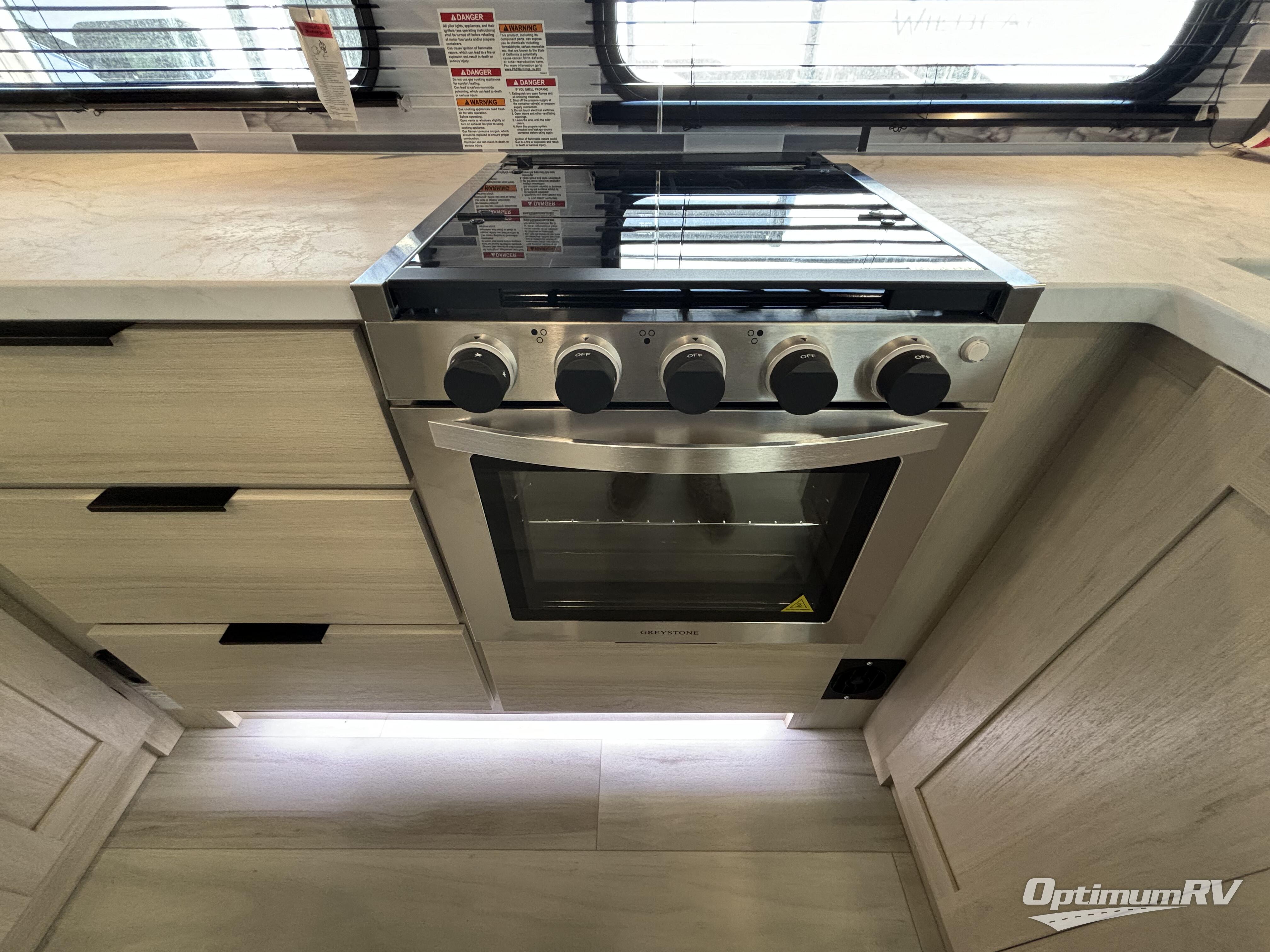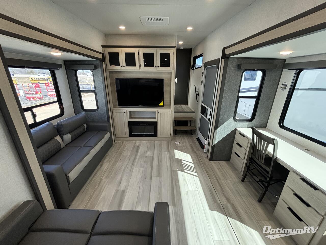 For the couple who love to cook, this fifth wheel is the perfect choice! There is generous counter space in the rear kitchen, along with overhead cabinetry, and a hi-top table and chairs for dining space. Beside the table is a desk with a chair and a campview window so you can still enjoy nature views if you have to work. When it's time to relax, the tri-fold sofa and theater seating in the living room will do the trick, or you can head outdoors to enjoy the two power awnings. A full bath will let you freshen up before bed, and speaking of bedtime, the king bed slide out in the front bedroom is sure to bring comfort. There is also a walk-in wardrobe with washer and dryer prep and a dresser to keep your space tidy!