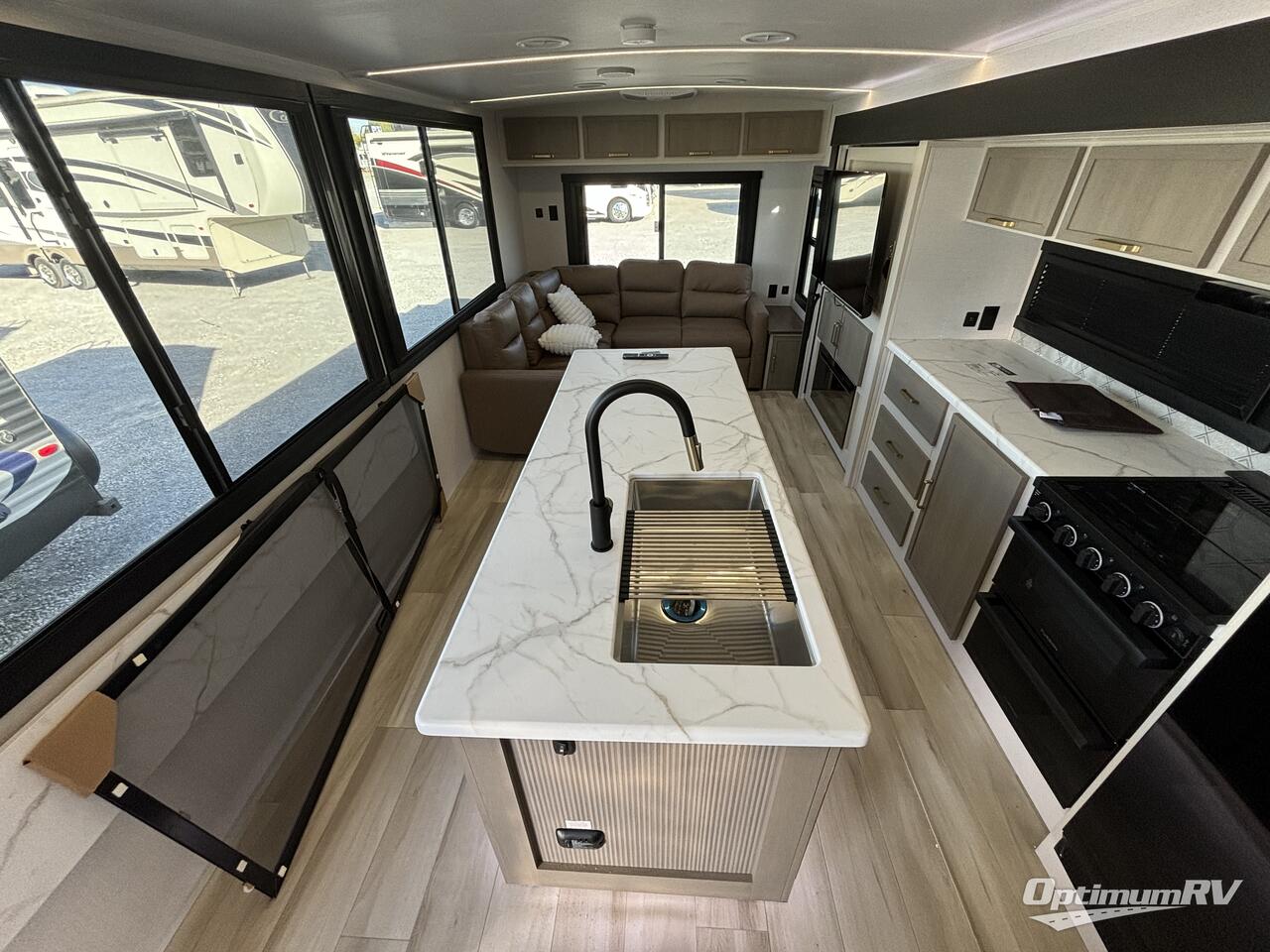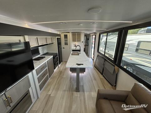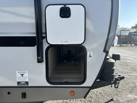 Doubles slides, a front private bedroom, and sleeping space for four to five make this travel trailer the perfect RV for camping trips. You will love the unique swing-open entertainment center with a 50" TV and fireplace and hidden storage with shelves. The L-shaped sofa will be great for lounging and the kitchen island with five stools provides a place to dine at each day. There is also a kitchen pantry, a coffee bar where you can set up your Keurig machine plus plenty of overhead cabinets for added storage. When you're ready for some shut-eye, the front private bedroom will bring comfort with its custom king bed, front bench with reading lights, and removable shelves with a hanging rod to keep clothes wrinkle-free. And did we mention this model has sliding glass patio doors for a more residential feel!