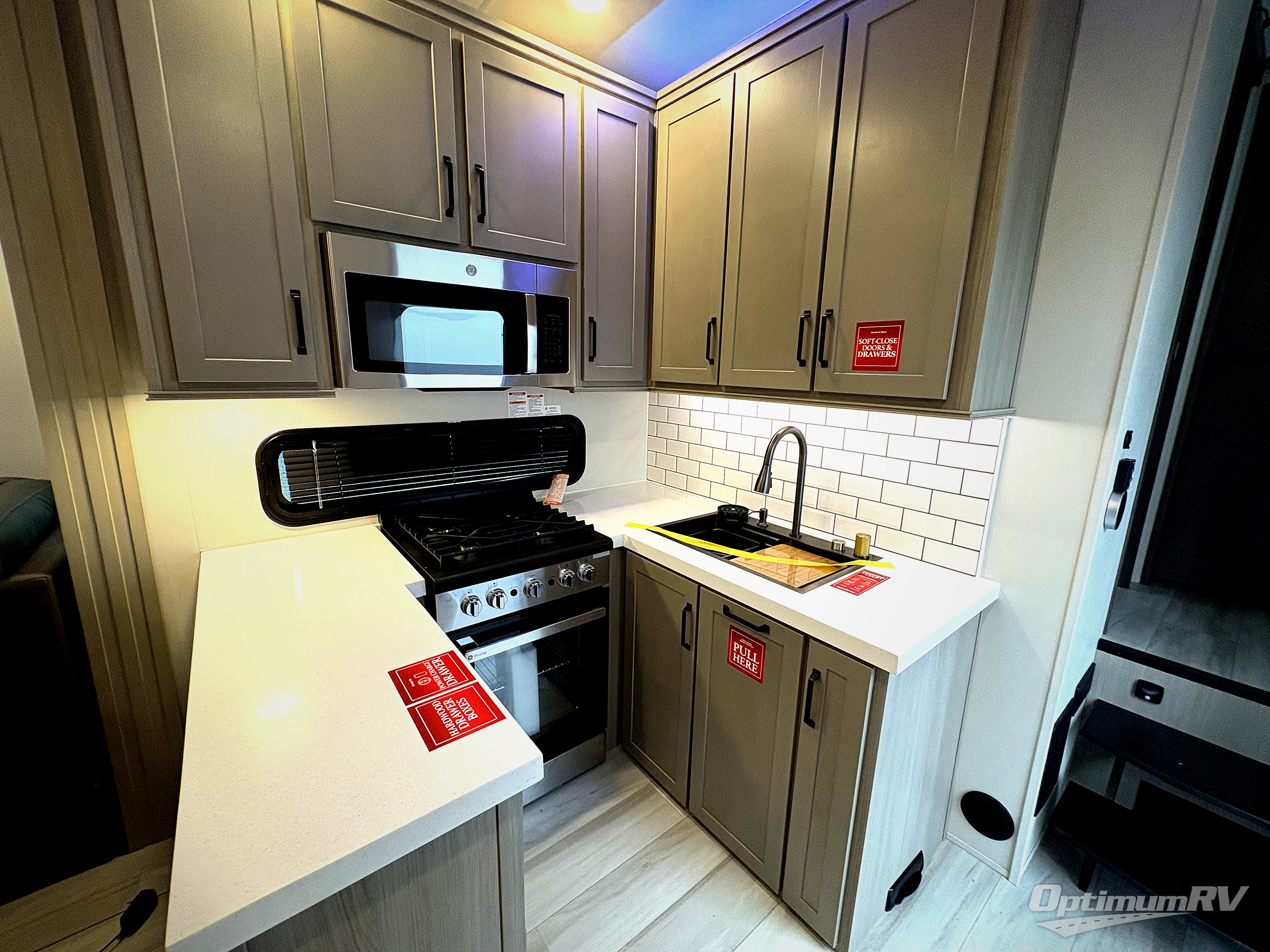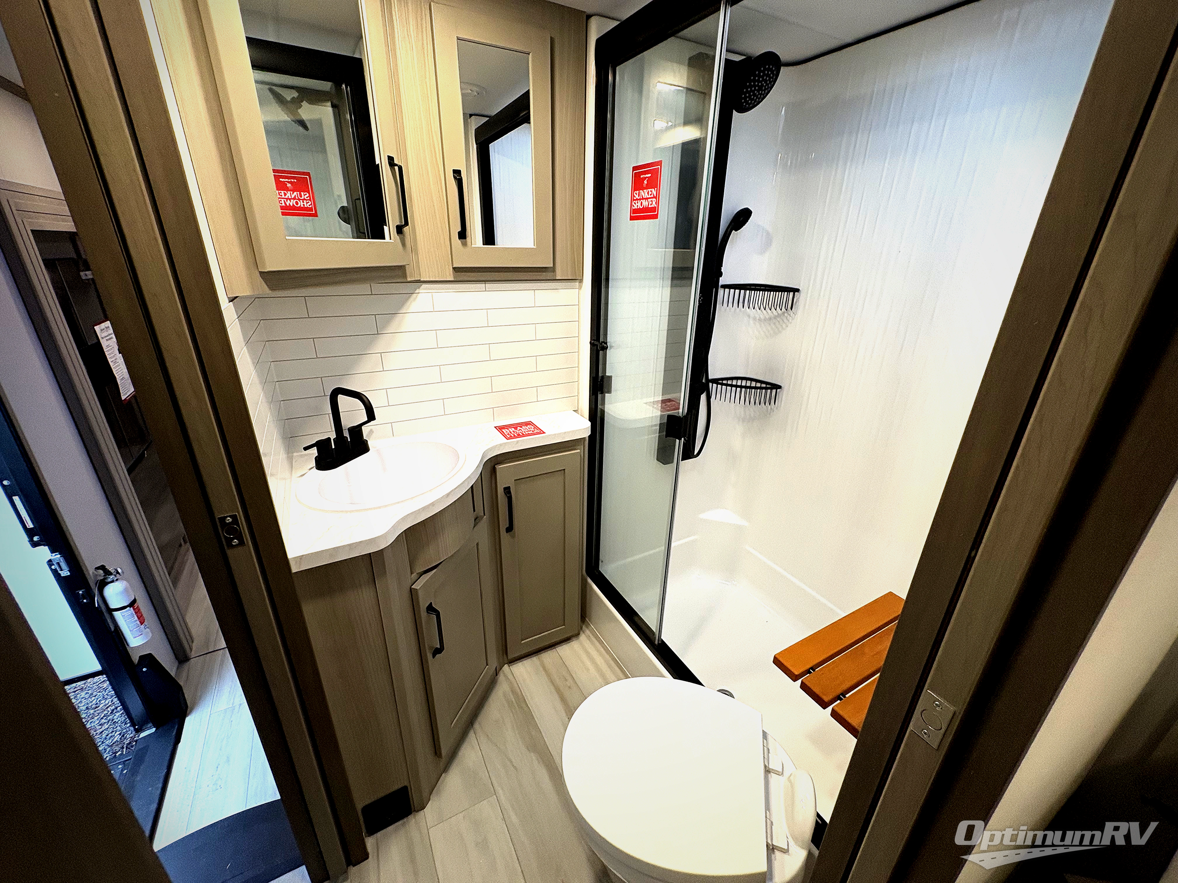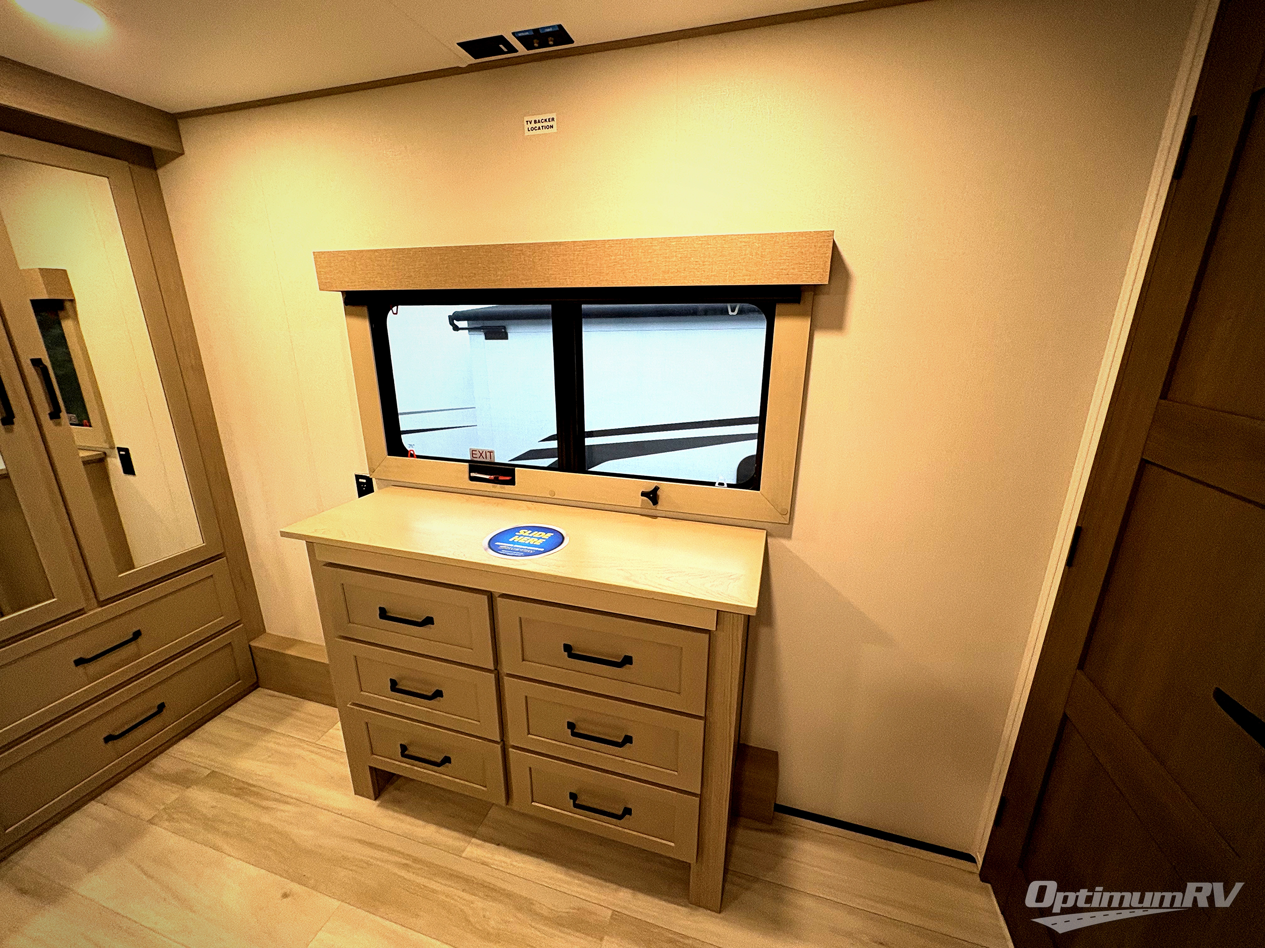 Any time spent in this spacious toy hauler will be time well spent! The 14' garage includes an overhead loft bed and a flip-up pet dish for your furry friends. If you're needing more sleeping space, you might want to choose the optional Liftsuite System and optional half bath. Once you enter in the main living area, you can relax on the L-shaped sofa with recline across from the fireplace, and there is a free-standing dinette if you want to play a game or two. The chef of your group will love the generous counter space in the kitchen, and the dual entry bath will let everyone stay clean throughout your trip! Head to the front master bedroom to enjoy the queen bed slide out with an optional king bed, a slide top dresser with TV prep, plus a large front closet, complete with washer and dryer prep!
