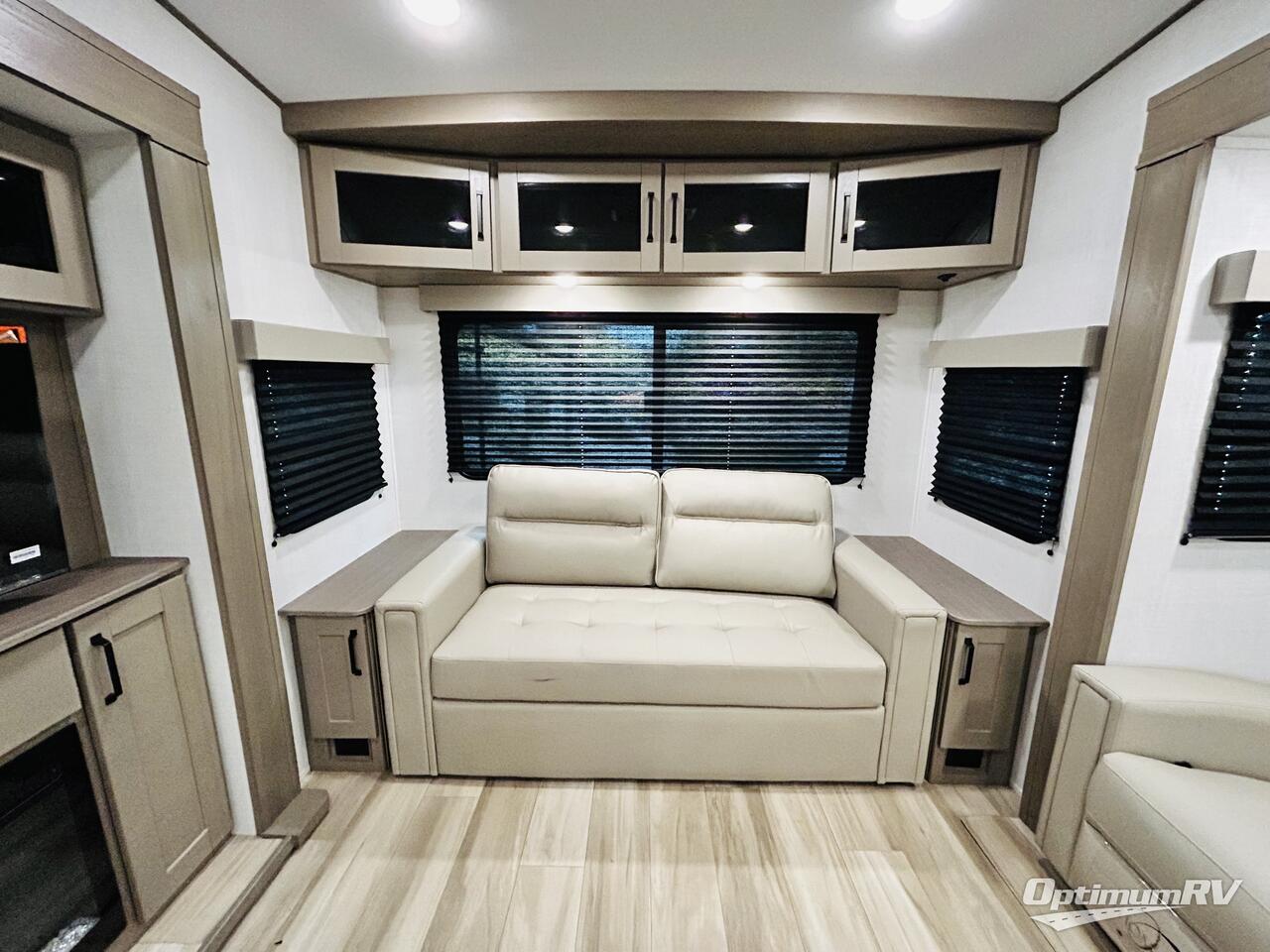 You'll love the amount of space you have in this fifth wheel thanks to the dual opposing slides in the rear living area/kitchen. Your friends and family can relax on the tri-fold sofa or theater seating across from the high-definition 40" LED TV. There is also a booth dinette or you can choose the optional swivel dinette if you prefer that seating. The chef of your group will appreciate having a kitchen island that will provide more counter space, plus there is a hutch with overhead cabinets for nice dishes. A full bath onboard lets you clean up each day and the front private bedroom includes a queen bed just like at home. You'll also love spending time outdoors under the electric awning, and there is an unobstructed pass-thru storage for fishing poles, hiking gear, and camp chairs!