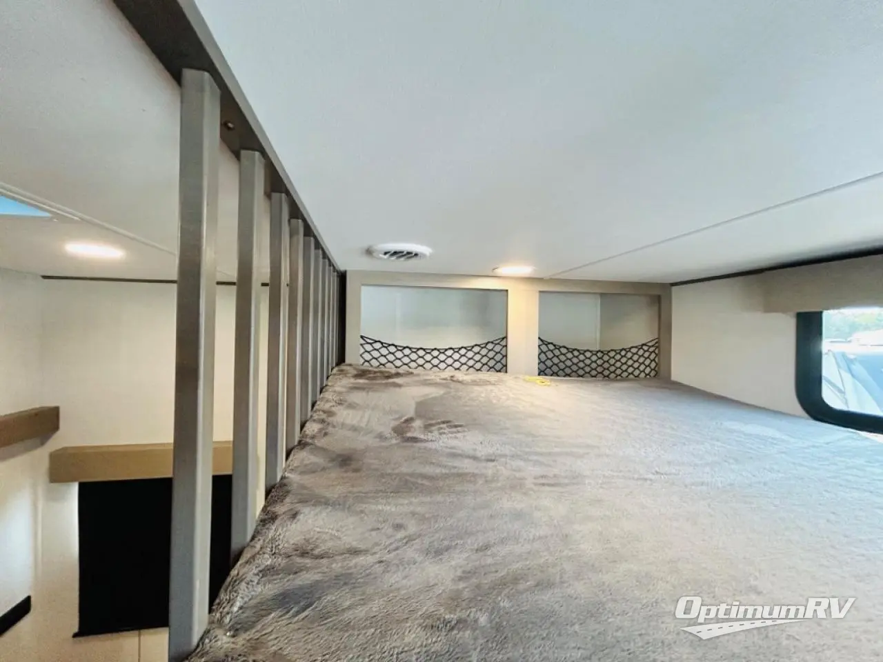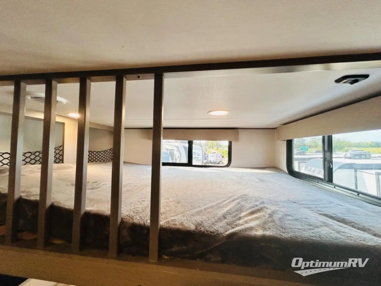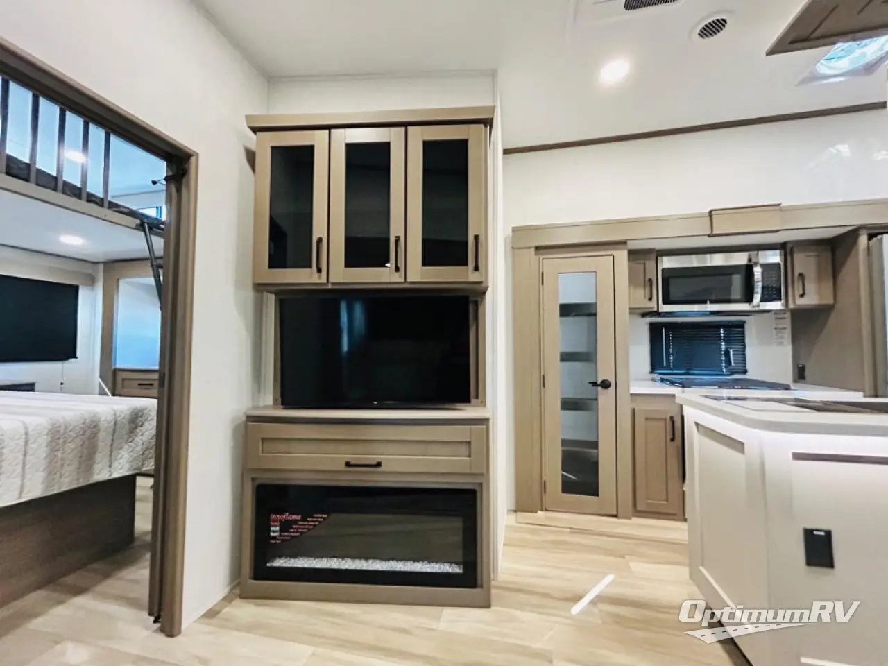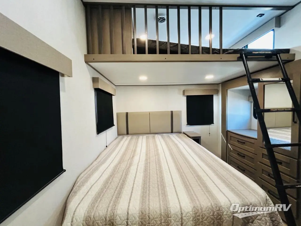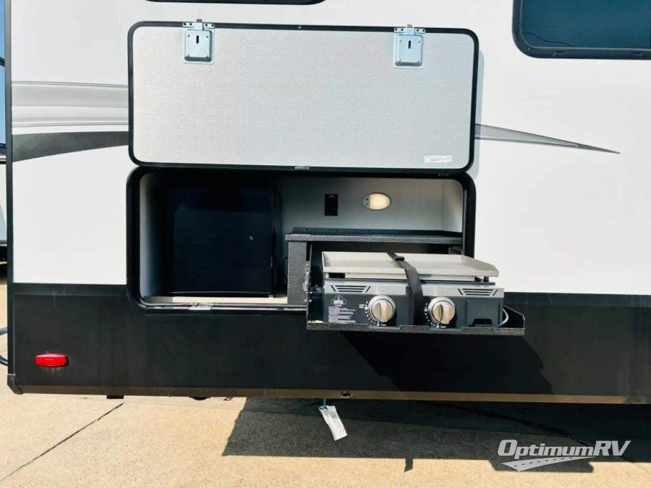 There is a whole lot to love about this fifth wheel! The front private bedroom has a queen bed to lay your head on at night, a slide with drawers and a linen closet, and even an entrance into the dual entry bathroom. The second private bedroom has a 54" x 74" top bed above a queen bed, a slide with a closet and drawers, and its very own half bathroom. The chef will have an easy time preparing delicious home cooked meals with the kitchen island, plus there is an outside kitchen complete with a 4.1 cu. ft. refrigerator to enjoy a cold beverage while you grill on the griddle. Enjoy a relaxing evening indoors either playing games at the booth dinette or on the theater seating across from the entertainment center with a fireplace and 40" TV. You could even switch out the seating for an optional tri-fold sofa or the dinette for an optional free standing dinette!