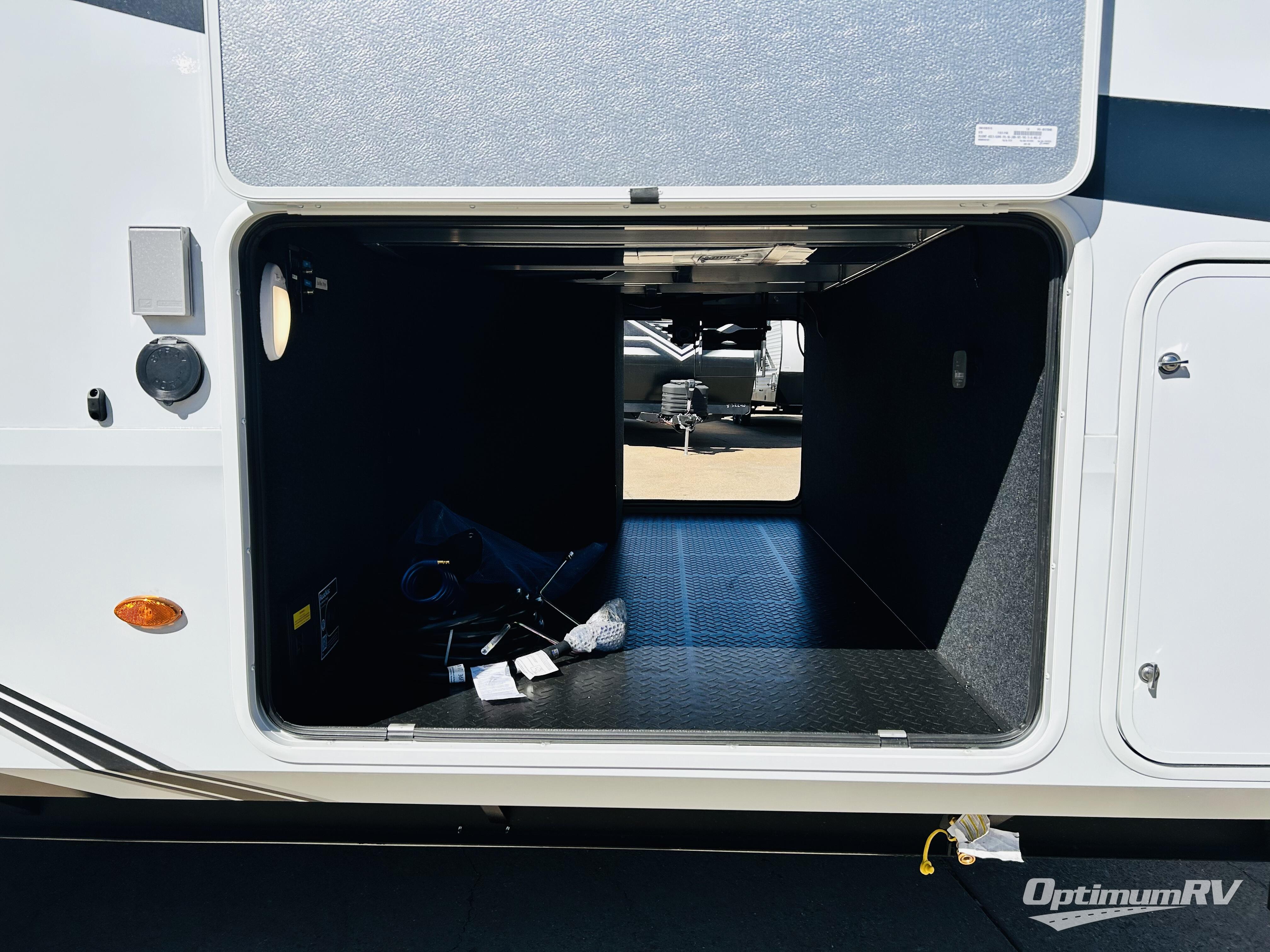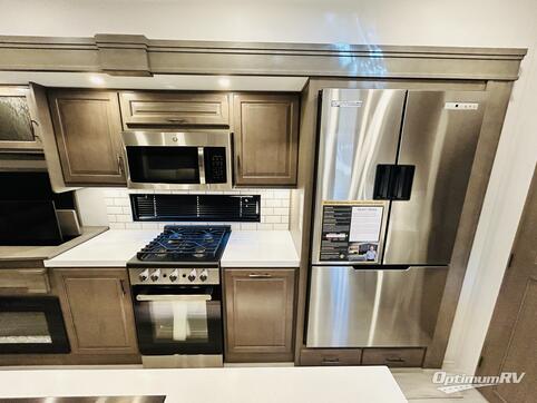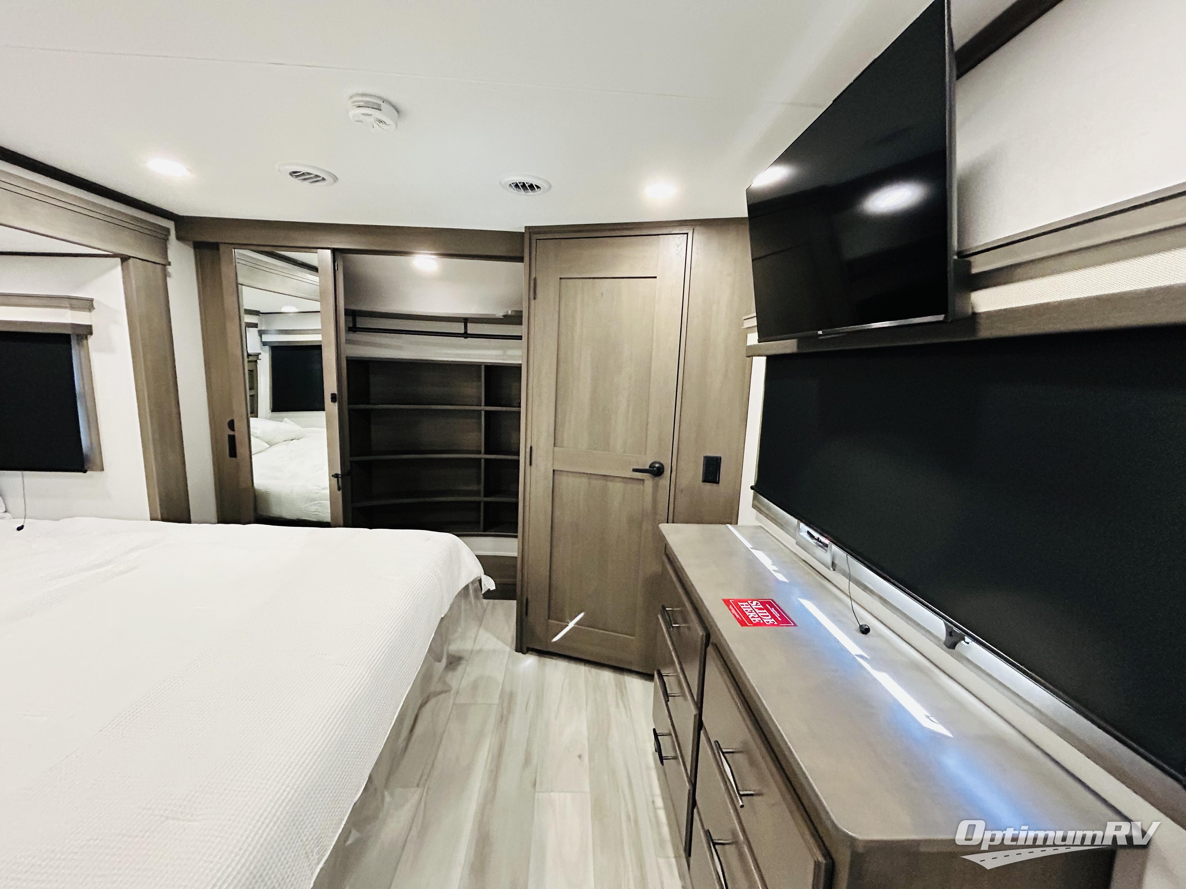 Traveling for long periods at a time is made easy with this gourmet kitchen that can feed your entire group a holiday meal! The professional-grade stainless steel cooktop with a built-in oven, microwave, 12V 20 cu. ft. refrigerator, and a kitchen island offers everything you will need to enjoy cooking for your family and guests. There is abundant storage throughout multiple overhead cabinets, a kitchen pantry and hutch, a bath linen cabinet for your towels, and in the front master bedroom which features a large closet. In the bedroom there is also a queen bed slide for added space to sleep comfortable at night, or you may choose an optional king bed if you enjoy more space. You will also find a closet with washer/dryer prep, large wardrobe, plus a slide top dresser. Two nice awnings will provide outdoor living space keeping you protected from the sun and rain, and you can add an optional pull-out kitchen to enjoy convenient cooking outdoors as well.