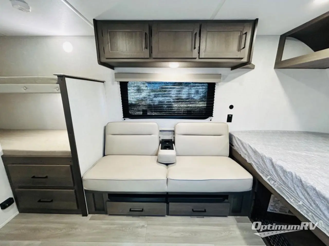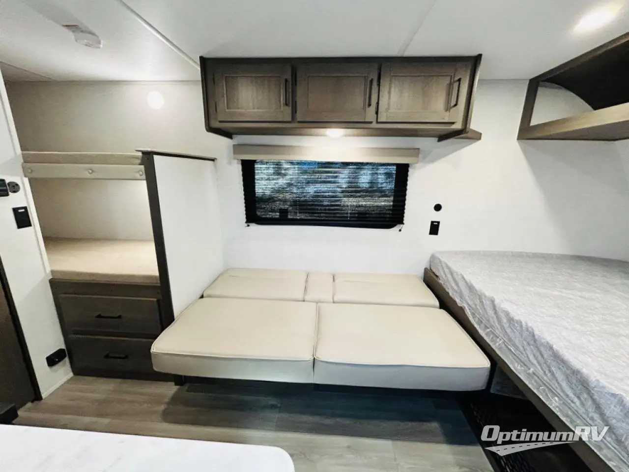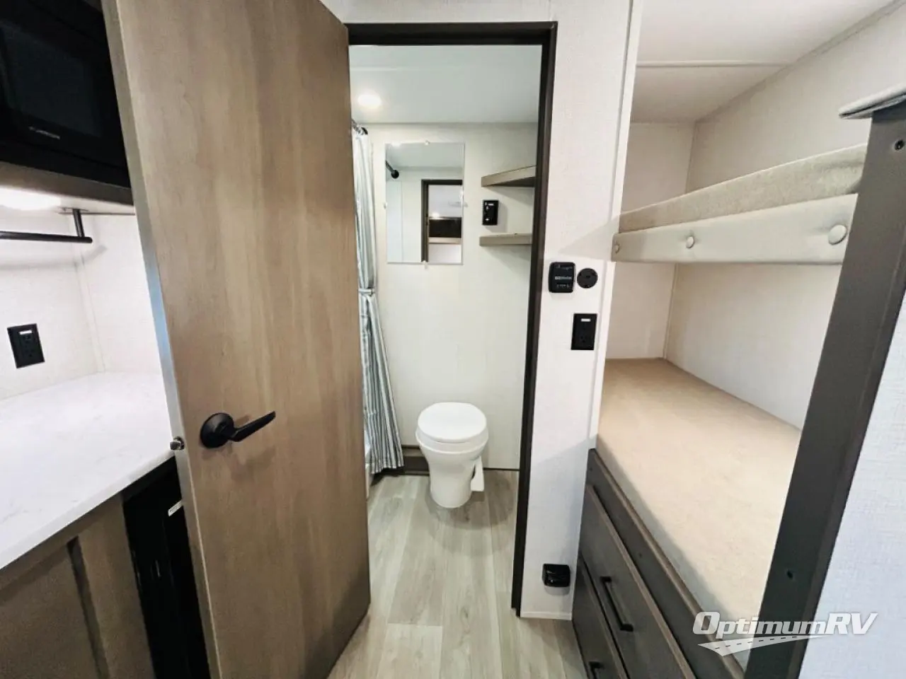 Camping trips to the lake have never been easier than with this travel trailer! The 28" x 67" bunks are right next to the private bath for easy nighttime use, and the front queen bed includes hidden storage for your things. There is also a 66" Jack knife sofa that provides a little more sleeping space for guests. A full kitchen lets you cook meals each day and there is an exterior LP quick connect if you want to fire up your own propane grill.