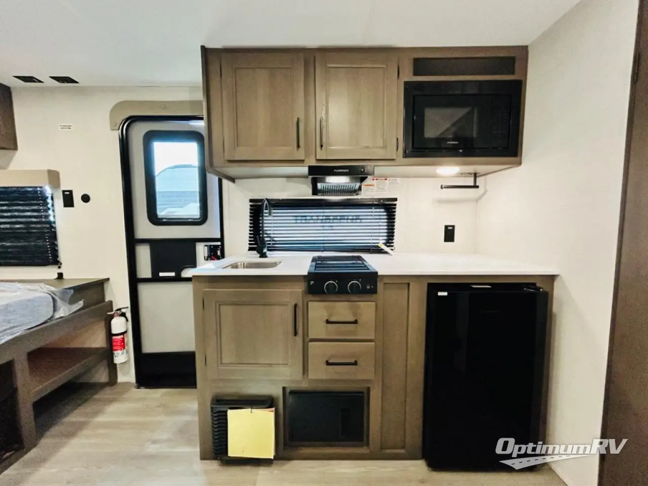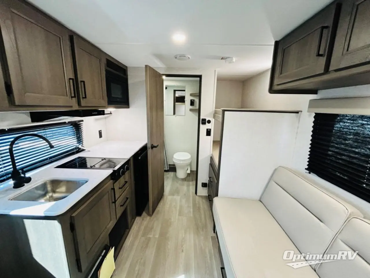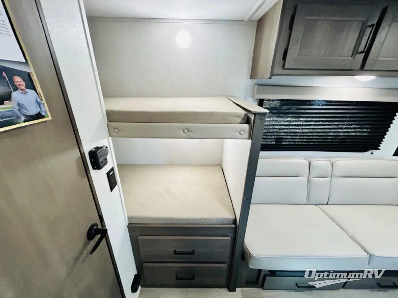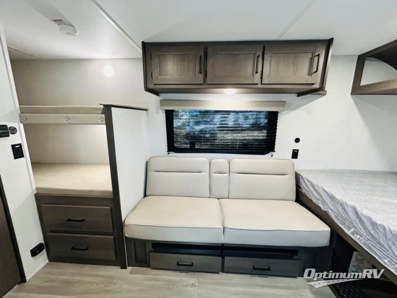 Camping trips to the lake have never been easier than with this travel trailer! The 28" x 67" bunks are right next to the private bath for easy nighttime use, and the front queen bed includes hidden storage for your things. There is also a 66" Jack knife sofa that provides a little more sleeping space for guests. A full kitchen lets you cook meals each day and there is an exterior LP quick connect if you want to fire up your own propane grill.