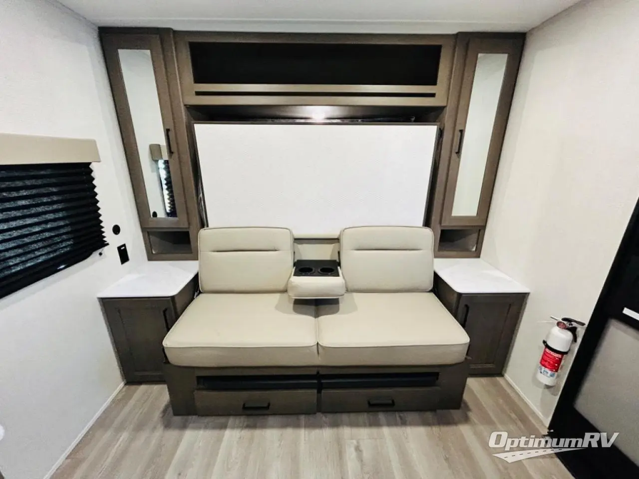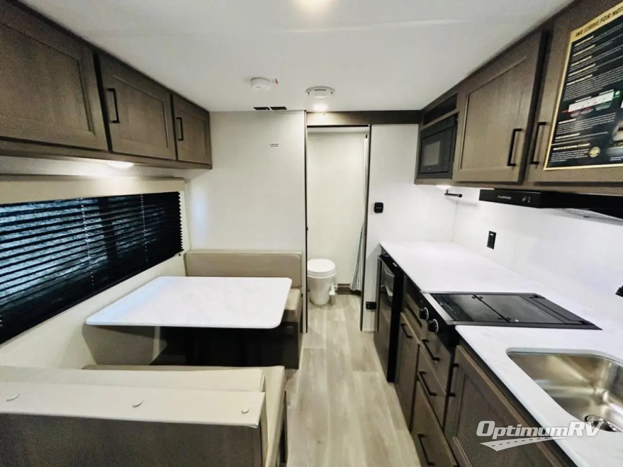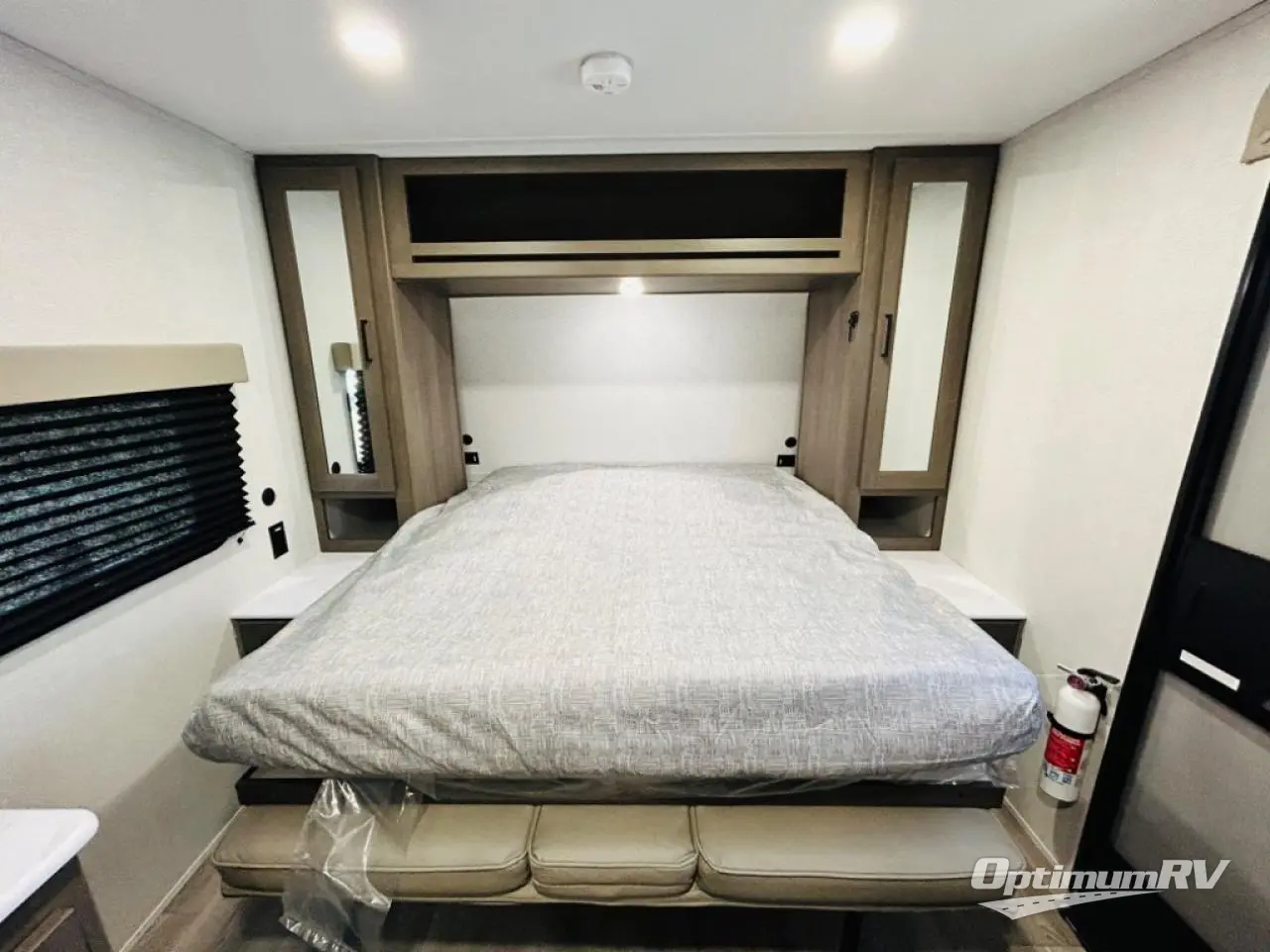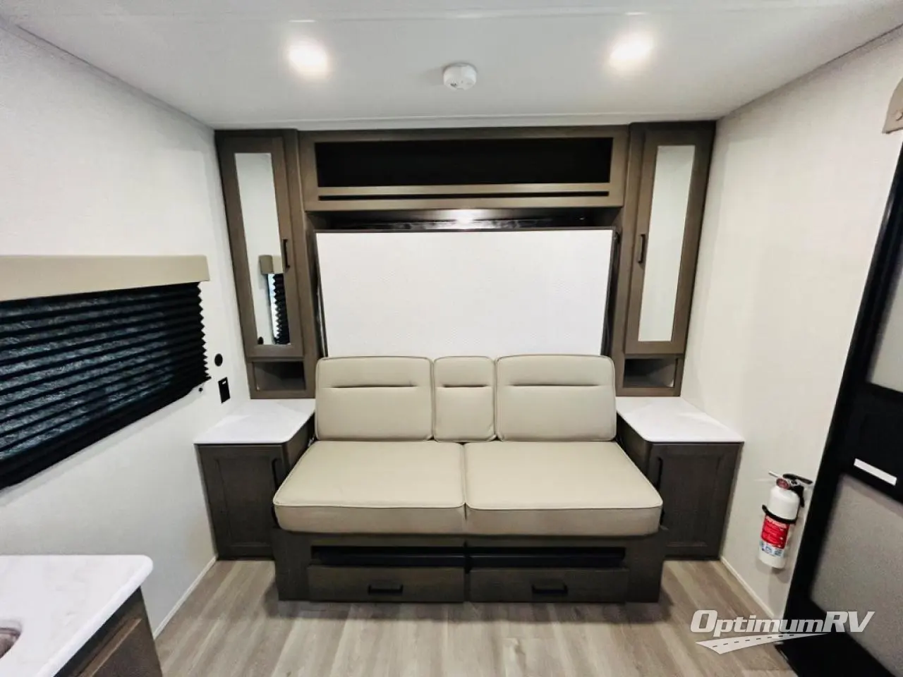 This is the perfect couple's trailer with versatile seating and sleeping space! You'll find a queen-size Murphy bed up front with storage space beside and above plus a full rear bath for added privacy. Once you've made lunch in the full kitchen, you can dine at the booth dinette, or take your plate outdoors to sit under the 10' power awning with an LED light. You'll also find an unobstructed pass-thru storage outside that will be perfect for fishing poles, lawn chairs, tools and more!