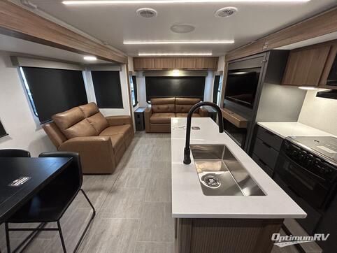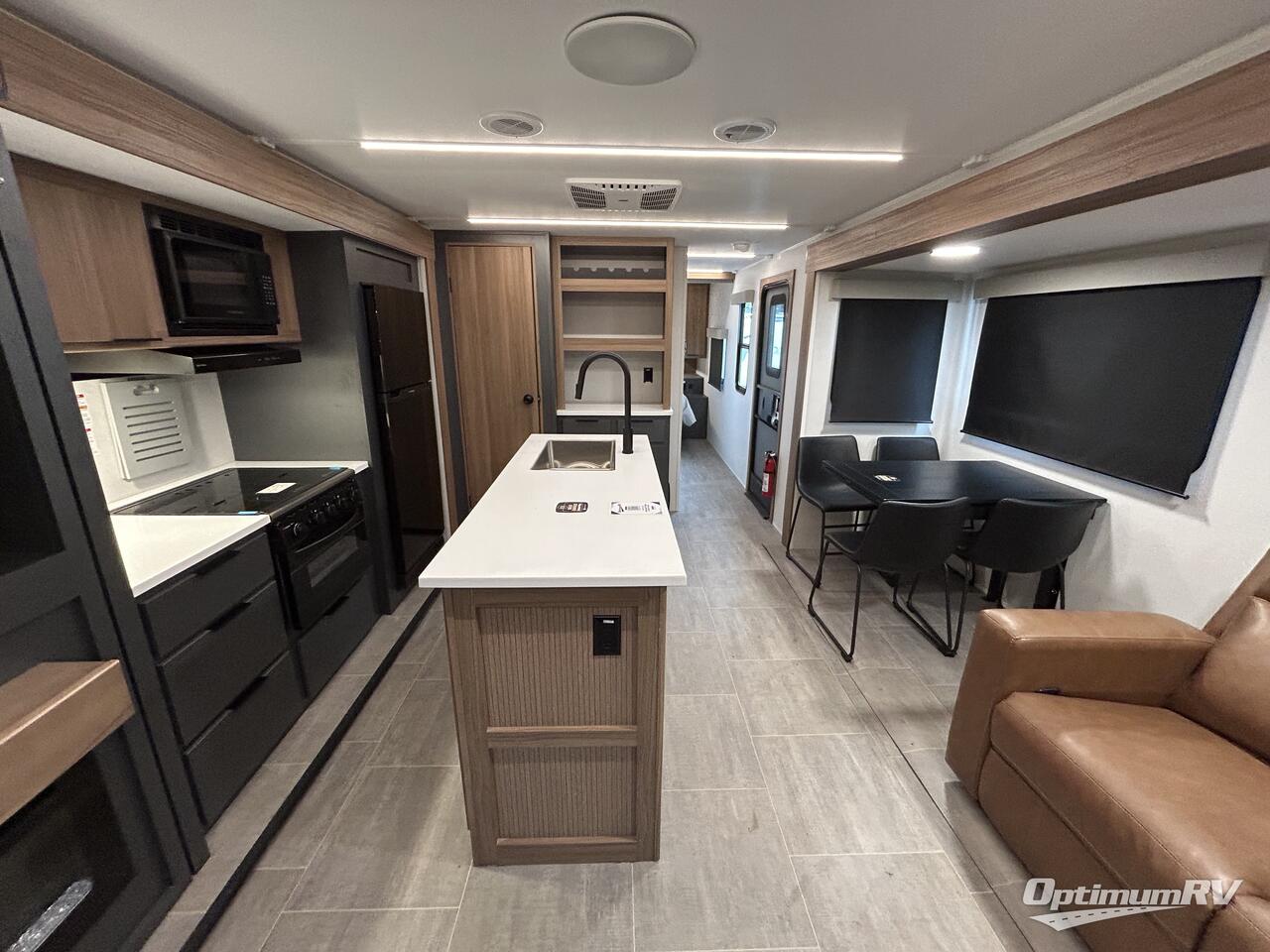 If space is what you're looking for, space is what you'll get in this travel trailer! There are dual opposing slides in the combined kitchen and living room, and the kitchen island will bring the whole room together. This Corterra kitchen includes everything you need to prepare meals each day, including a three burner cooktop and 22" oven, a 10.7 cu. ft. residential refrigerator, and extra counter space to prep each day. Your crew can relax on the two sofas or play a game at the booth dinette, or you may just find yourselves outdoors under the two 11' power awnings. After a day of exploring outdoors, you can freshen up in the full bath, then head to bed in the front private bedroom. Here, you'll enjoy a queen bed, dual closets, plus a dresser/wardrobe to keep everything tidy!
