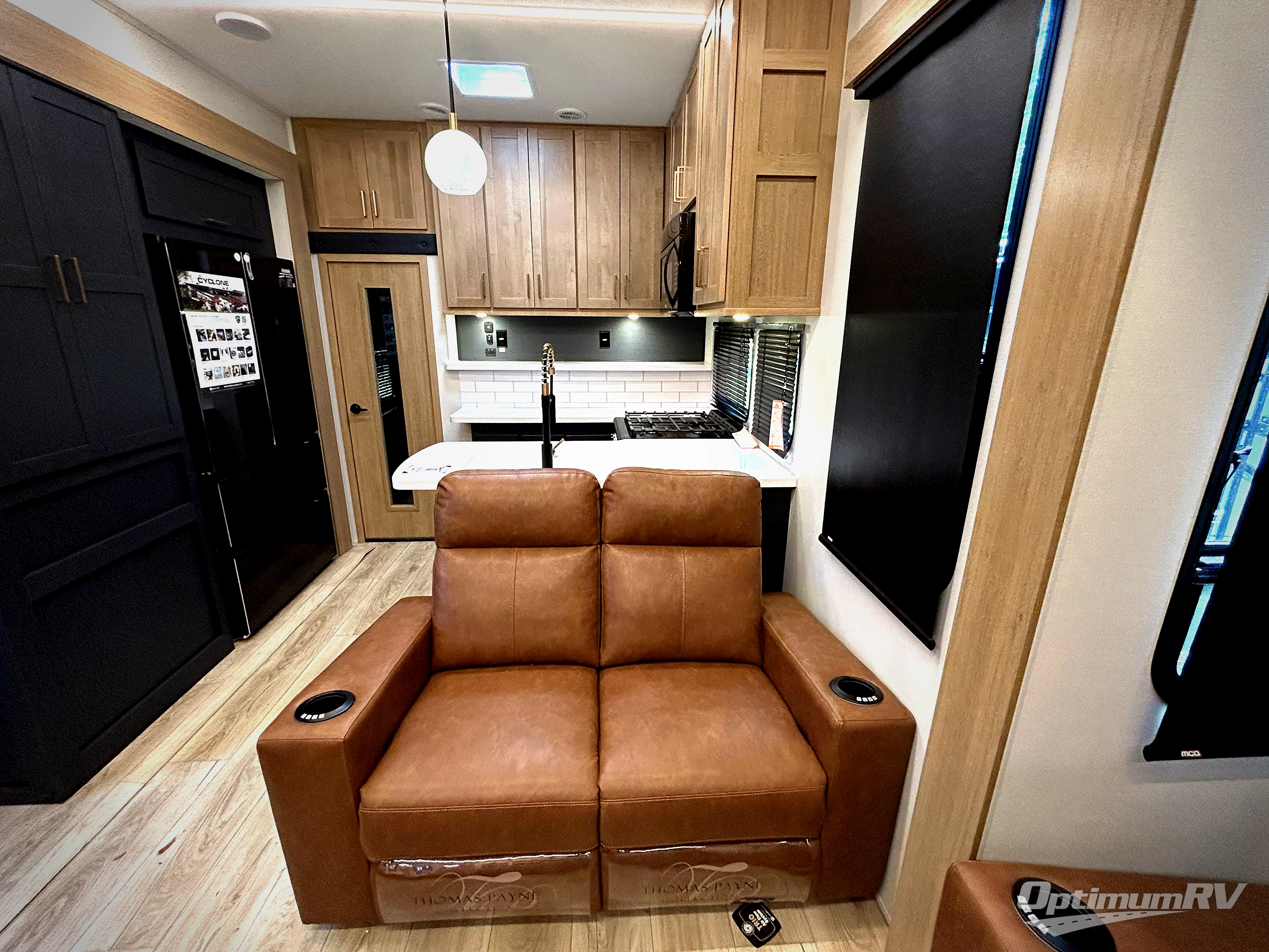 Satisfy your wanderlust with a Heartland Cyclone fifth wheel toy hauler! You won't have to sacrifice any luxury either with indulgent features like the king bedroom suite with an exclusive East to West bed tilt system with 30% more floor space, Stor-Mor three-sided access to the basement with 30% more storage capacity, and Step Caddy folding patio step for better stability as you enter or exit the patio. The industry first Grill and Go 25" residential pull out 3 burner griddle combo comes on models with an exterior kitchen for an easier cooking experience. Full height shaker cabinetry provides 25% more storage space so you can bring more camping necessities with you. If you like to dry camp longer then you will appreciate the industry's largest 150 gallons fresh water tanks. Come find the perfect model for you today!