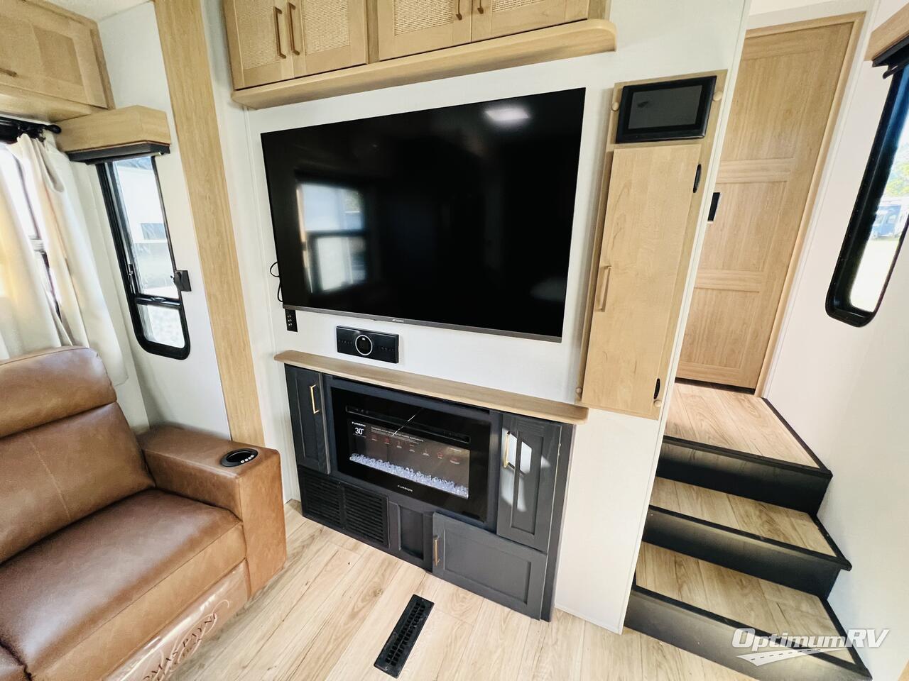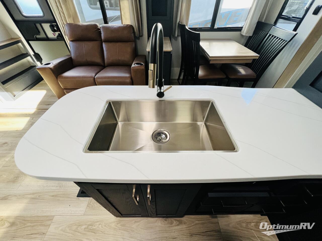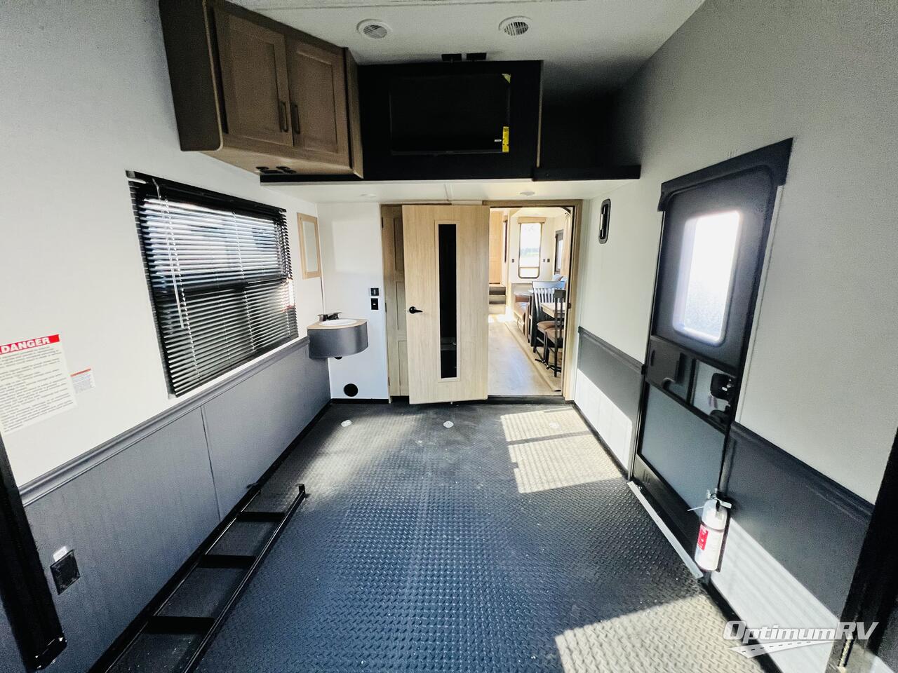 This toy hauler with two full bathrooms is a clean decision! You can prepare delicious home cooked meals for everyone in the fully equipped kitchen with island peninsula for plenty of prepping space, plus there is a hutch to store your dishes. The garage has a bathroom with a neo-angled shower so mud doesn't get tracked throughout the rest of the unit and two loft areas for extra sleeping space. With two awnings, you are sure to stay protected rain or shine and one of the awnings even protects the Grill N Go three burner griddle combo. Enjoy a good night's rest on the tilting king bed slide, keep your clothes looking their best with the front wardrobe, and the washer and dryer prep give you the option to make laundry day easier than ever. You will also have quick access into the dual entry bath!