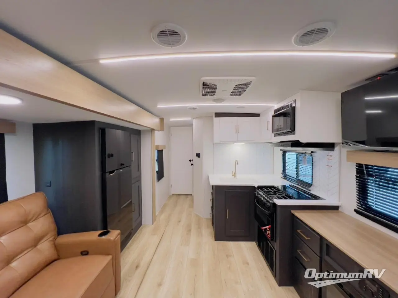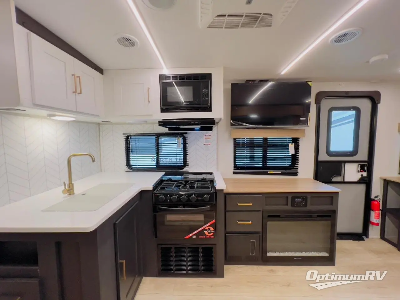 You and your spouse will love camping in this travel trailer! It features a front private bedroom with a king bed to lay your head on at night. Freshen up each morning in the full bathroom with a shower that has a skylight above to bring the outdoors inside. The chef can prepare their best home cooked meals with the three burner cooktop, conventional oven, and 10.7 cu. ft. 12V refrigerator. Enjoy all of your meals and play games at the rear U-shaped dinette, plus it can transform into an extra sleeping space for an extra guest or two depending on their size. With theater seating and an entertainment center with a fireplace, you can have a truly relaxing evening indoors!