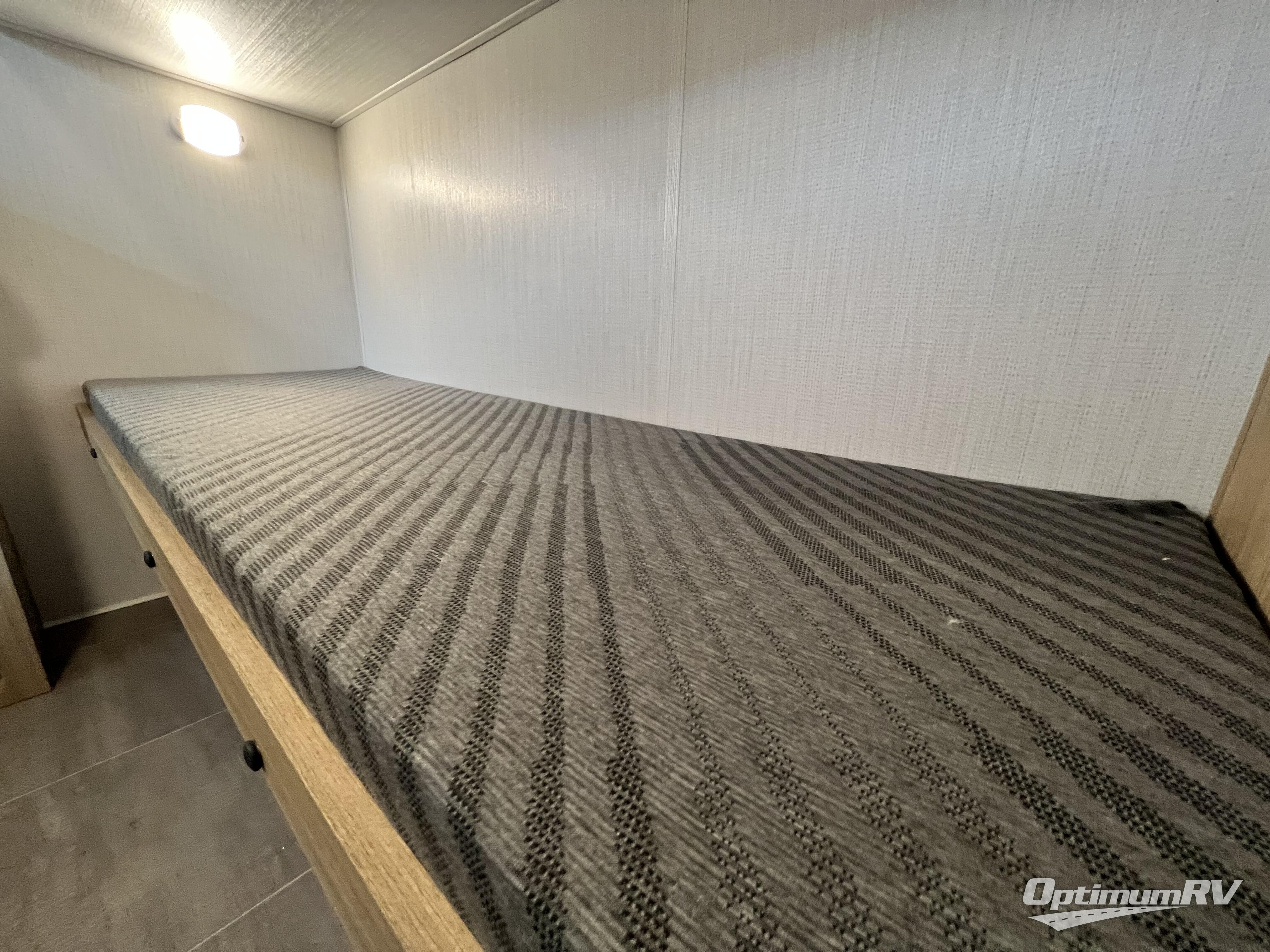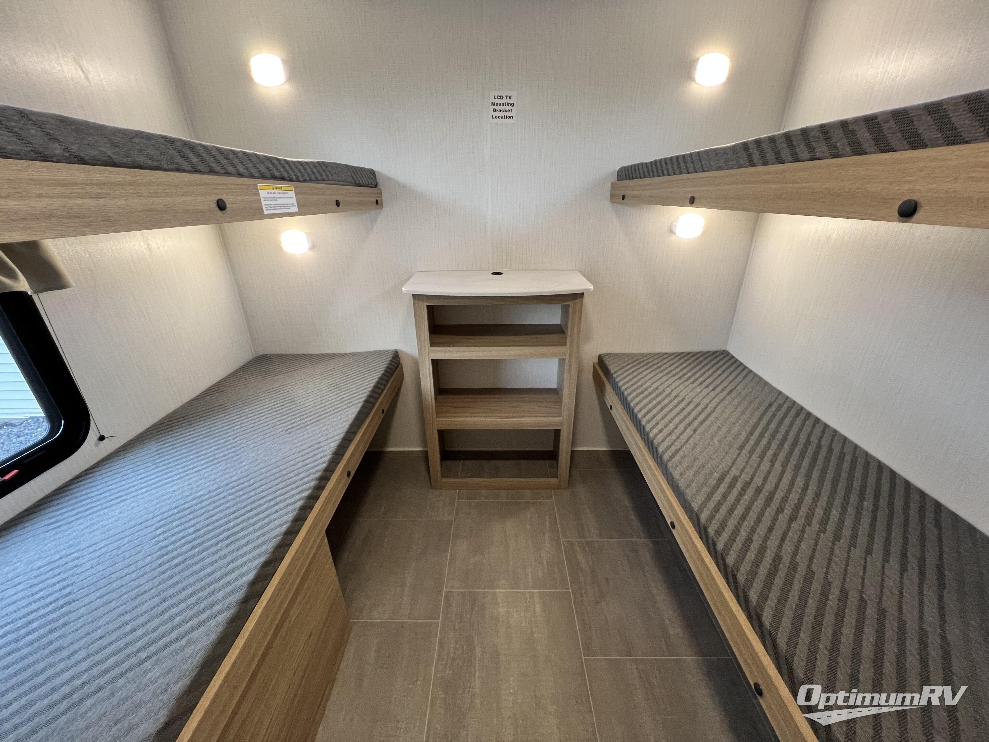 The littles ones will love camping in this travel trailer since there is a rear private bunkhouse with four bunks, a wardrobe, plus shelves to keep their things tidy. A full kitchen, complete with a cooktop, microwave, and 12V refrigerator will let you cook and store food, and a booth dinette provides a place to dine together. There is also a sofa where you can relax in the evenings if you're not outdoors under the 17' power awning. And when it's time to call it a night, you can head to the front private bedroom for a great night's rest on the queen bed!