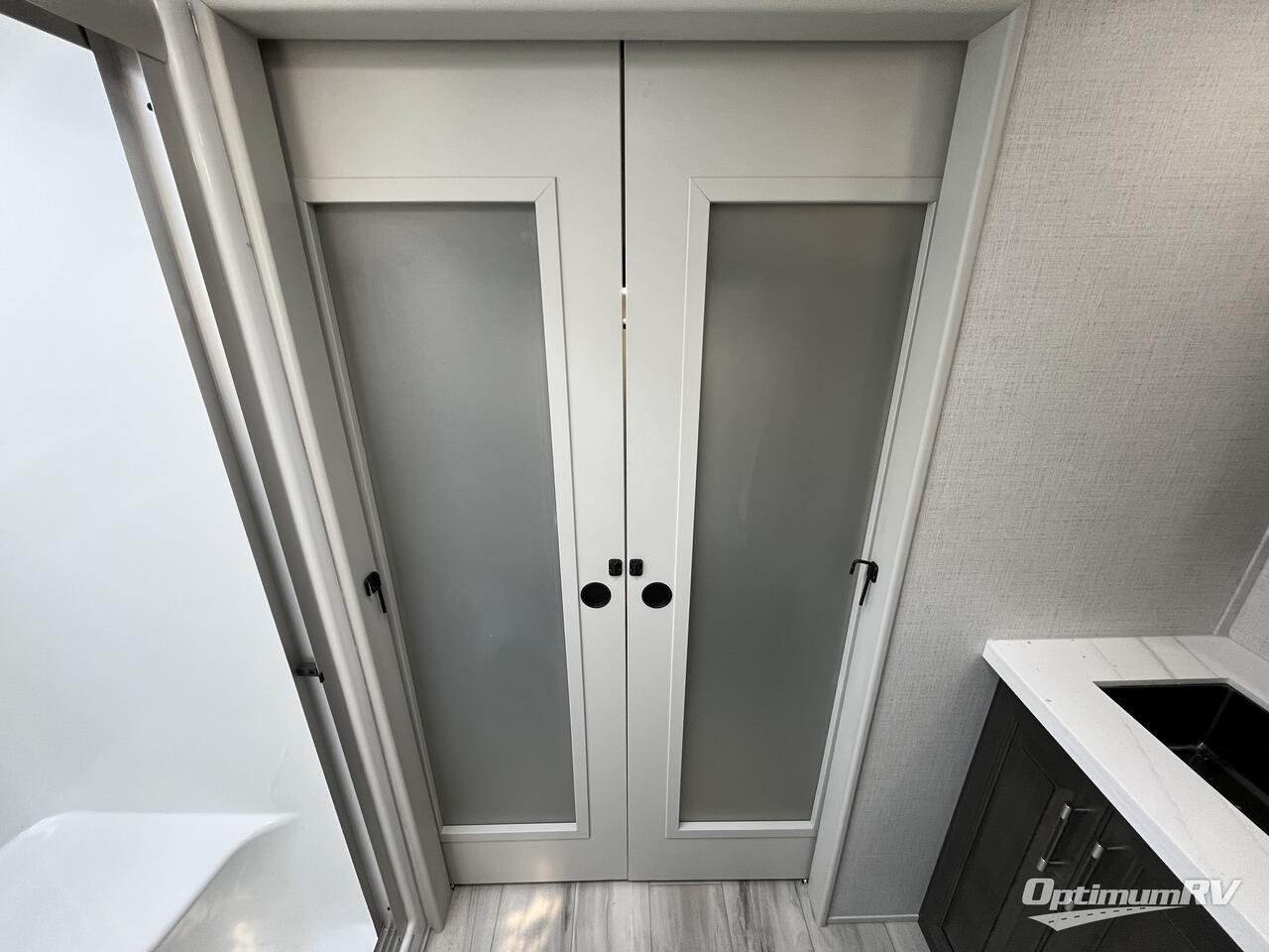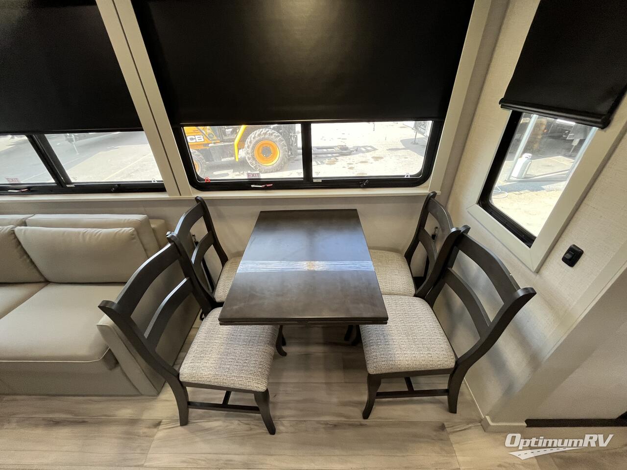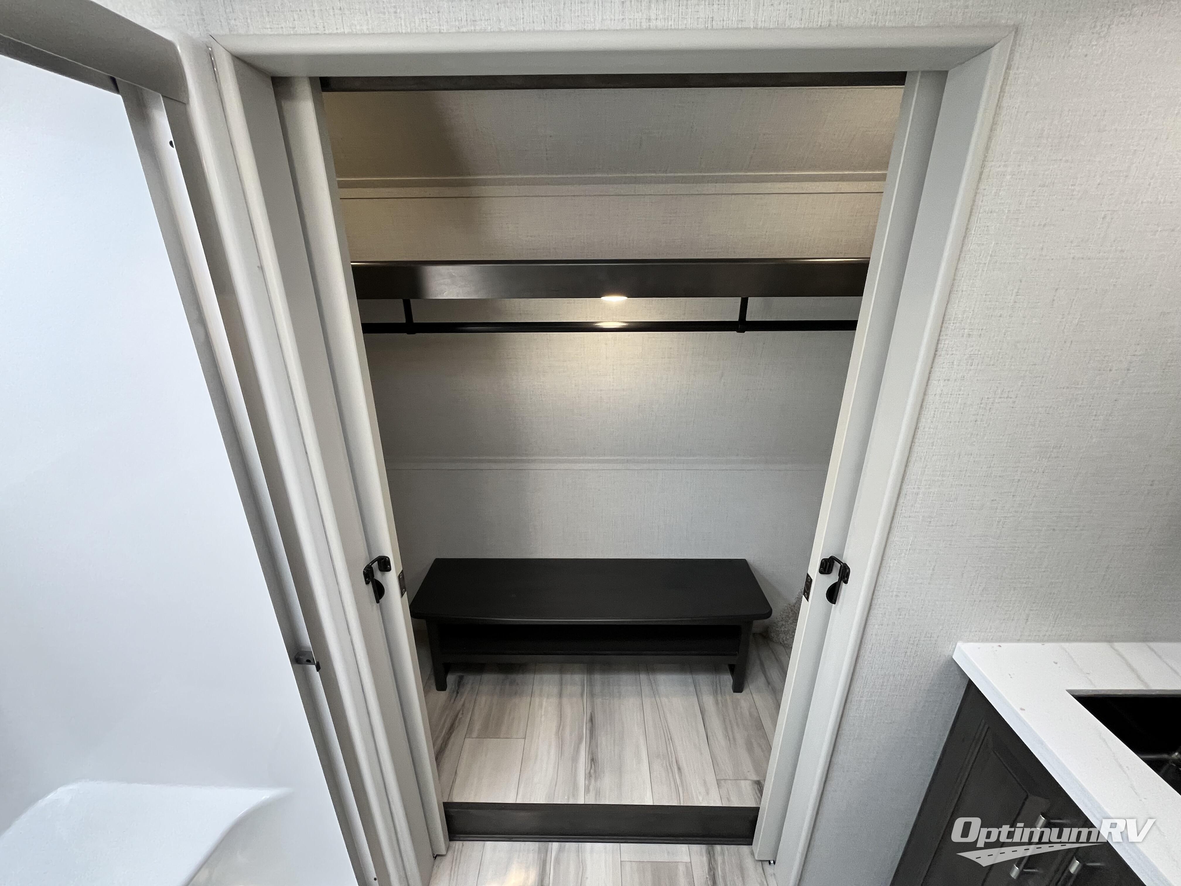 With a bath and a half, it's a clean decision to take this fifth wheel with you on your next camping trip! One of the dual entry doors leads directly into the rear kitchen which has a large pantry and an 18 cu. ft. residential refrigerator to store your food items. The free standing dinette and tri-fold sofa sleeper slide and opposing tri-fold sofa sleeper slide opens up the middle living area for more interior space. The half bathroom is conveniently located straight in through the main entry and features washer and dryer prep for clean clothes throughout your entire trip. The master suite not only has a king bed slide with storage underneath and a bench next to a dresser, but also access into the front full bathroom which has a dual sink vanity, a shower with a seat, and a toilet with privacy walls!