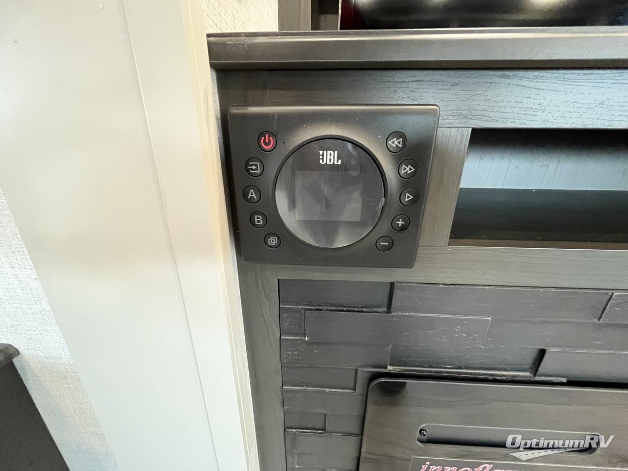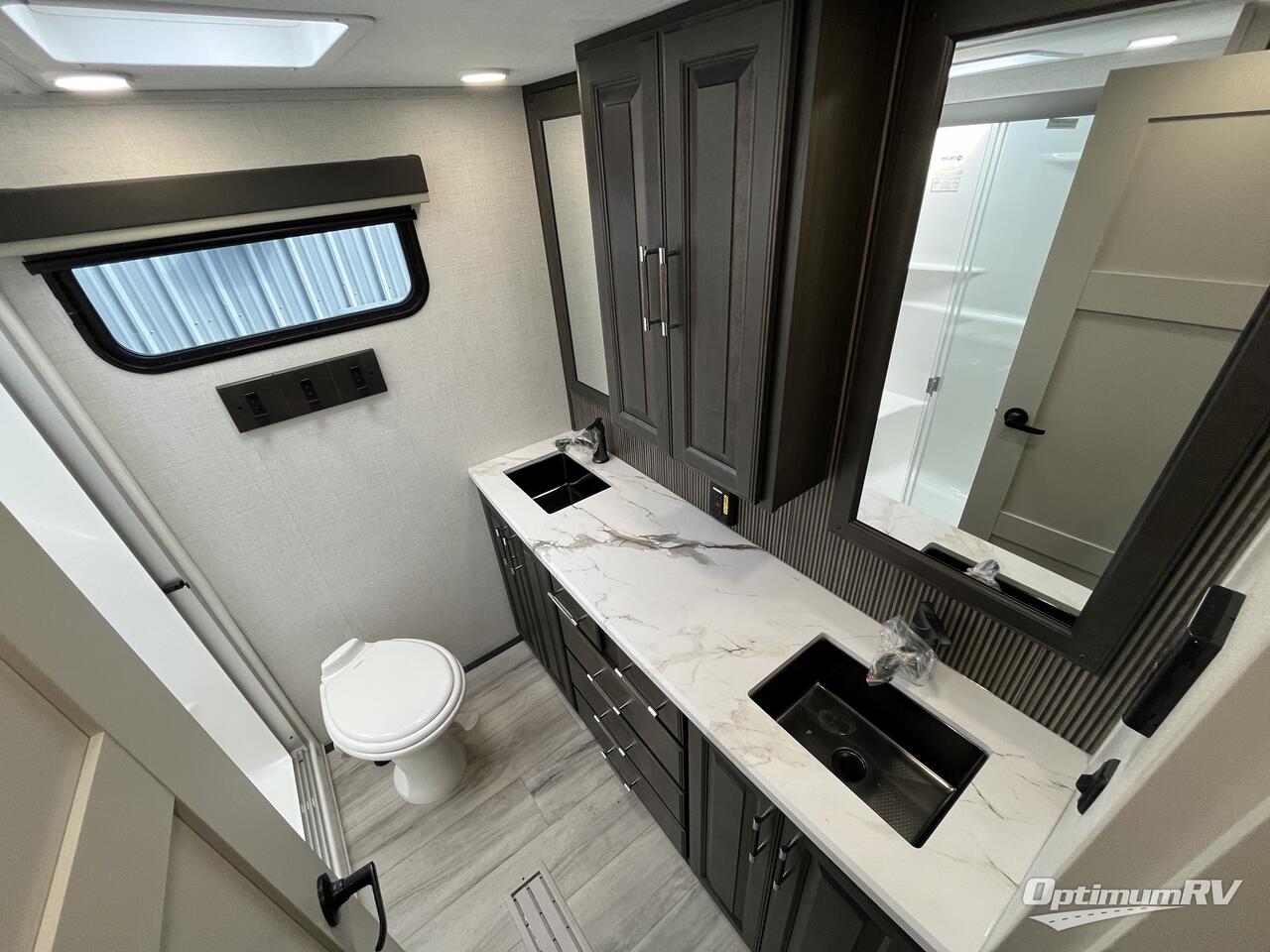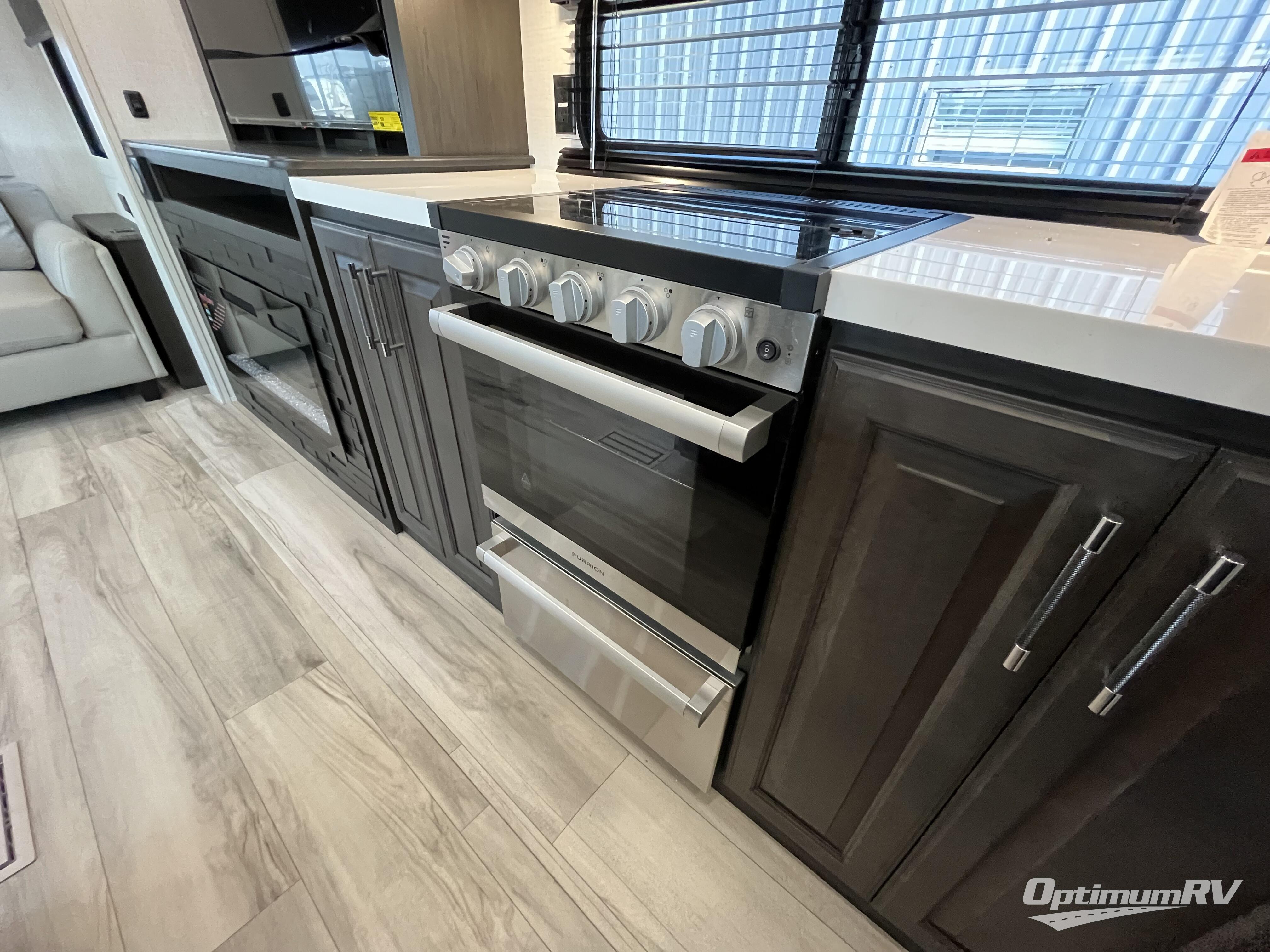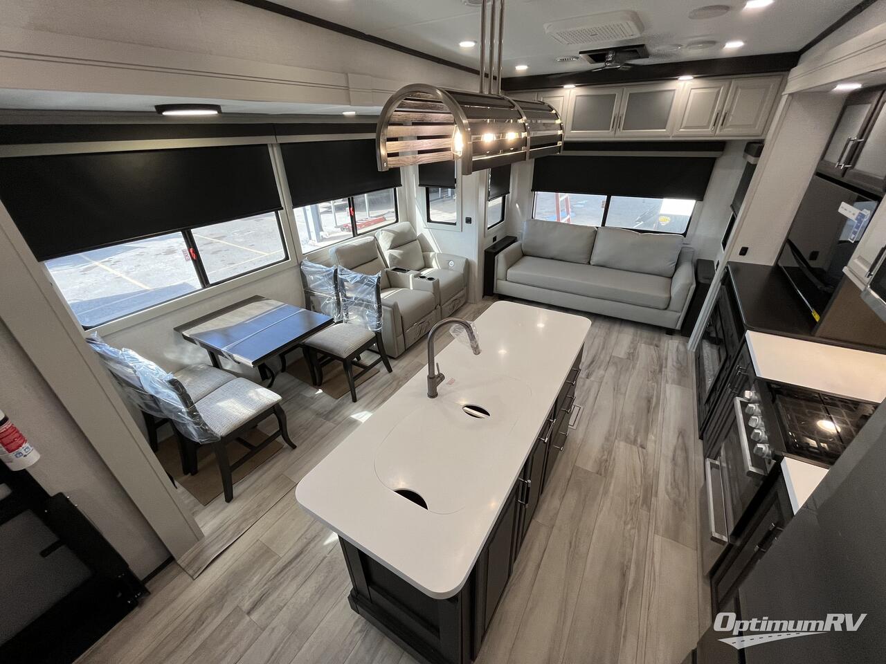 For the couple that loves to travel, you will truly enjoy this spacious fifth wheel featuring triple slides with dual opposing in the main combined kitchen and living area. Here you can entertain friends, even overnight, thanks to the hide-a-bed sofa sleeper. A free standing dinette and four chairs makes dining feel like home, and you will love the spacious kitchen for cooking with a large center island including prep space next to the double sink. A side hutch offers space for dishes, or place for other small appliances to be left out. The master bedroom is just beyond the spacious bath on your left up the steps and behind a space saving sliding barn style door. You will sleep comfortably on the king bed that slides out to provide even more floor space for getting dressed, and there is also a prepped area for adding a stackable washer and dryer if you choose. The bath provides a large shower and vanity with dual sinks so two can easily get ready at once!