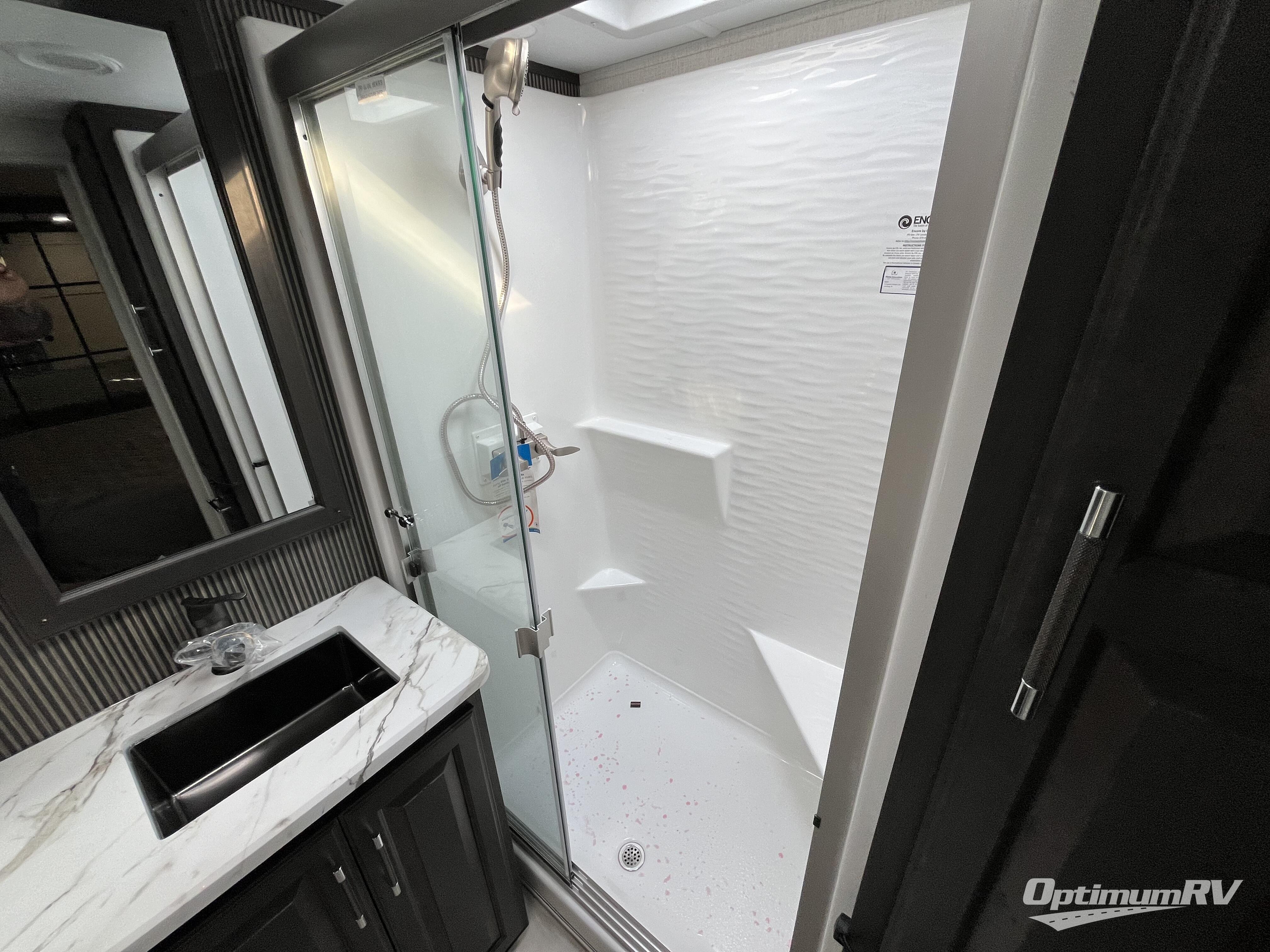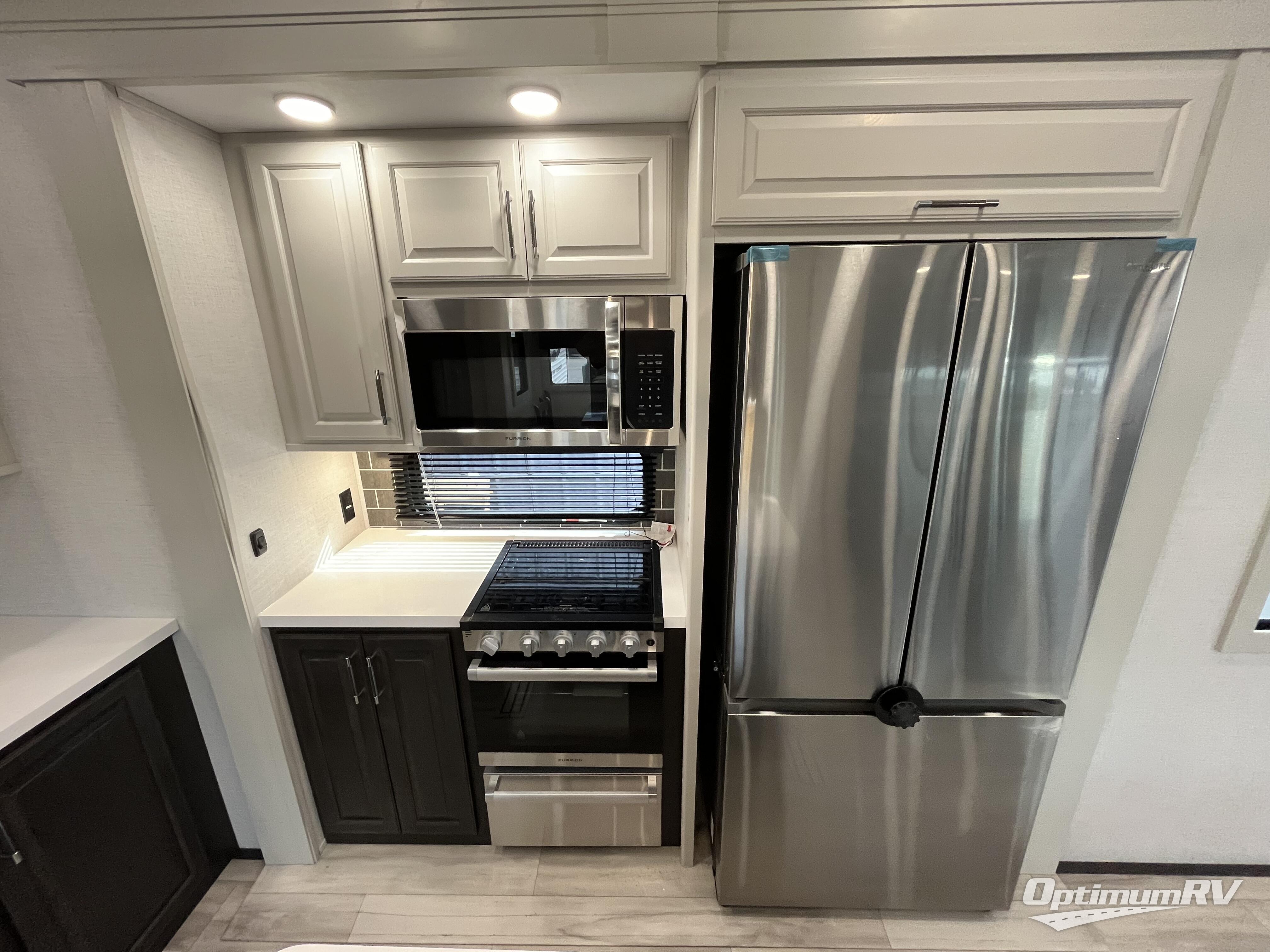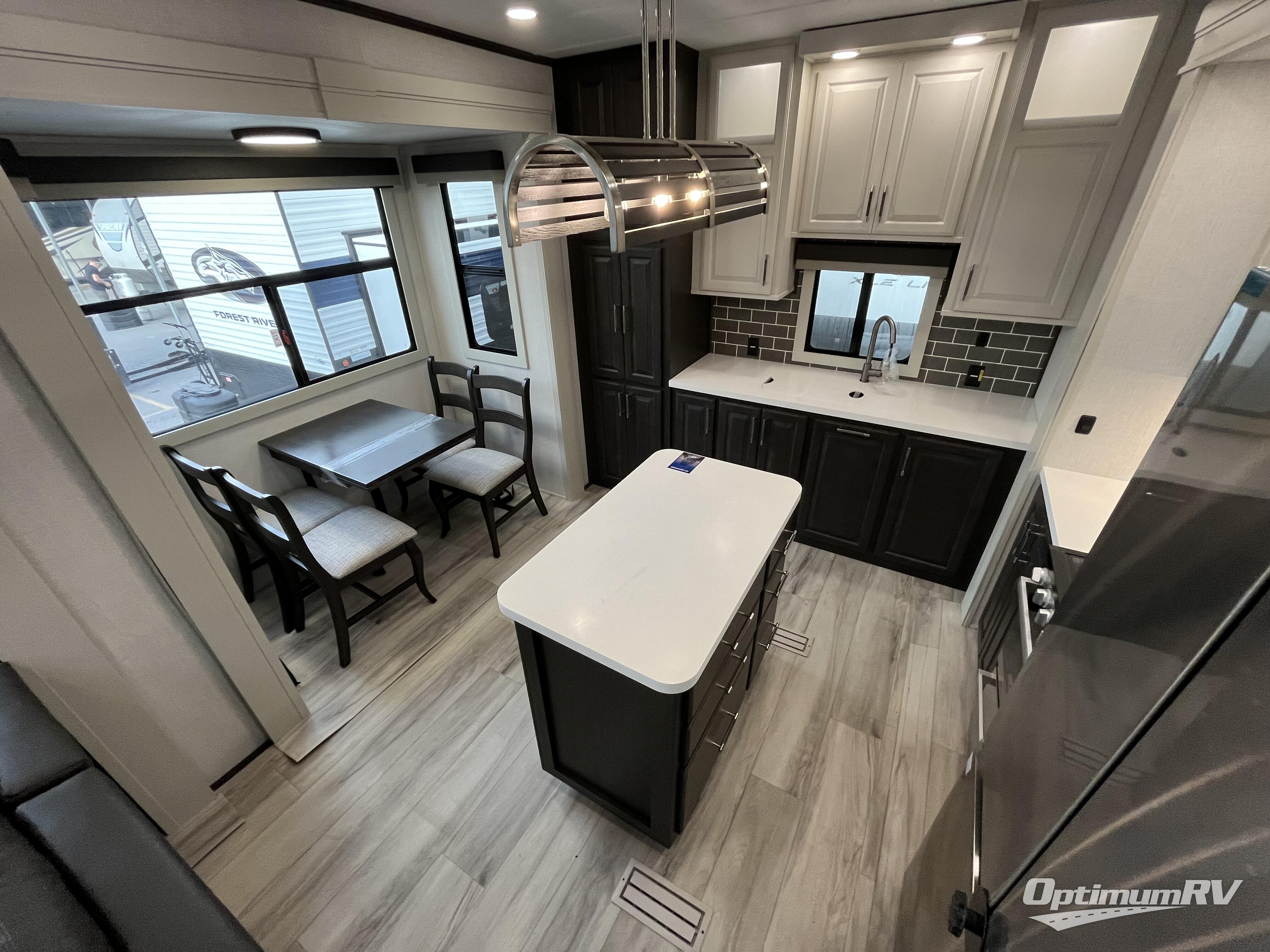 This rear kitchen fifth wheel makes extended stays or weekend trips to the lake enjoyable! The chef of your group will find plenty of counter space with the included kitchen island, plus there is a pantry and 18 cu. ft. residential refrigerator for food storage. A free-standing dinette provides a place to dine together, and the largest L-shaped sofa with recliners will be the perfect spot to relax with a movie. If you have guests, they could sleep here or on the hide-a-bed sofa sleeper. The dual entry bath includes a shower with a seat for added comfort, and the front master bedroom will feel just like home with its king bed slide out and master closet. There is also a dresser and stackable washer and dryer prep if you want to add those appliances!