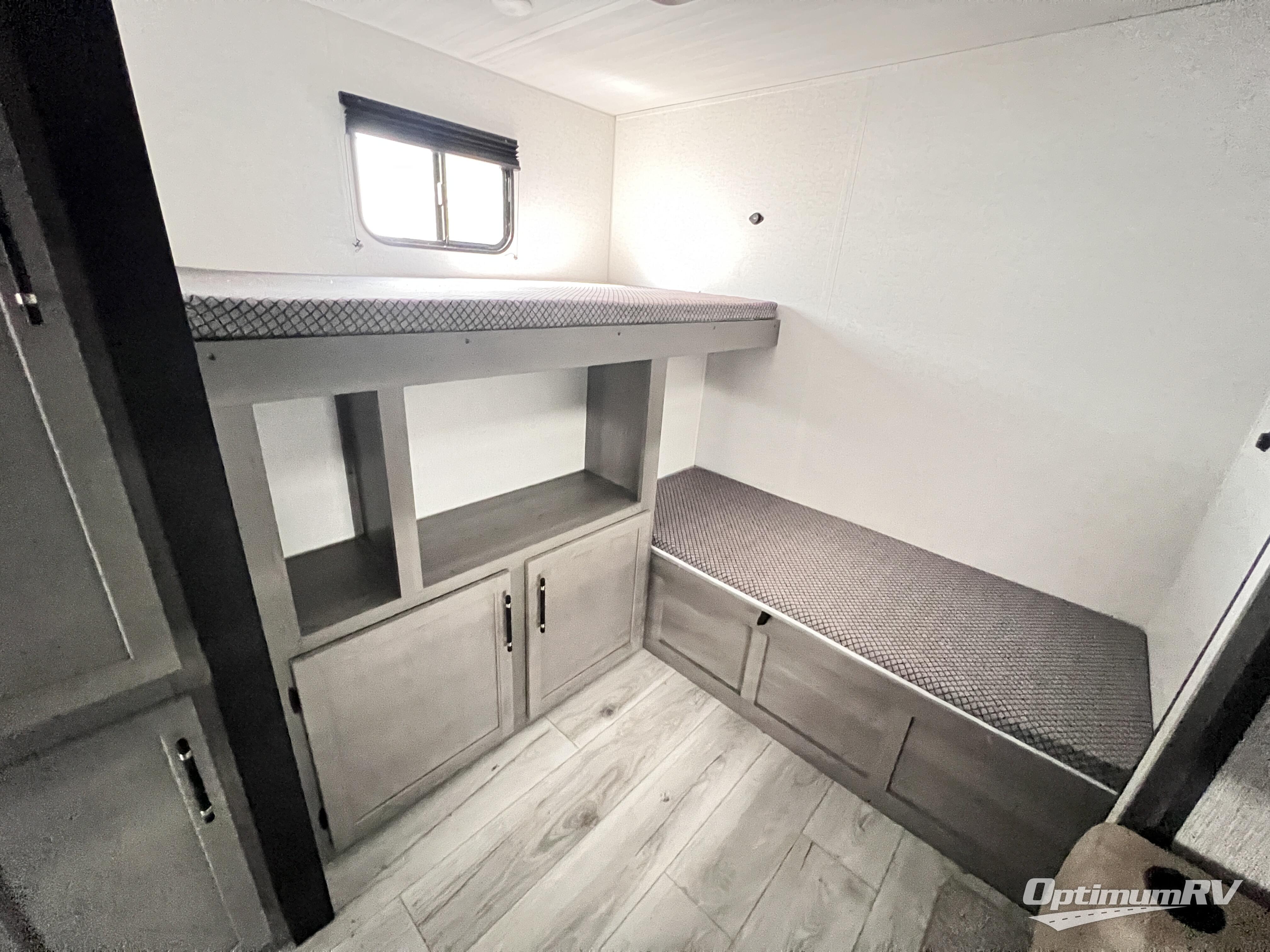 You will be quite impressed by the large private bunkhouse on this Hideout travel trailer! This bunkhouse has a slide out for more space, two bunks, a flip-up bunk, plus a toy chest to keep everything tidy. Now your kids can play all day and store their toys when it's time for bed. The full bathroom is located right next to the bunkhouse for easy access at night, and the bathroom also contains the second exterior entry door. The main living area is full of great features as well with a large slide, a standard sofa, and a booth dinette. And you can choose the optional tri-fold sofa or optional theater seating in place of the standard sofa, depending on your needs.