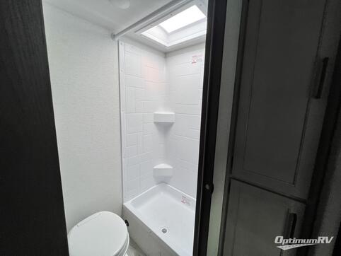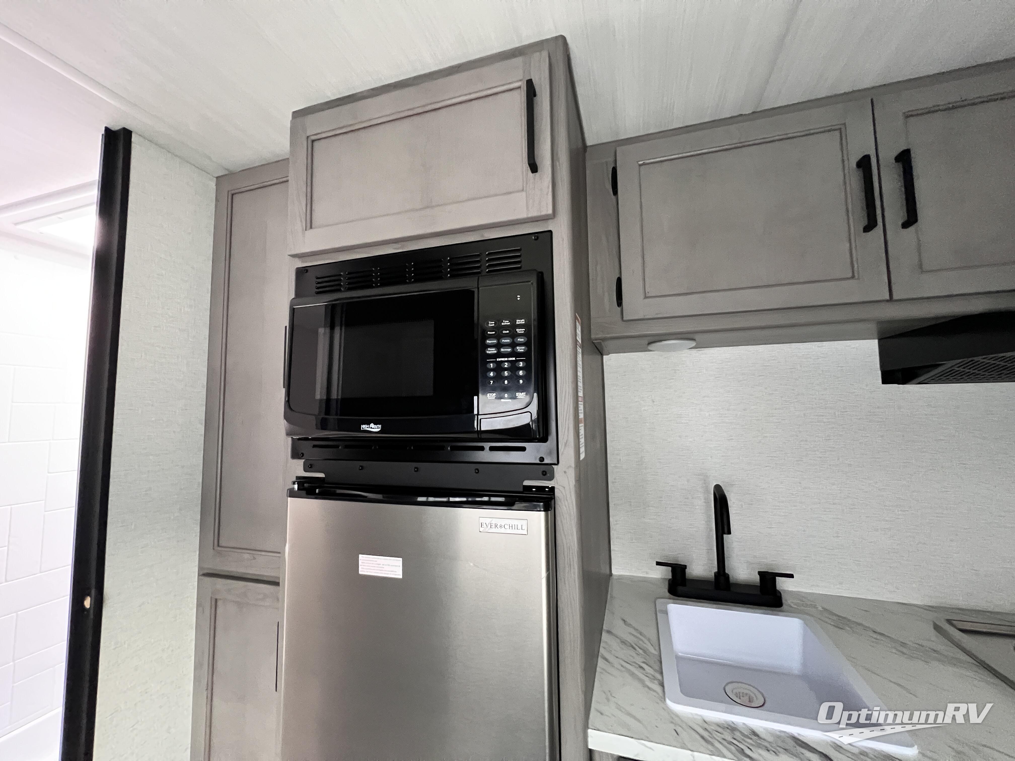 You'll love how versatile this travel trailer is since you can sleep on the Murphy bed at night and enjoy the fold-down sofa during the day! There are dual wardrobes and nightstands on either side of the bed for your things, and larger camp gear can go outside in the pass-thru storage. A full kitchen with a two burner cooktop and 3.3 cu. ft. 12V refrigerator will let the chef whip up their best meals, and the desk area with two chairs provides a place to dine and work. And don't overlook the spacious full rear bath!