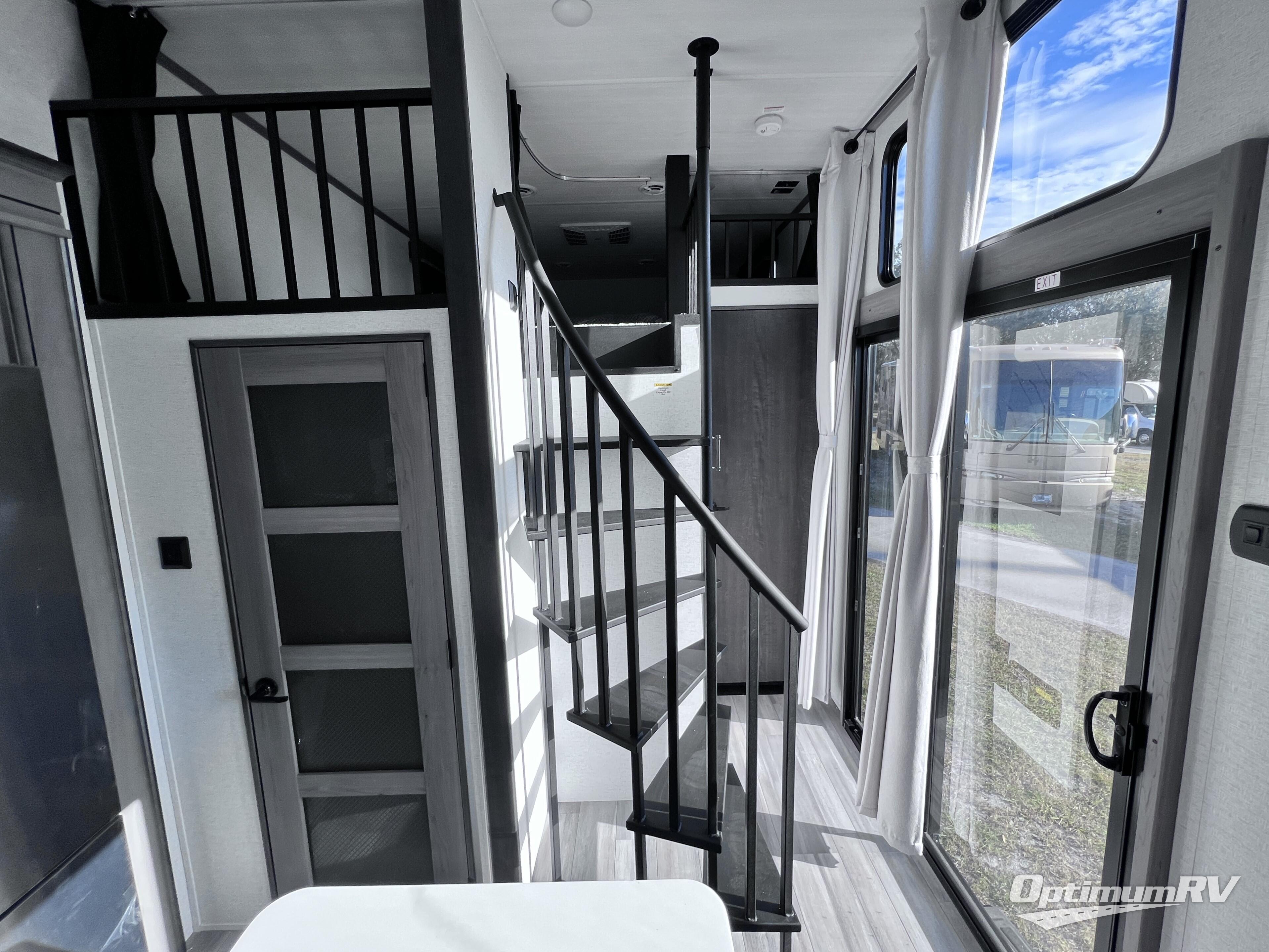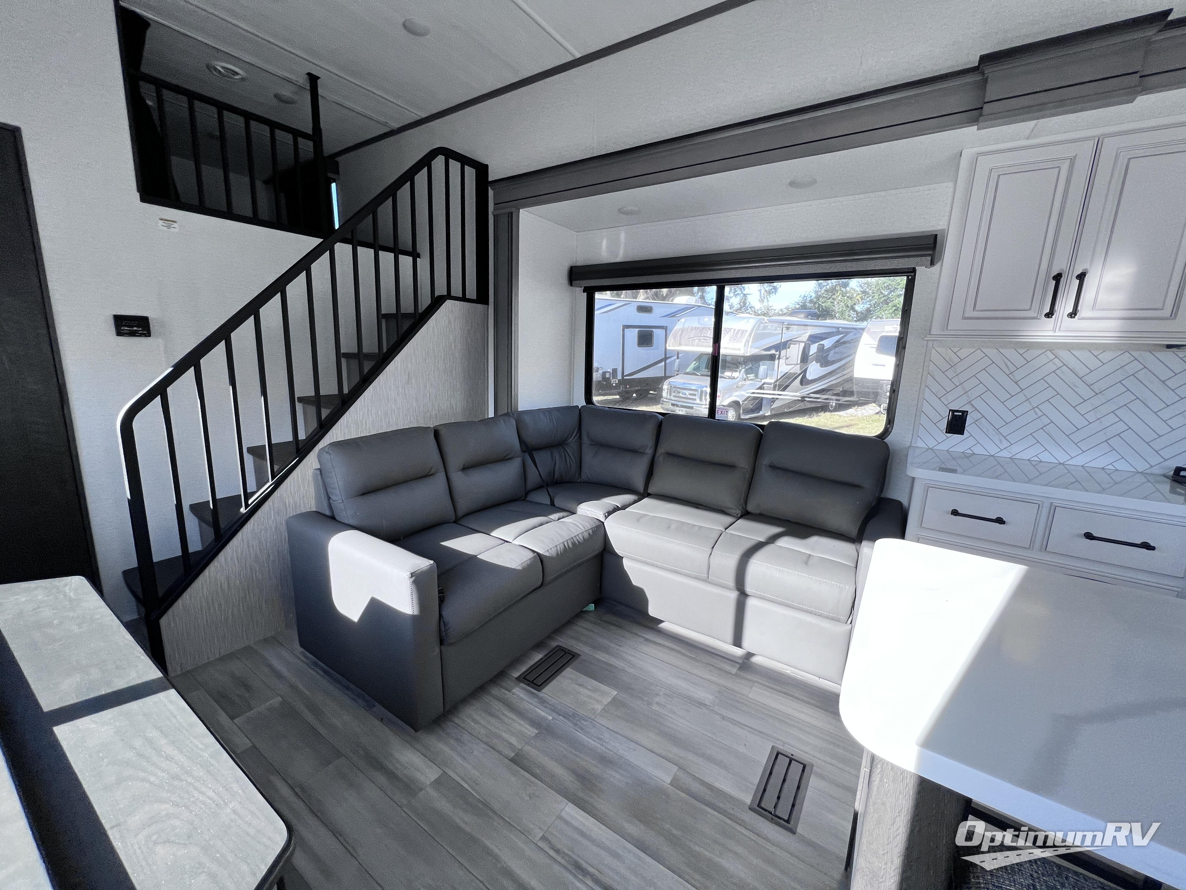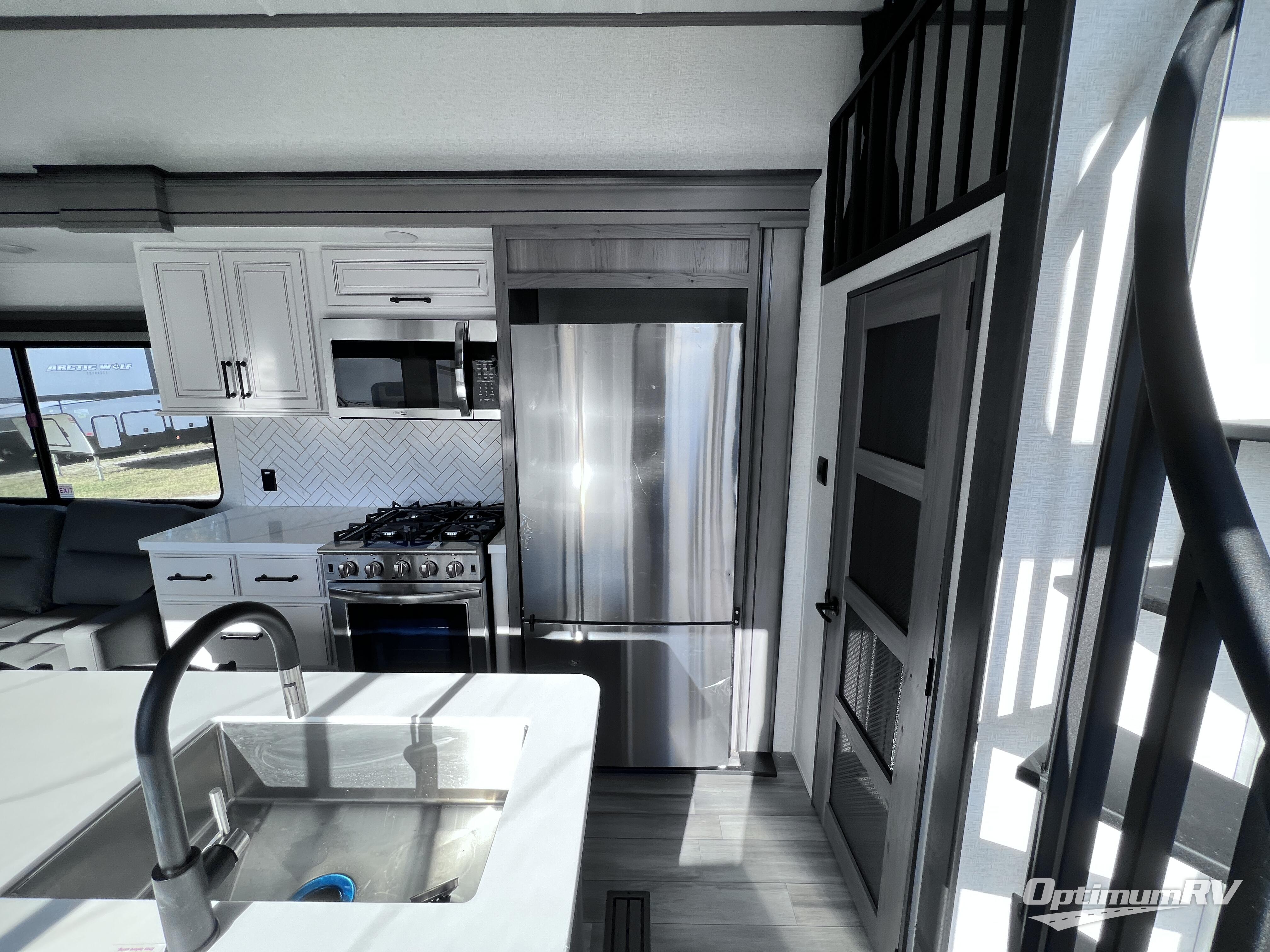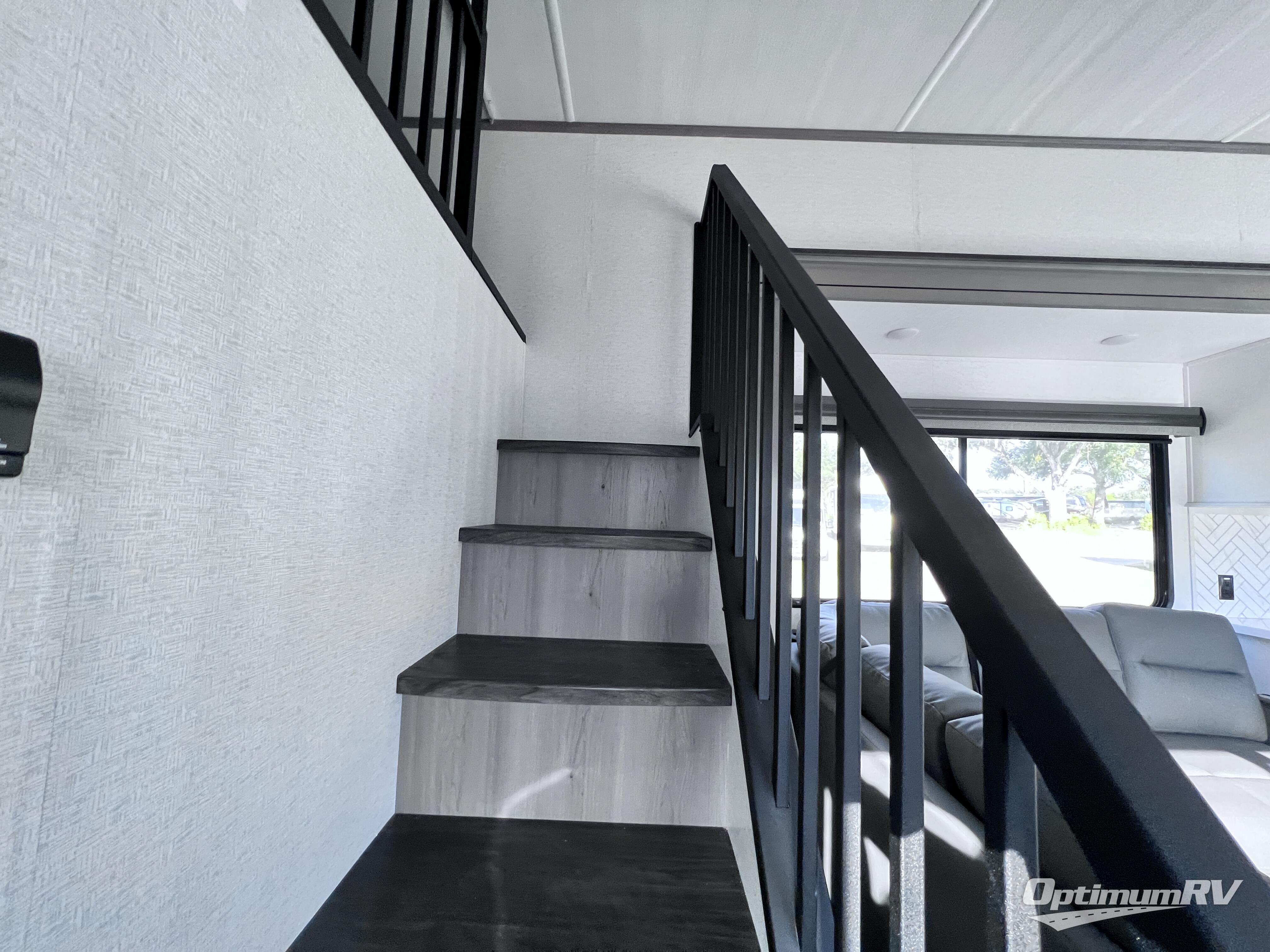 This destination trailer is so accommodating, you may just want to camp all year long! The owners will have the front bedroom all to themselves with a king bed slide out, dresser, and master closet so everything has a place. Above this room is the front loft with stairs that includes three 39" x 74" beds/sleeping spaces and storage shelves, making it perfect for little ones! The spacious full rear bath includes dual bath sinks, a large 48" x 30" shower with a seat, and a closet with washer/dryer prep if you want to add these appliances. And just outside the bath, you'll find the second set of stairs that leads to the rear loft with a 54" x 81" bed, an entertainment center, and storage shelves for your guests. During the day, everyone can meet in the combined living area and kitchen that features a large slide for more space, a sectional sofa, a kitchen island with four barstools, plus an entertainment center with a fireplace!
