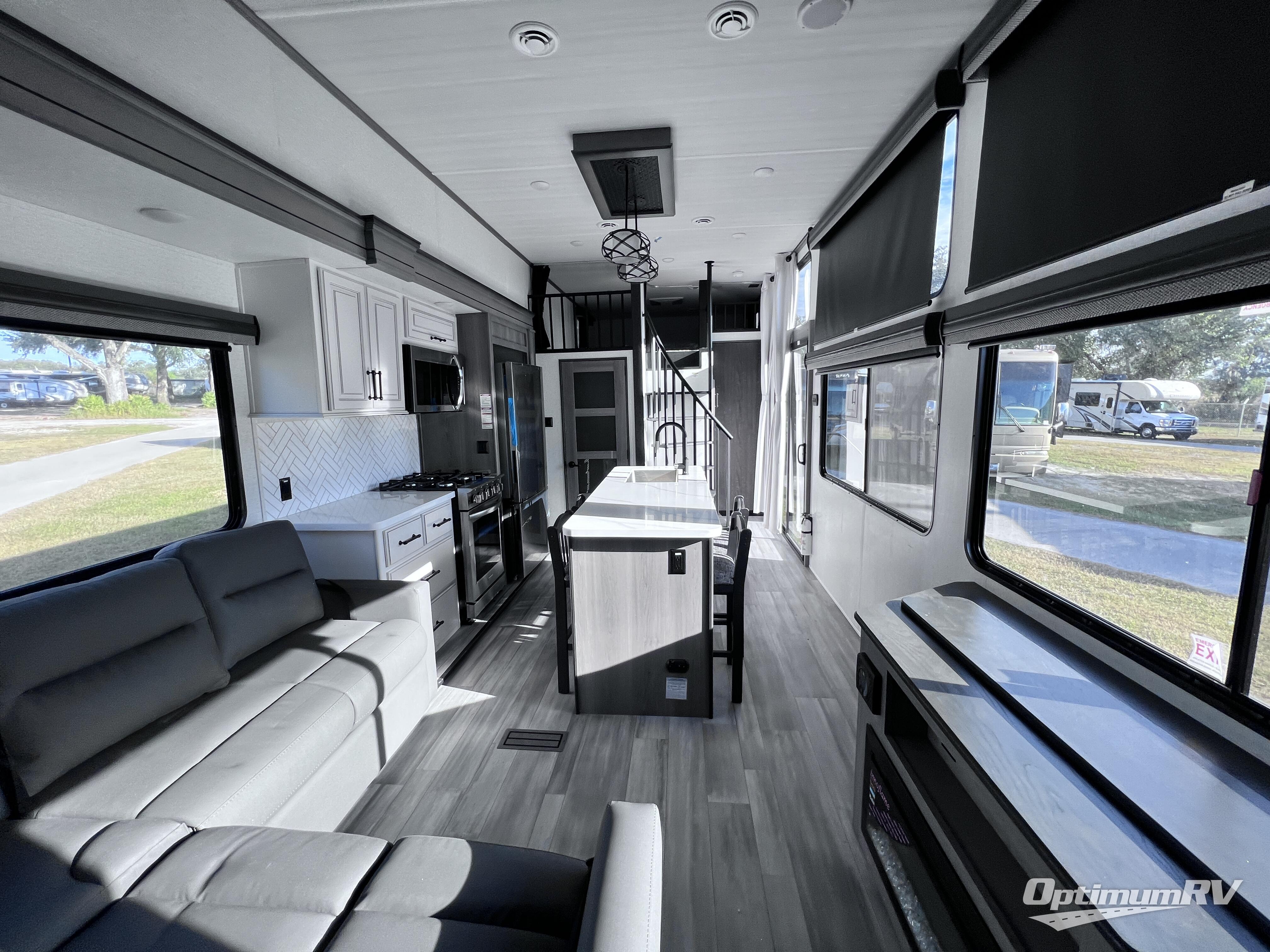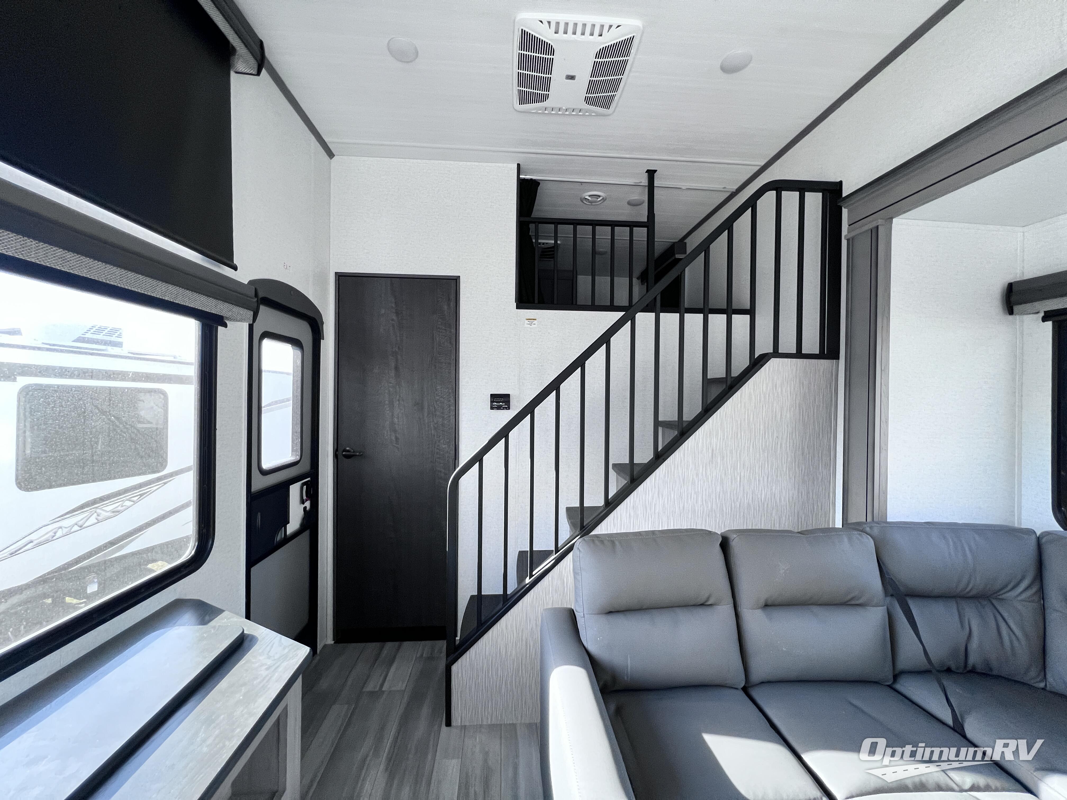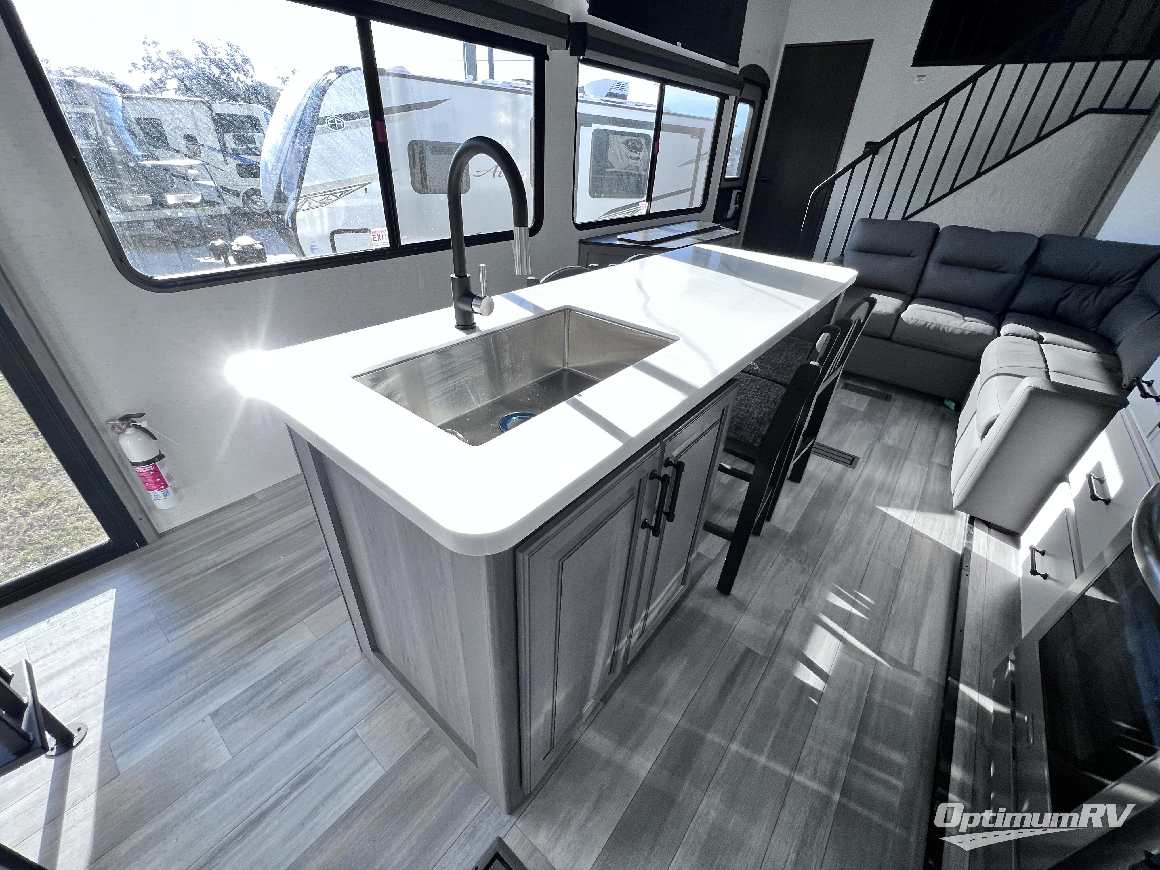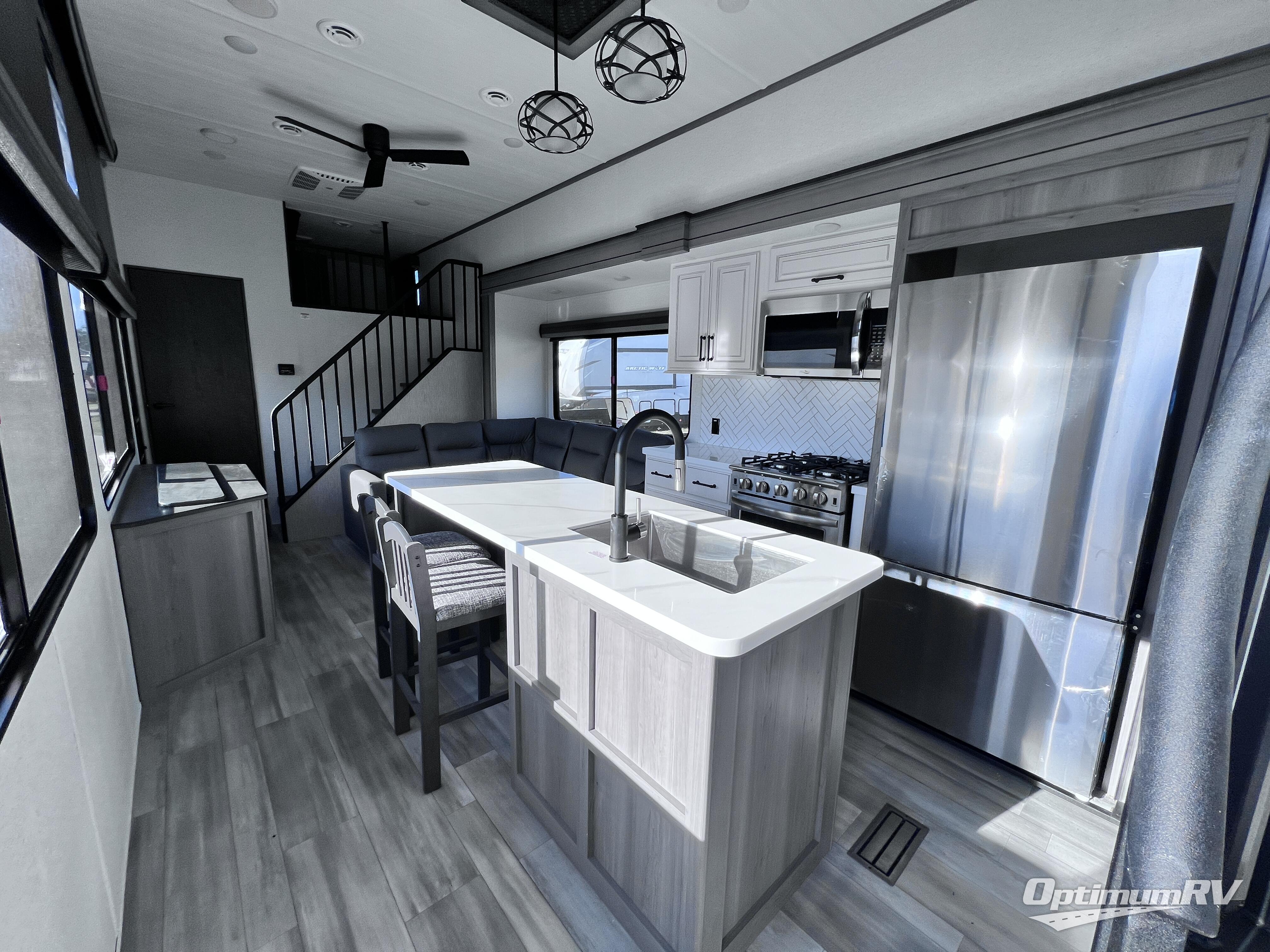 This destination trailer is so accommodating, you may just want to camp all year long! The owners will have the front bedroom all to themselves with a king bed slide out, dresser, and master closet so everything has a place. Above this room is the front loft with stairs that includes three 39" x 74" beds/sleeping spaces and storage shelves, making it perfect for little ones! The spacious full rear bath includes dual bath sinks, a large 48" x 30" shower with a seat, and a closet with washer/dryer prep if you want to add these appliances. And just outside the bath, you'll find the second set of stairs that leads to the rear loft with a 54" x 81" bed, an entertainment center, and storage shelves for your guests. During the day, everyone can meet in the combined living area and kitchen that features a large slide for more space, a sectional sofa, a kitchen island with four barstools, plus an entertainment center with a fireplace!