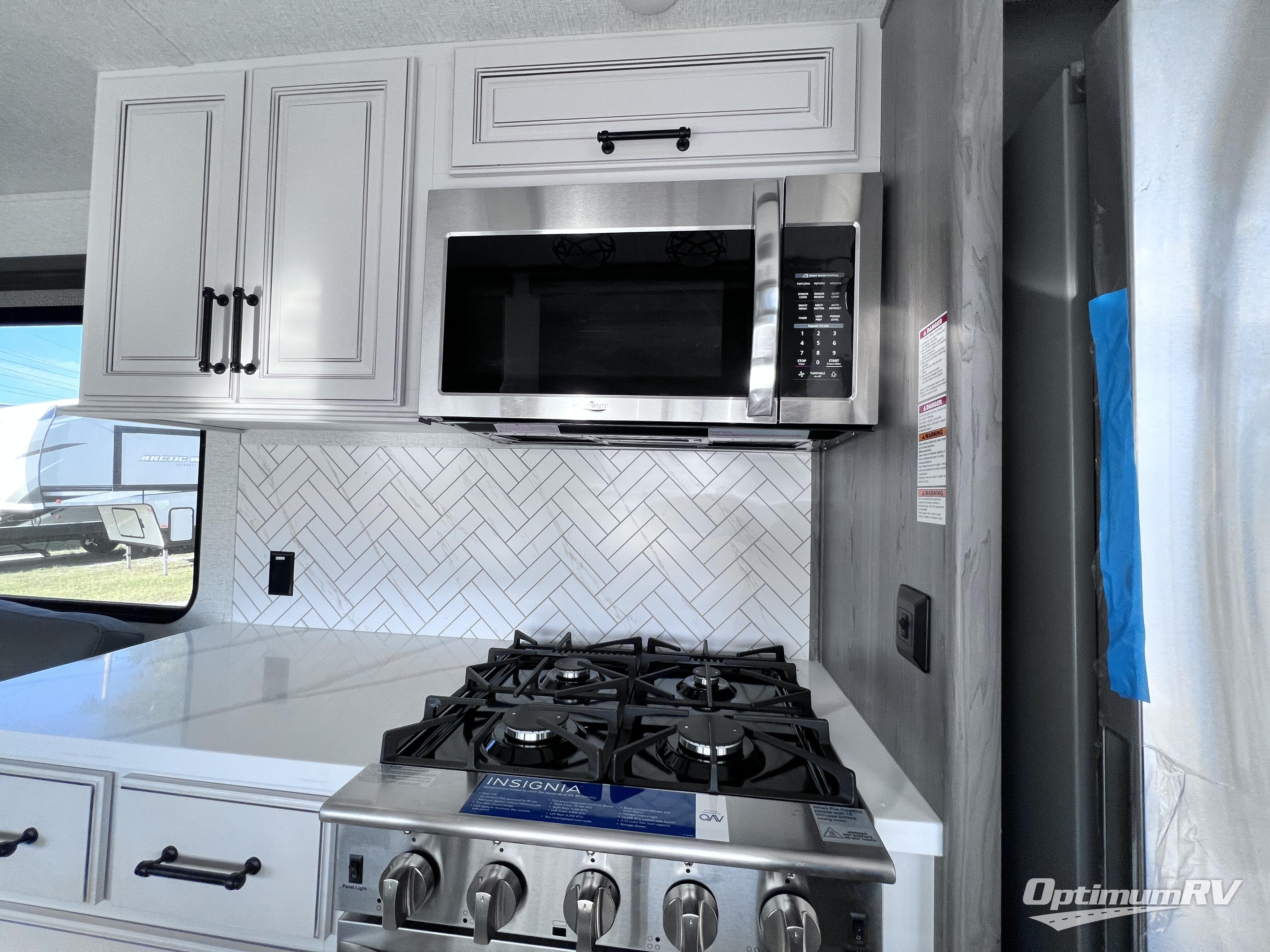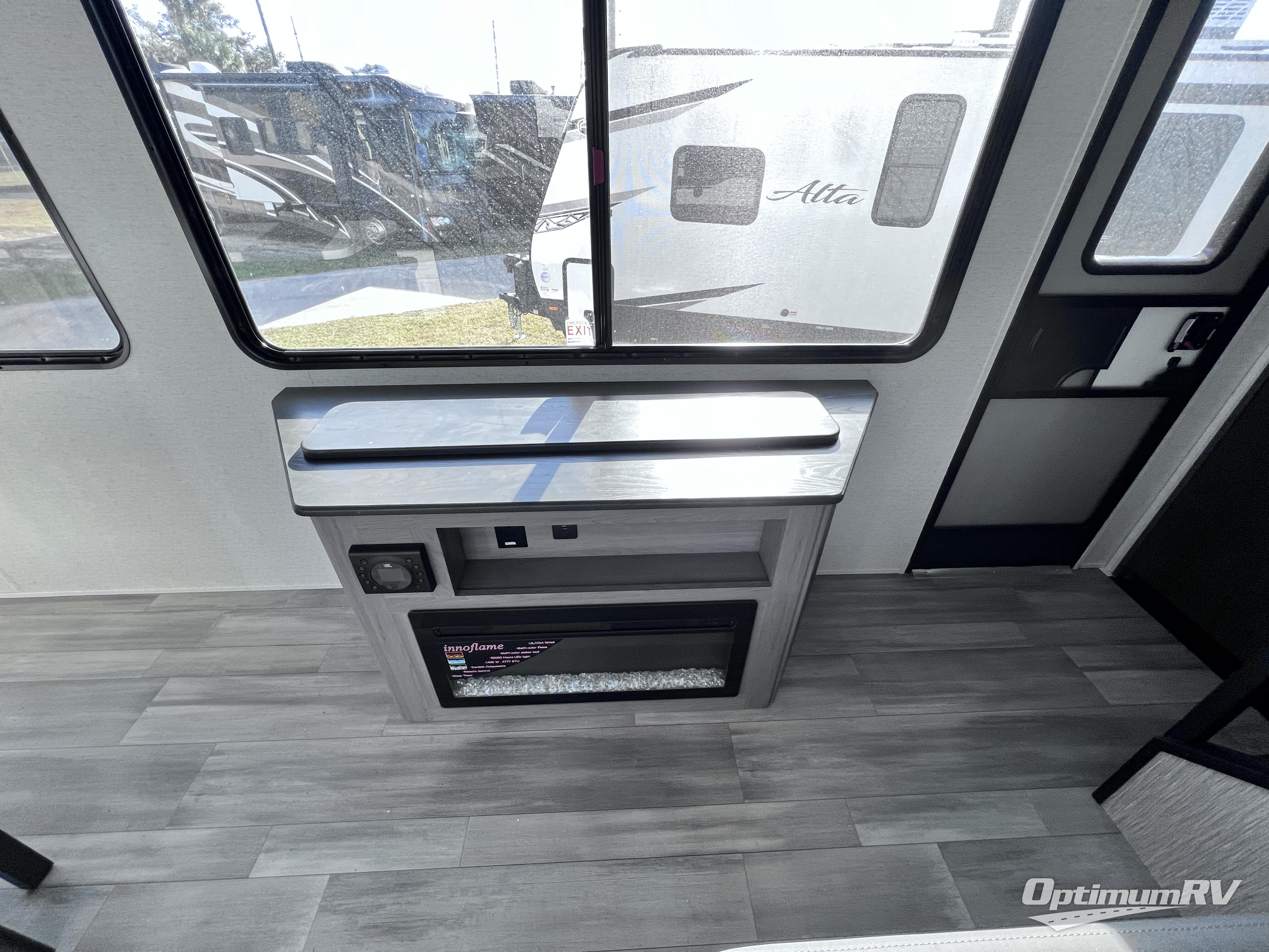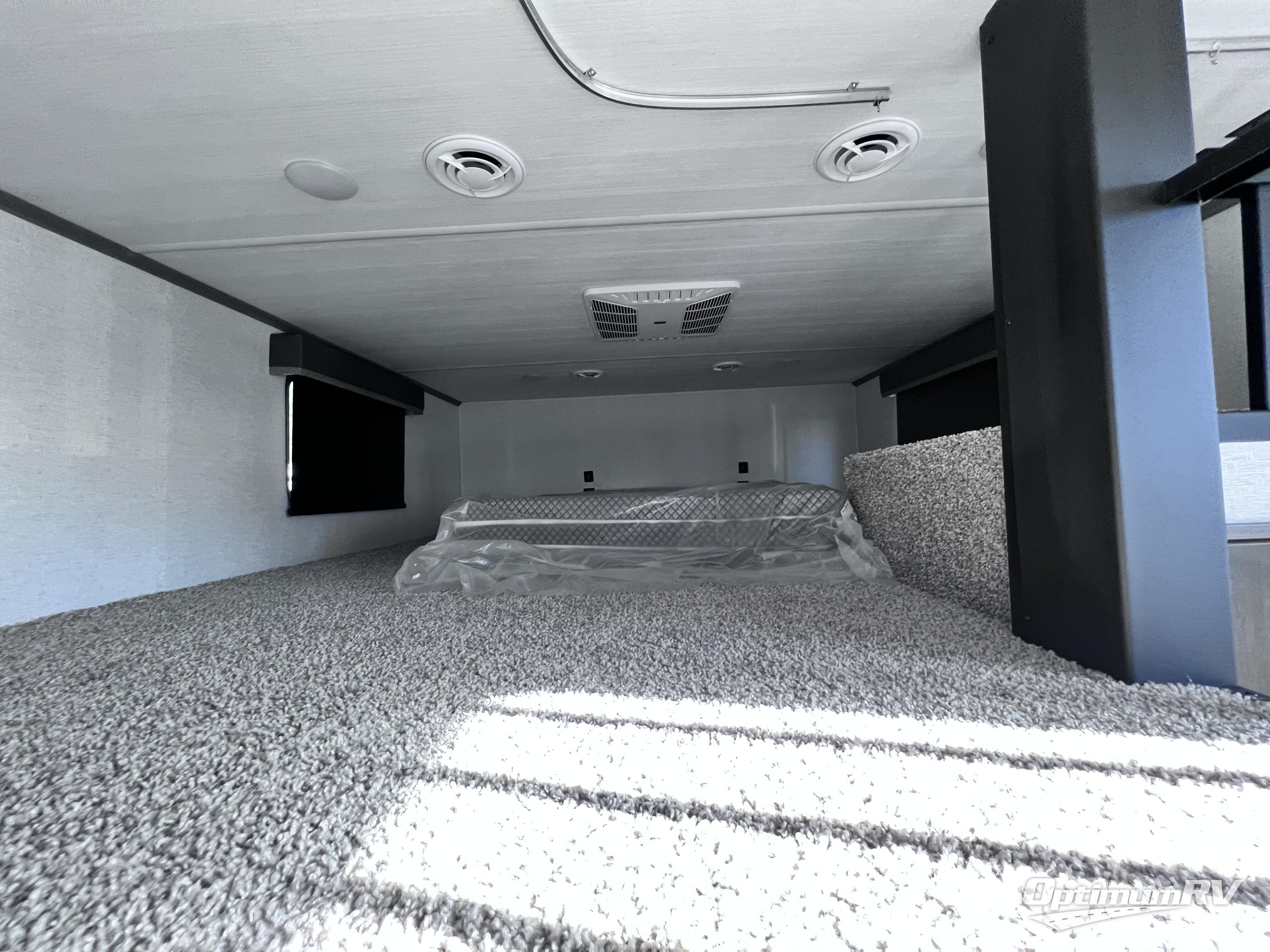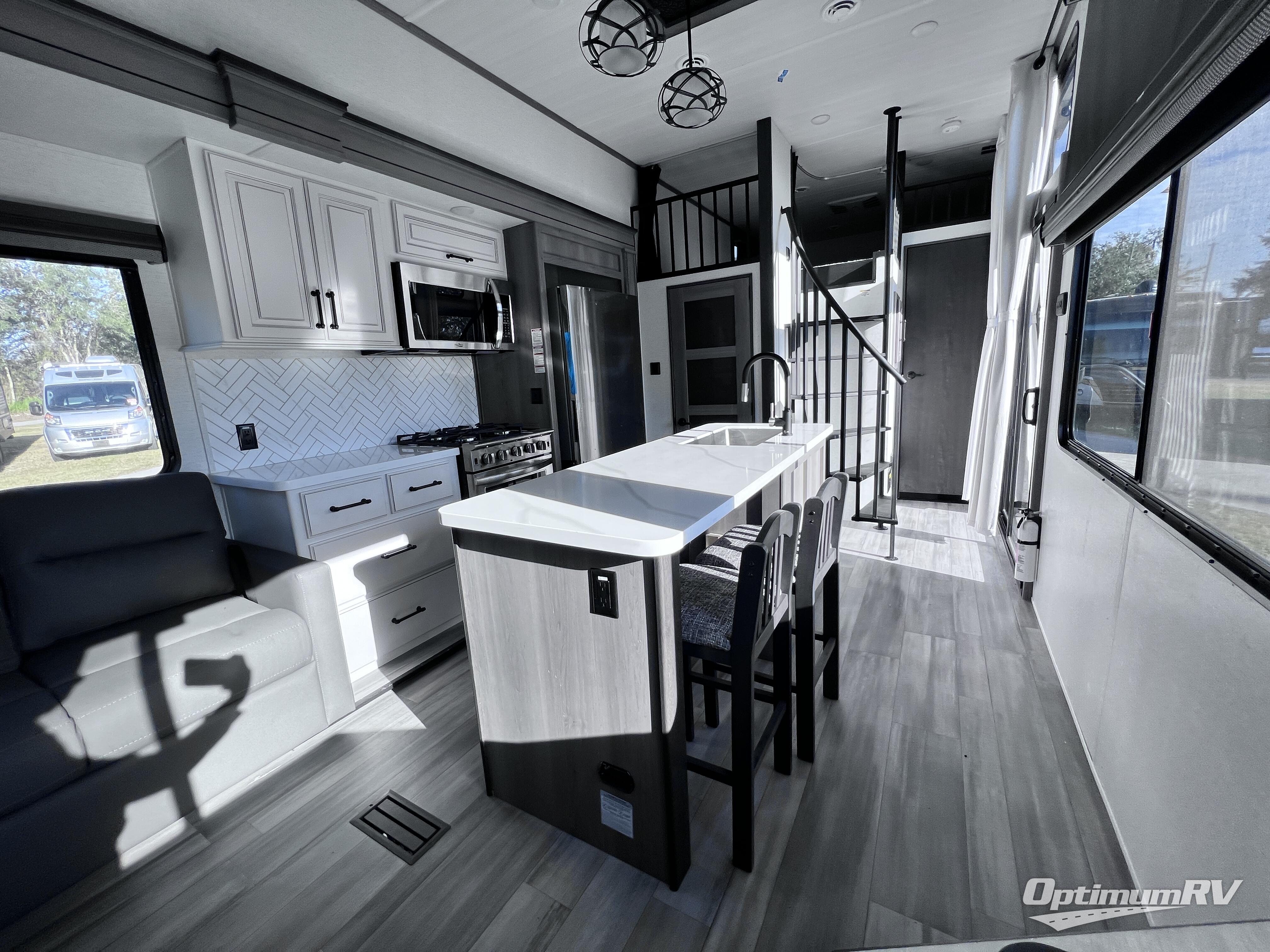 This destination trailer is so accommodating, you may just want to camp all year long! The owners will have the front bedroom all to themselves with a king bed slide out, dresser, and master closet so everything has a place. Above this room is the front loft with stairs that includes three 39" x 74" beds/sleeping spaces and storage shelves, making it perfect for little ones! The spacious full rear bath includes dual bath sinks, a large 48" x 30" shower with a seat, and a closet with washer/dryer prep if you want to add these appliances. And just outside the bath, you'll find the second set of stairs that leads to the rear loft with a 54" x 81" bed, an entertainment center, and storage shelves for your guests. During the day, everyone can meet in the combined living area and kitchen that features a large slide for more space, a sectional sofa, a kitchen island with four barstools, plus an entertainment center with a fireplace!