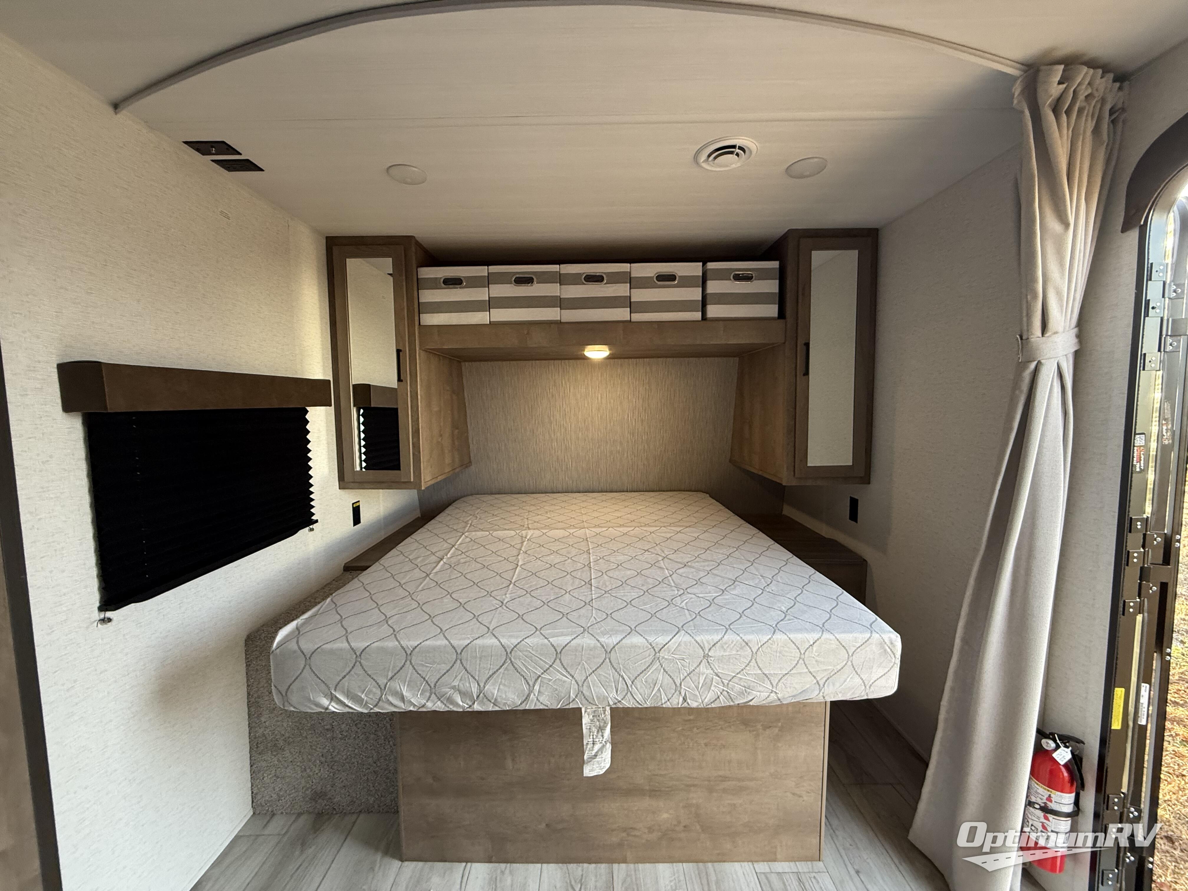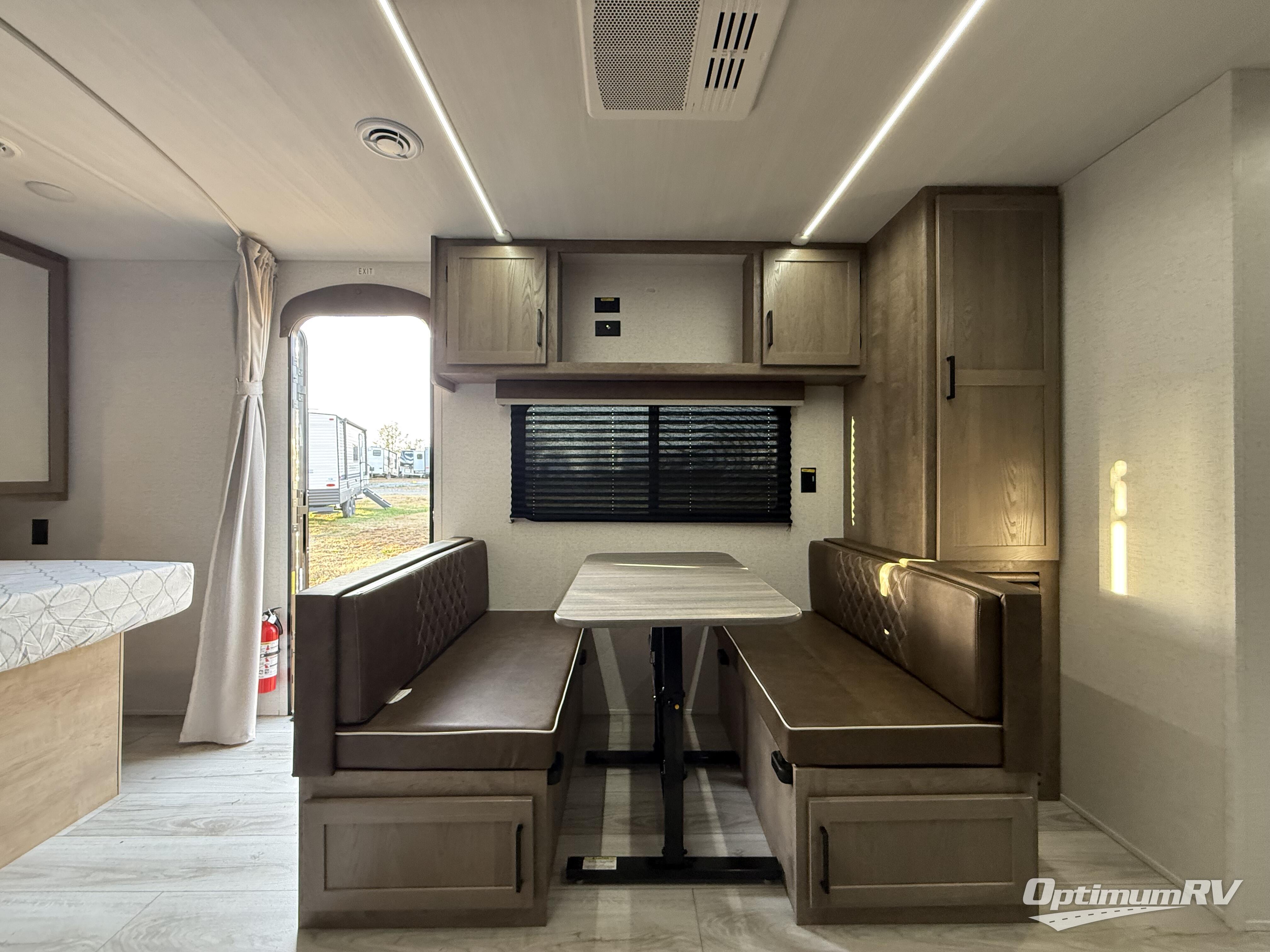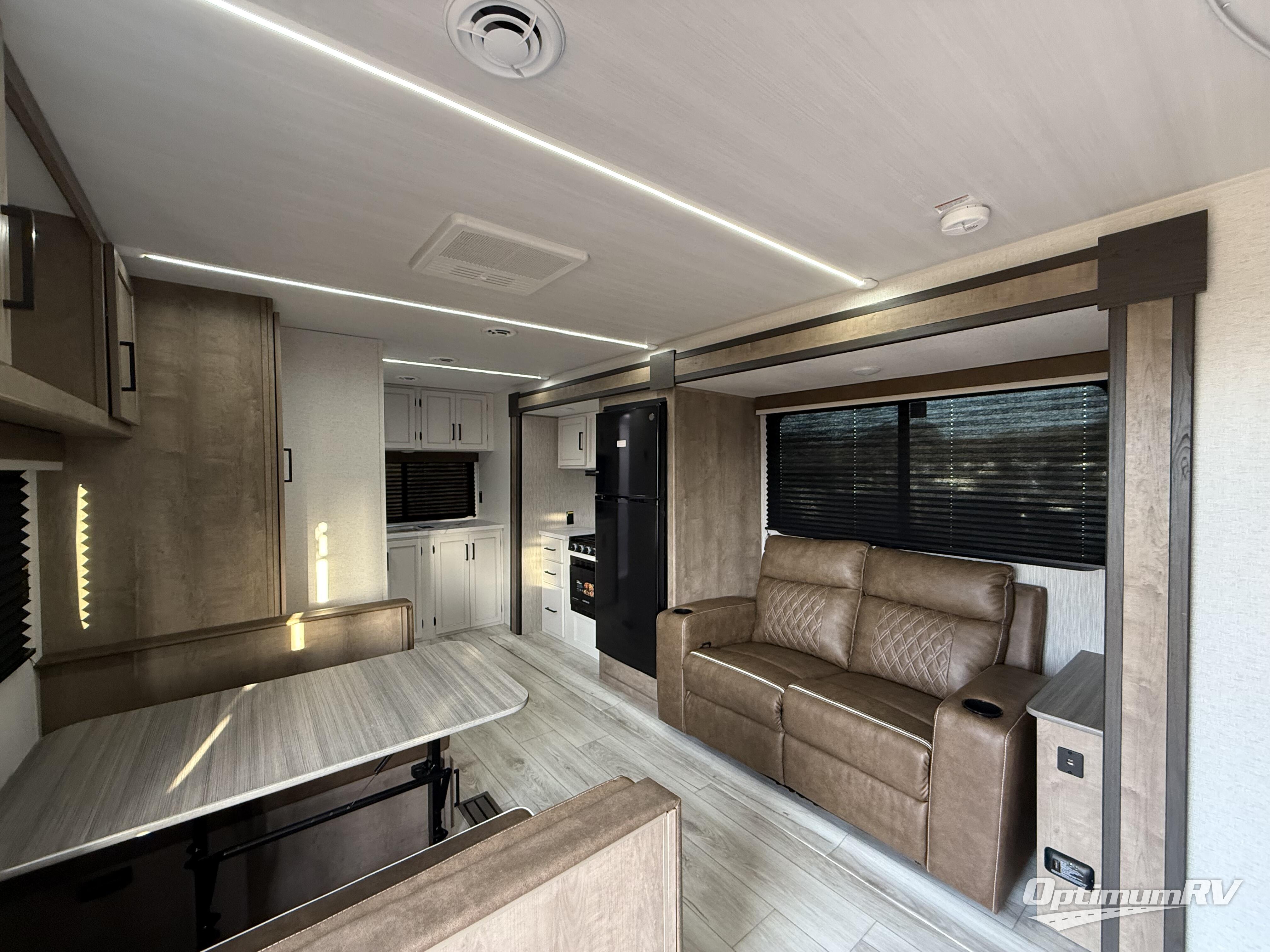 Trips to your favorite camping spot just got better in this open concept travel trailer. The large slide out houses the sofa with an end table, three burner cooktop, refrigerator, and overhead cabinet for storage. You can clean up each day in the rear corner full bath with a sliding door to save on space, and the other rear corner includes the spacious sink and counter space to prep meals. A booth dinette provides a place to dine, play games, and even let a guest sleep over. When you're ready to sleep, the queen bed up front is sure to bring a great night's rest, and there is a privacy curtain here for added convenience. You are sure to appreciate the laundry chute that allows you to throw clothes directly into the pass-through storage!
