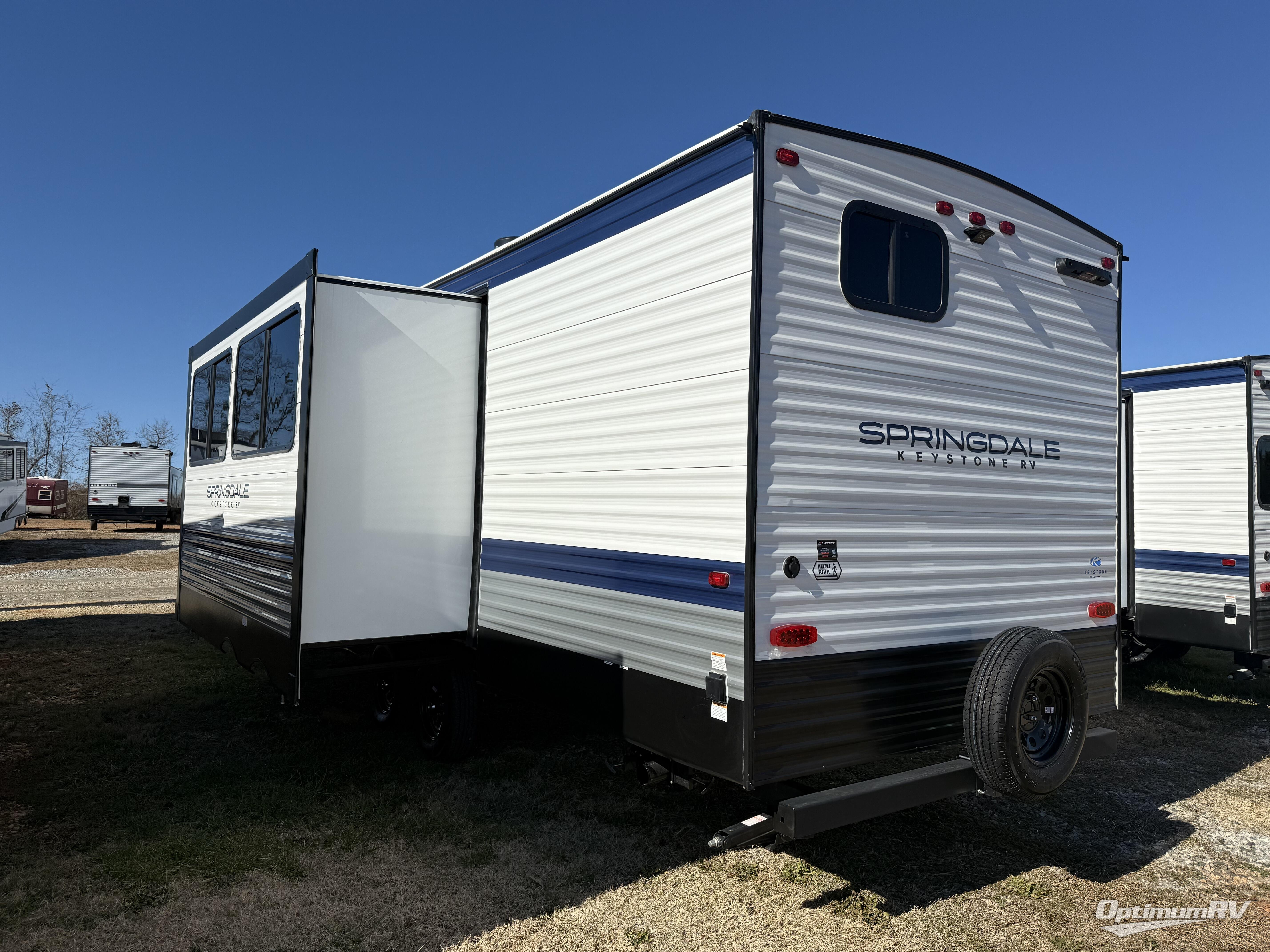 The Springdale Classic travel trailers by Keystone will provide you and your family many great outdoor experiences and it will also be kind to your pocketbook. Each one is constructed with an aluminum exterior, a walkable roof, and an I-beam frame with stamped steel cross-members and outriggers for added strength. There are also electric stabilizer jacks and power tongue jacks outside, along with a friction hinge entry door and an XL entry assist handle for added convenience. Each travel trailer includes a two burner flush mount gas range with a glass cover, LED lighting, bedside outlets, and blackout night shades inside that will provide you with more privacy at night. Some of the Keystone Exclusives you'll appreciate are the color-coded unified wiring and in-floor heating ducts, and the optional SolarFlex 200 will let you add off-grid capabilities if you choose!