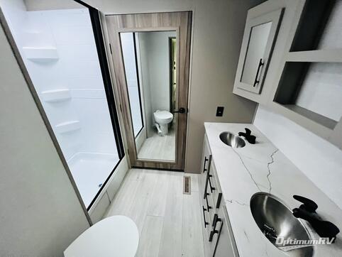 Pack your bags and head to the lake in this cozy travel trailer for five. Once you unload your gear from the pass-through storage, prepare a quick lunch on the mini outside kitchen with a griddle and relax under the patio awning. If the weather is raining on your parade, just head indoors to cook on the three burner cooktop, and you'll find ample counter space in this rear kitchen to set out drinks and sides. Your crew can relax on the hide-a-bed sofa and booth dinette within the large slide out, and there is an LED TV and a 34" fireplace for a more at-home atmosphere. One of your favorite features of this trailer will probably be the master suite with a king bed slide out, a dresser and an entertainment center, plus easy access to the front full bath. Here, you'll find dual bath sinks, a spacious shower, plus a walk-in closet with a closet rod to keep your outfits wrinkle free. There is even a wardrobe in the bedroom with washer and dryer prep so you can keep all those clothes fresh and clean!