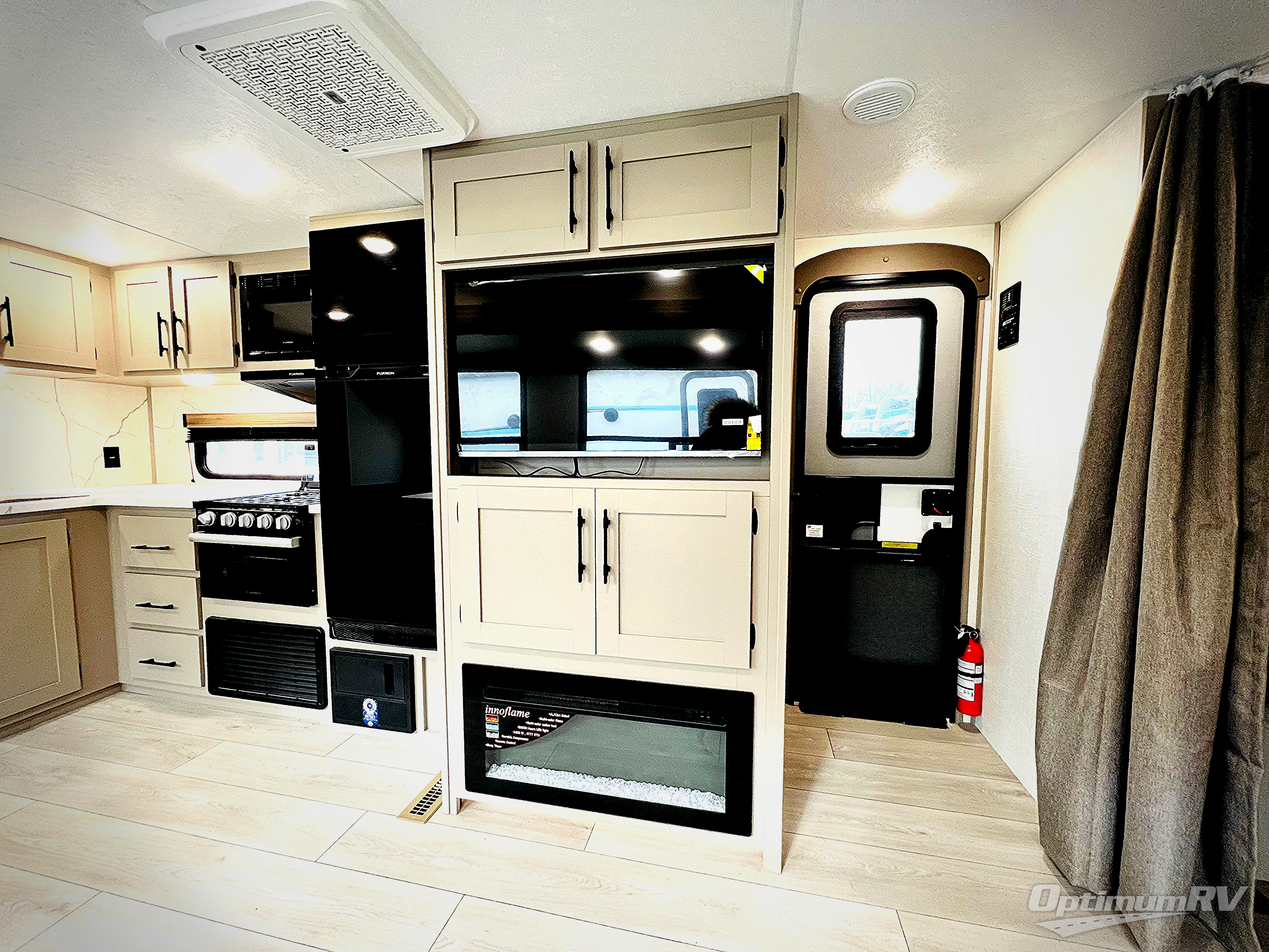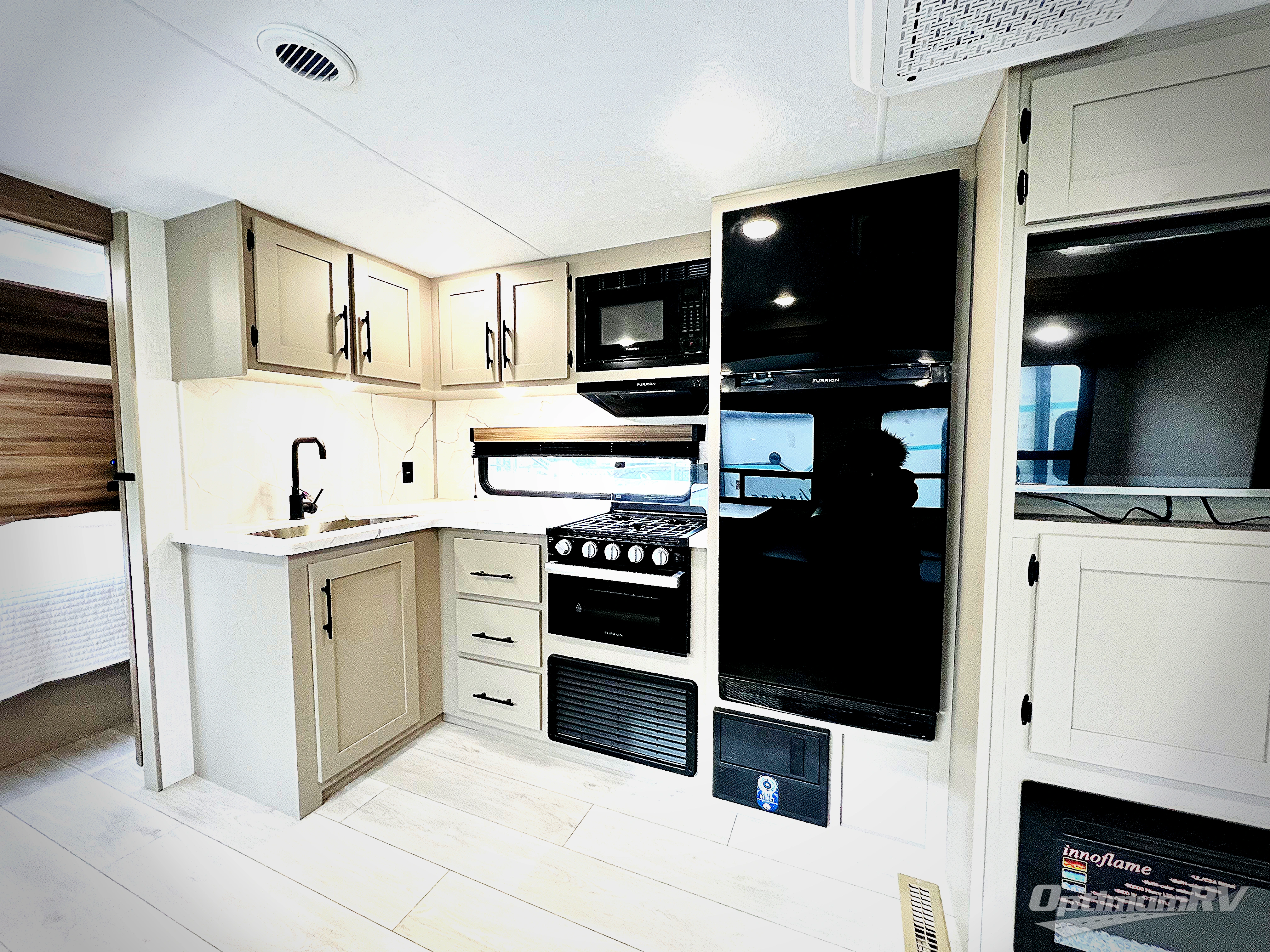 Headed to the RV park with your family and friends? Want enough space to allow overnight guests to stay the night on occasion? This trailer gives you double-size bunks, a 70" sofa and a booth dinette that offer extra sleeping space while you enjoy your own walk-around queen bed in the front private bedroom. You will also have dual wardrobes, and a TV mount to add your own TV. Everyone will stay refreshed and cleaned using the rear corner full bathroom, and fed by the cook that has an inside kitchen with full amenities including an L-shaped counter and a large sink. There is also a walk-in pantry with coat hooks next to the entry to utilize as a multi-purpose closet. And there is an outside kitchen with a griddle and a refrigerator, a 20' power awning with an LED light strip, and a pass-through storage for the larger camping items.