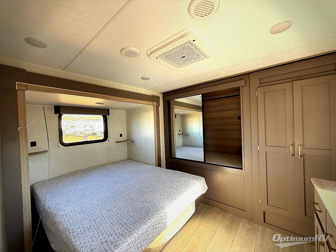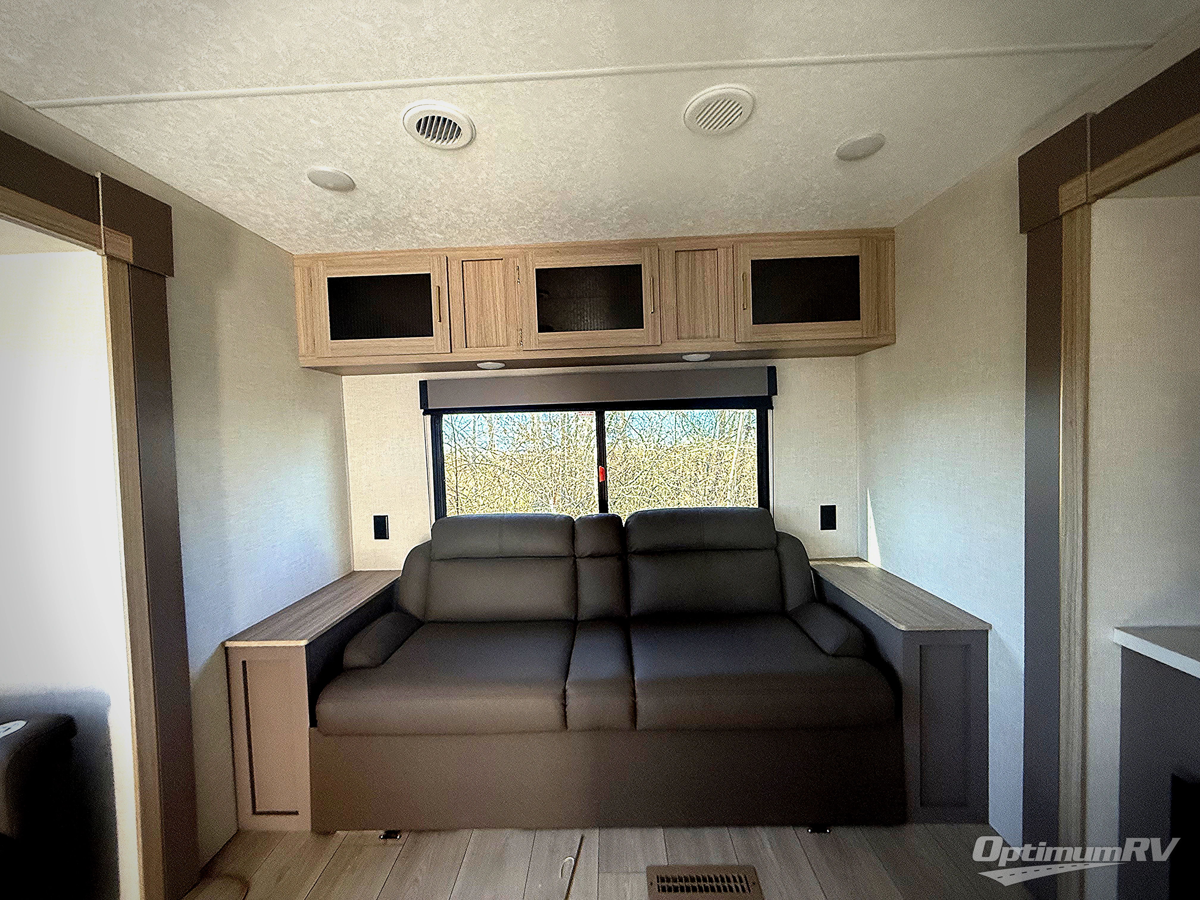 Wow! Check out the space you will have in this travel trailer with dual opposing slides in the rear living area, plus a slide out queen bed in the bedroom! The kitchen island will provide more counter space, along with the hutch/pantry that includes a microwave above. Your crew can relax on the theater seating, booth dinette, or 70" sofa after dinner is cleaned up, plus you have a 30" fireplace for a more at-home feel. This model also includes a 12' power awning so relax under during day!