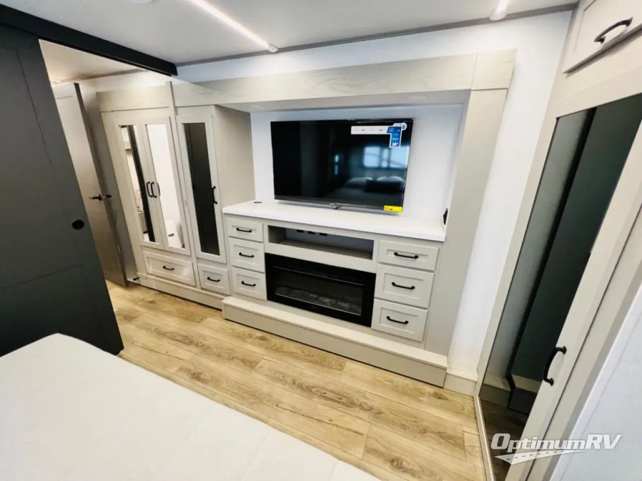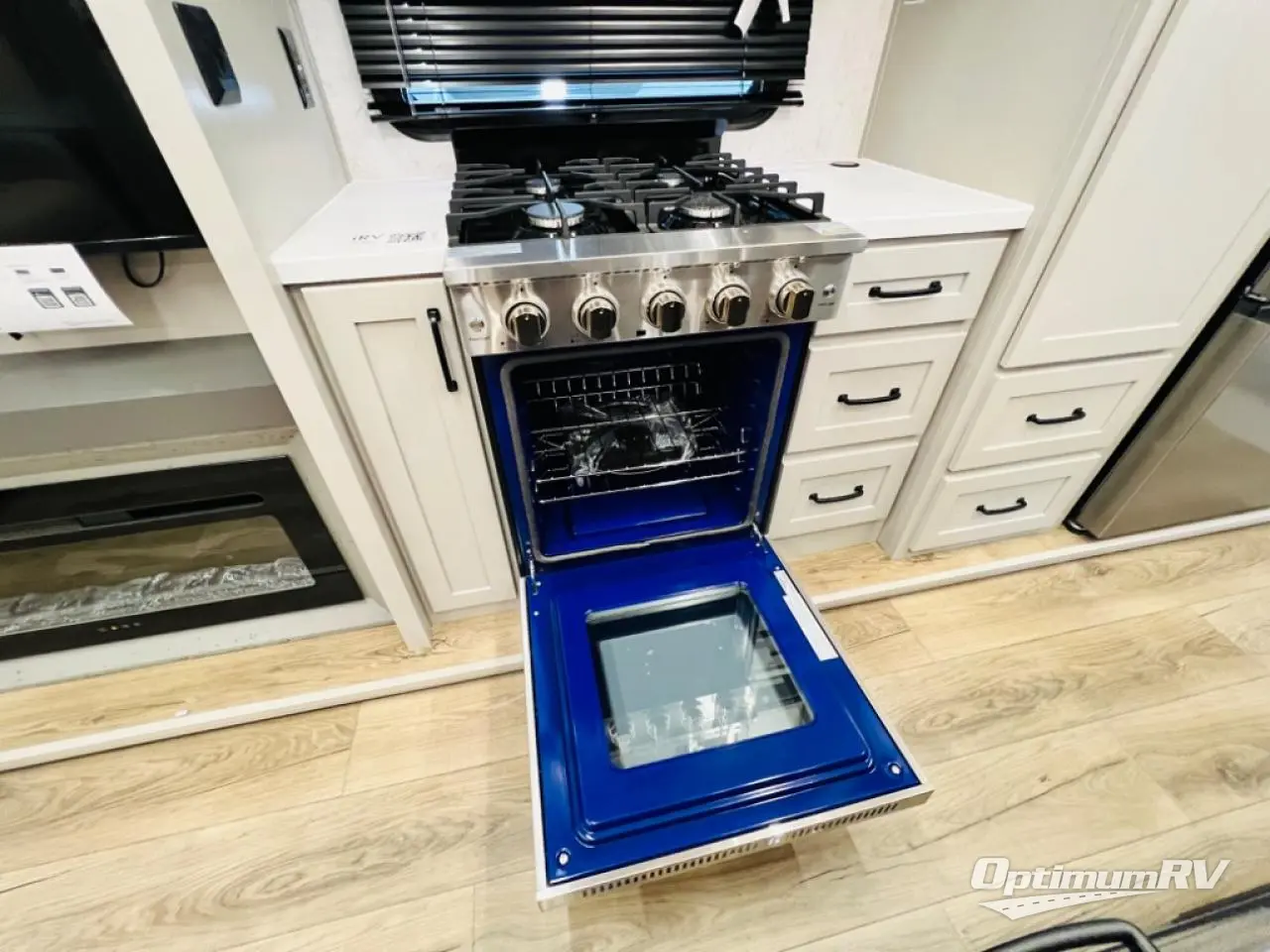 It won't be hard to fall in love with this fifth wheel that can sleep four each night! There are dual opposing slides in the bedroom and in the combined kitchen and living area for maximum space to relax! You will love evenings spent in the rear living area on the theater seat across from the 50" Smart TV, and there is a sofa sleeper to let guests stay over. A four burner gas cooktop and residential style stainless steel microwave will let you cook meals each day, and the table with chairs will be the perfect place to dine together. Head to the full bath that includes a shower with a seat to easily clean up, then head off to bed in the front private bedroom. Here, you'll find a king bed slide out, a bedroom Smart TV, plus a spacious wardrobe with a shelf. There is even washer and dryer prep if you want the option to make full-time RVing easier!