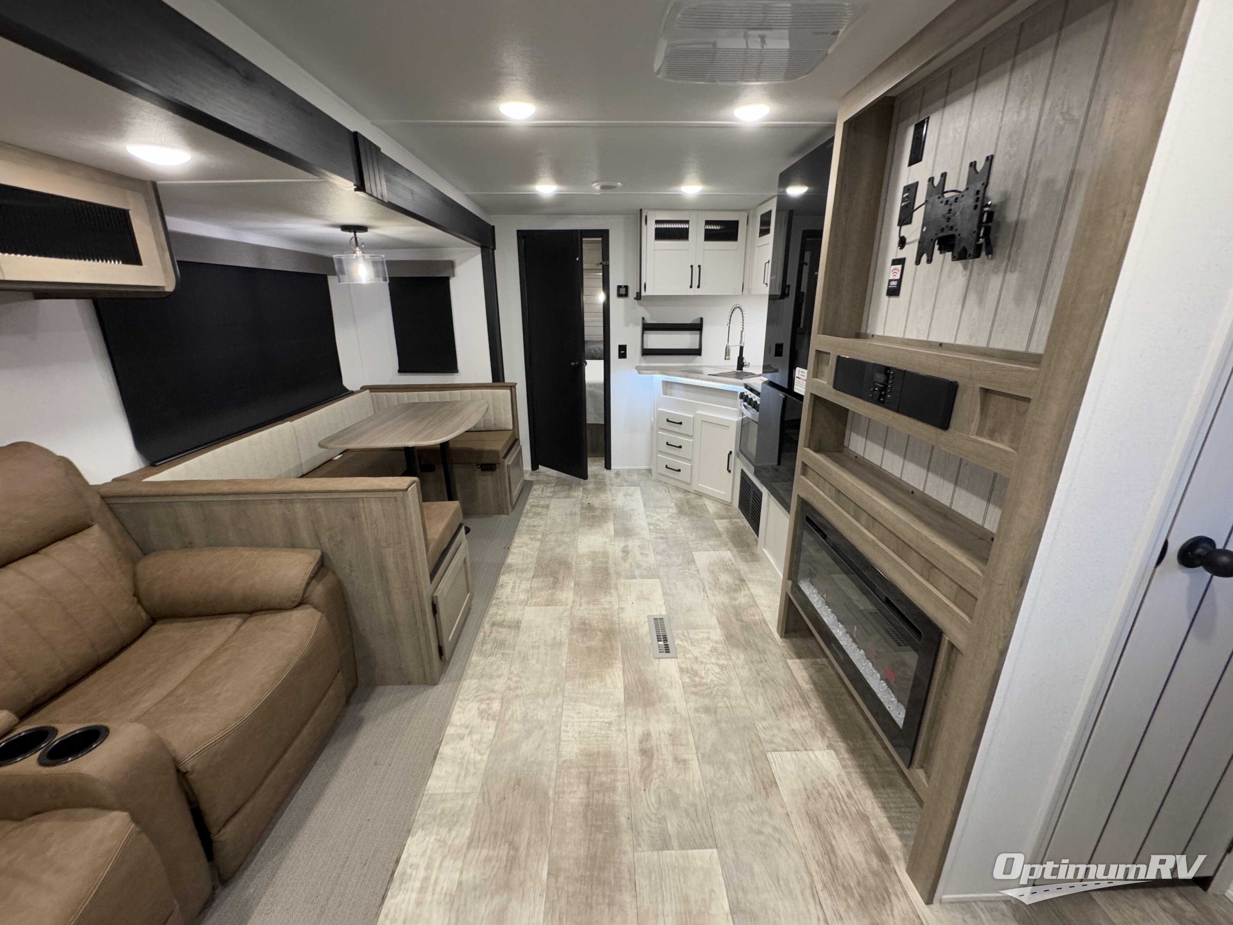 The kids will love having their own rear private bunkhouse in this travel trailer! Inside the bunkhouse is a 38" x 76" bunk above an entertainment center, a closet, and a 32" x 69" bunk above a jiffy sofa slide. The full bathroom with a 34" x 34" radius shower is just outside the bunkhouse for them to easily access it at night. They can even invite a friend or two to tag along and sleep on the sofa and U-shaped dinette once converted. Behind the entertainment center is a closet/pantry to keep your favorite snacks and the kitchen has a 12V refrigerator to keep your beverages cold. When you're ready to wind down your nights, head to the front private bedroom and relax on the queen bed with shirt closets and nightstands on either side of it, plus it has one of the dual entry doors to the unit! This model also includes two outside kitchen options if you enjoy cooking in the fresh outdoors!