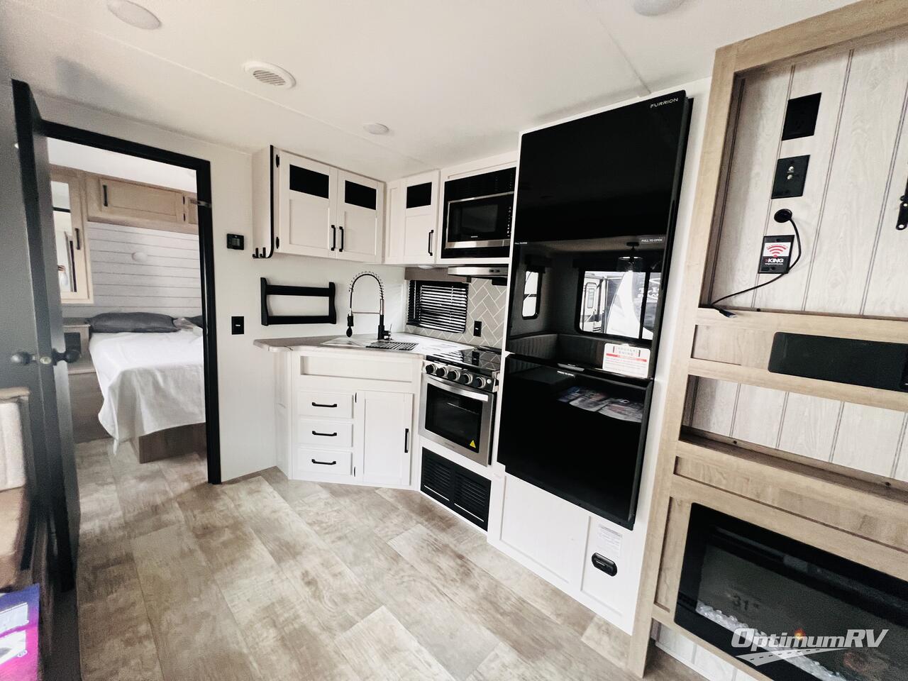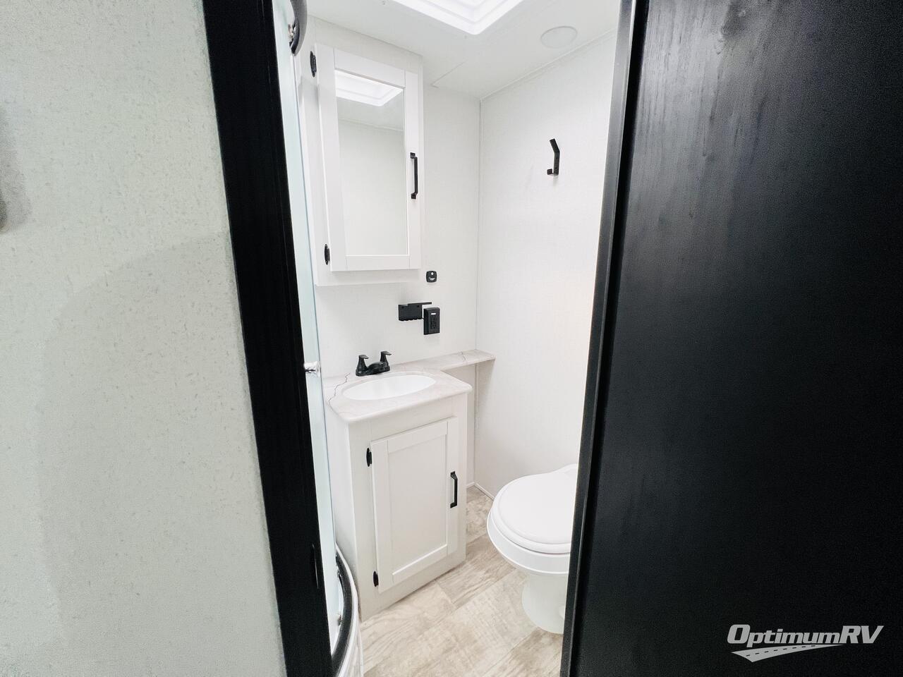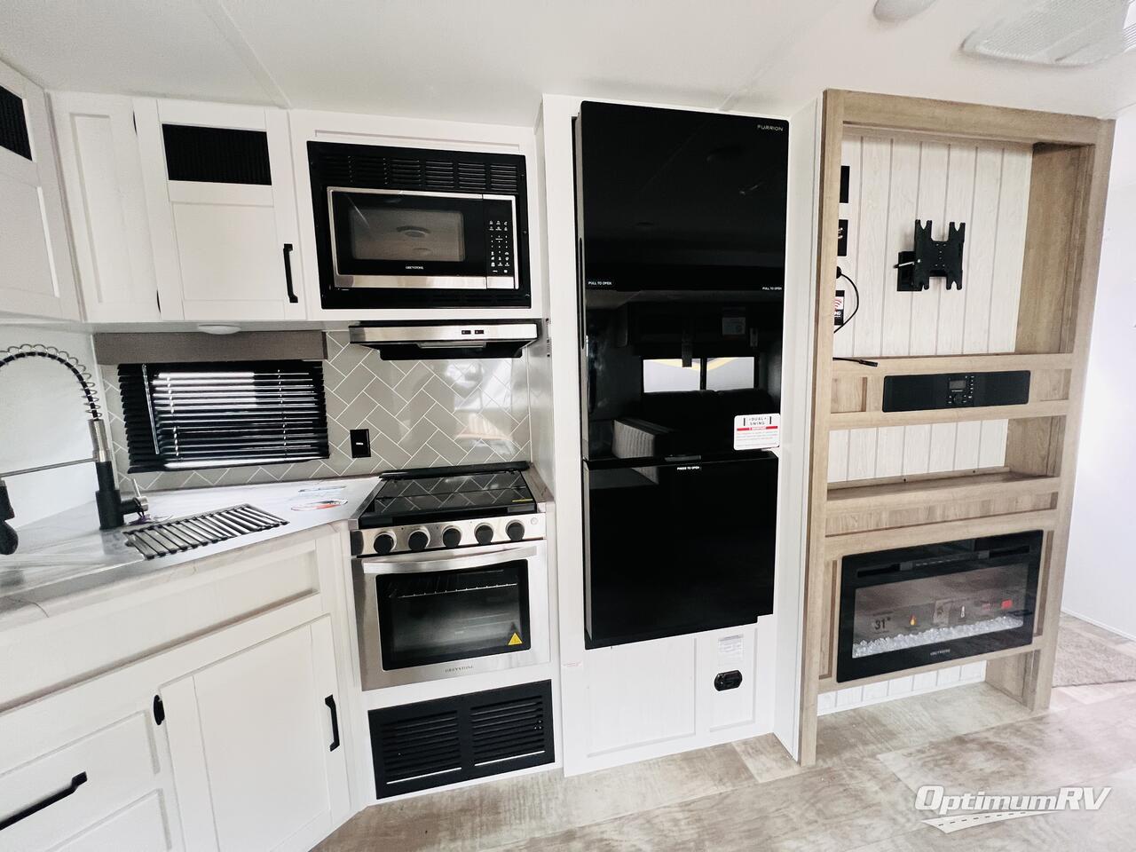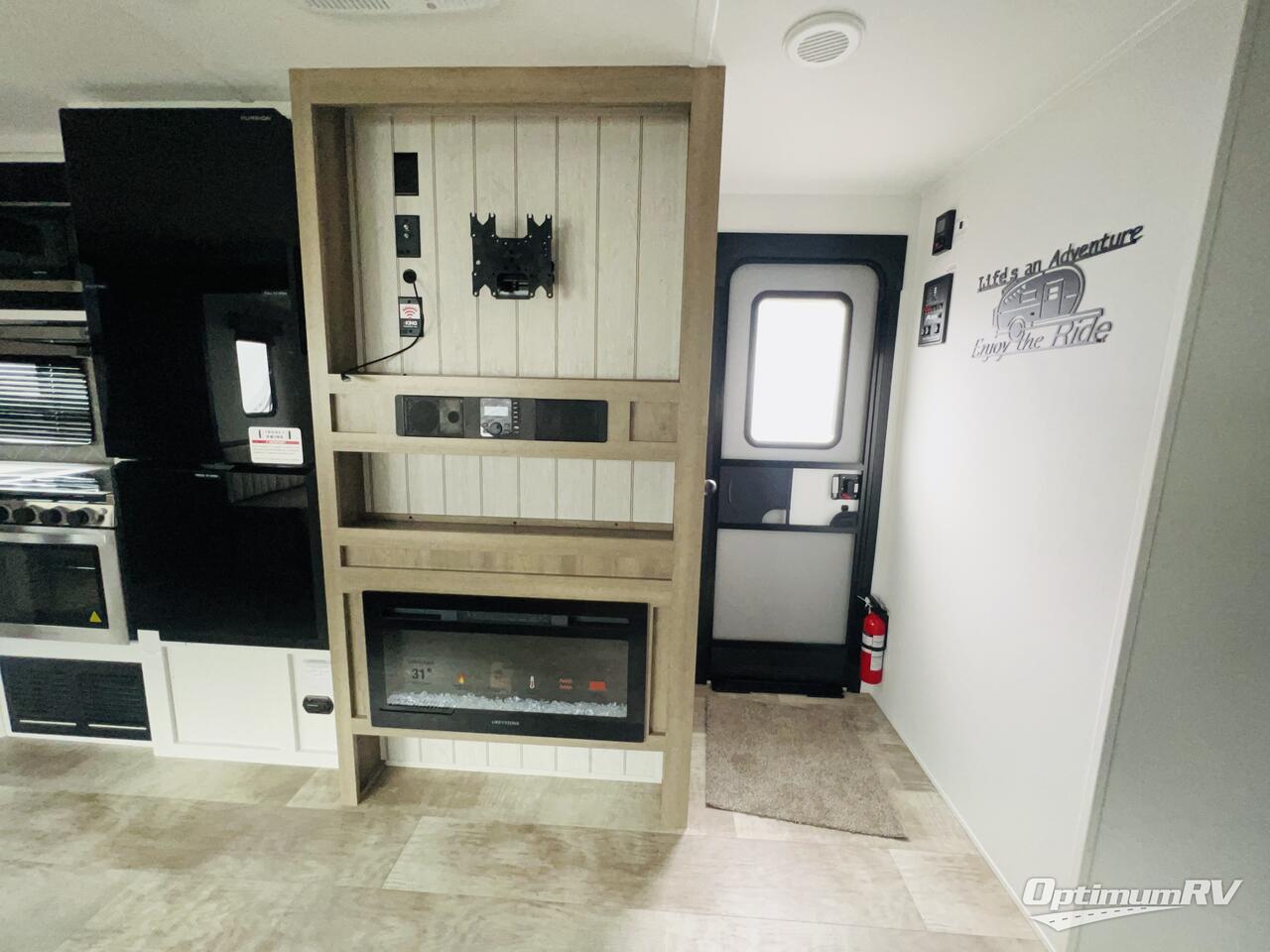 The kids will love having their own rear private bunkhouse in this travel trailer! Inside the bunkhouse is a 38" x 76" bunk above an entertainment center, a closet, and a 32" x 69" bunk above a jiffy sofa slide. The full bathroom with a 34" x 34" radius shower is just outside the bunkhouse for them to easily access it at night. They can even invite a friend or two to tag along and sleep on the sofa and U-shaped dinette once converted. Behind the entertainment center is a closet/pantry to keep your favorite snacks and the kitchen has a 12V refrigerator to keep your beverages cold. When you're ready to wind down your nights, head to the front private bedroom and relax on the queen bed with shirt closets and nightstands on either side of it, plus it has one of the dual entry doors to the unit! This model also includes two outside kitchen options if you enjoy cooking in the fresh outdoors!
