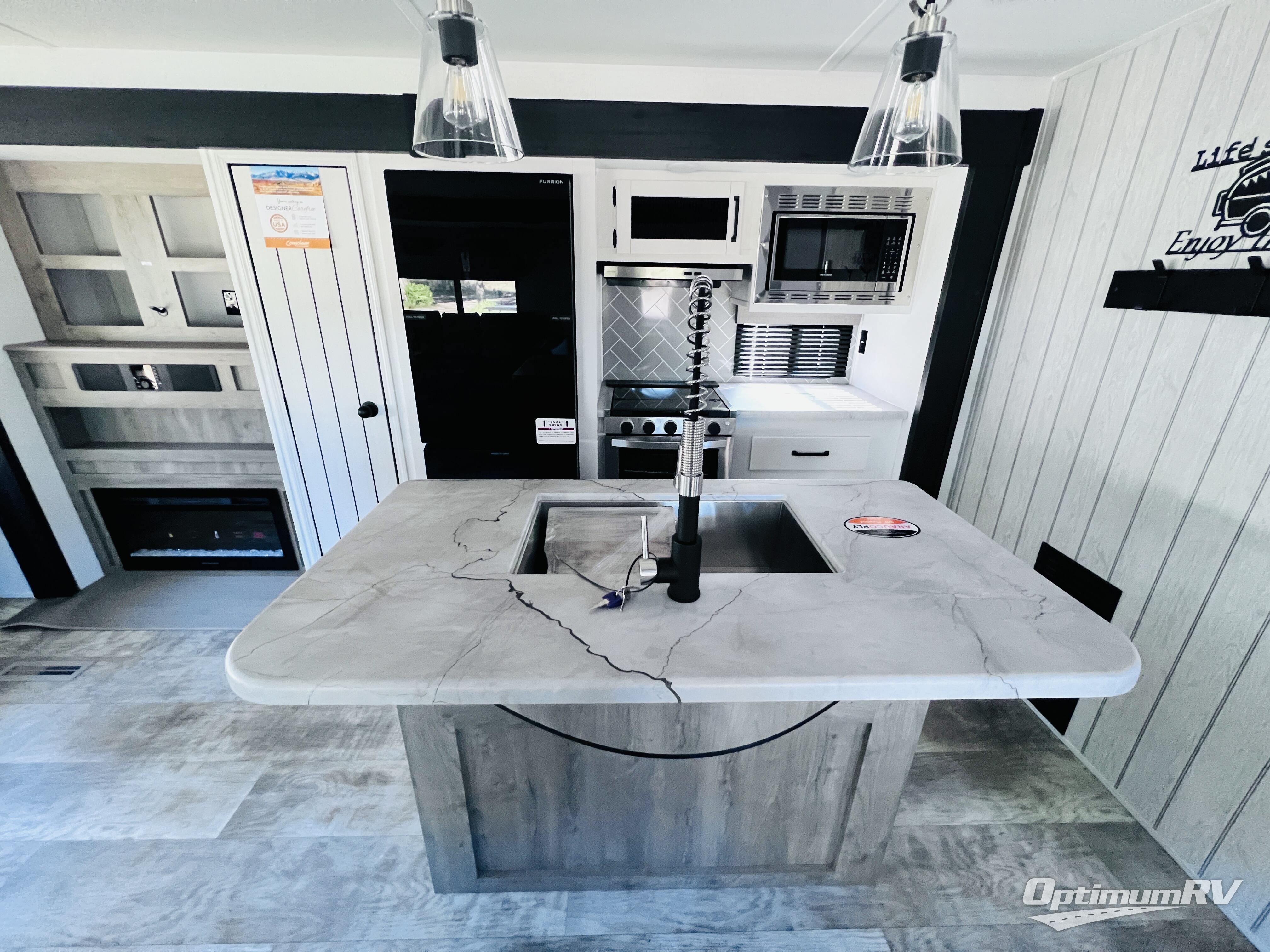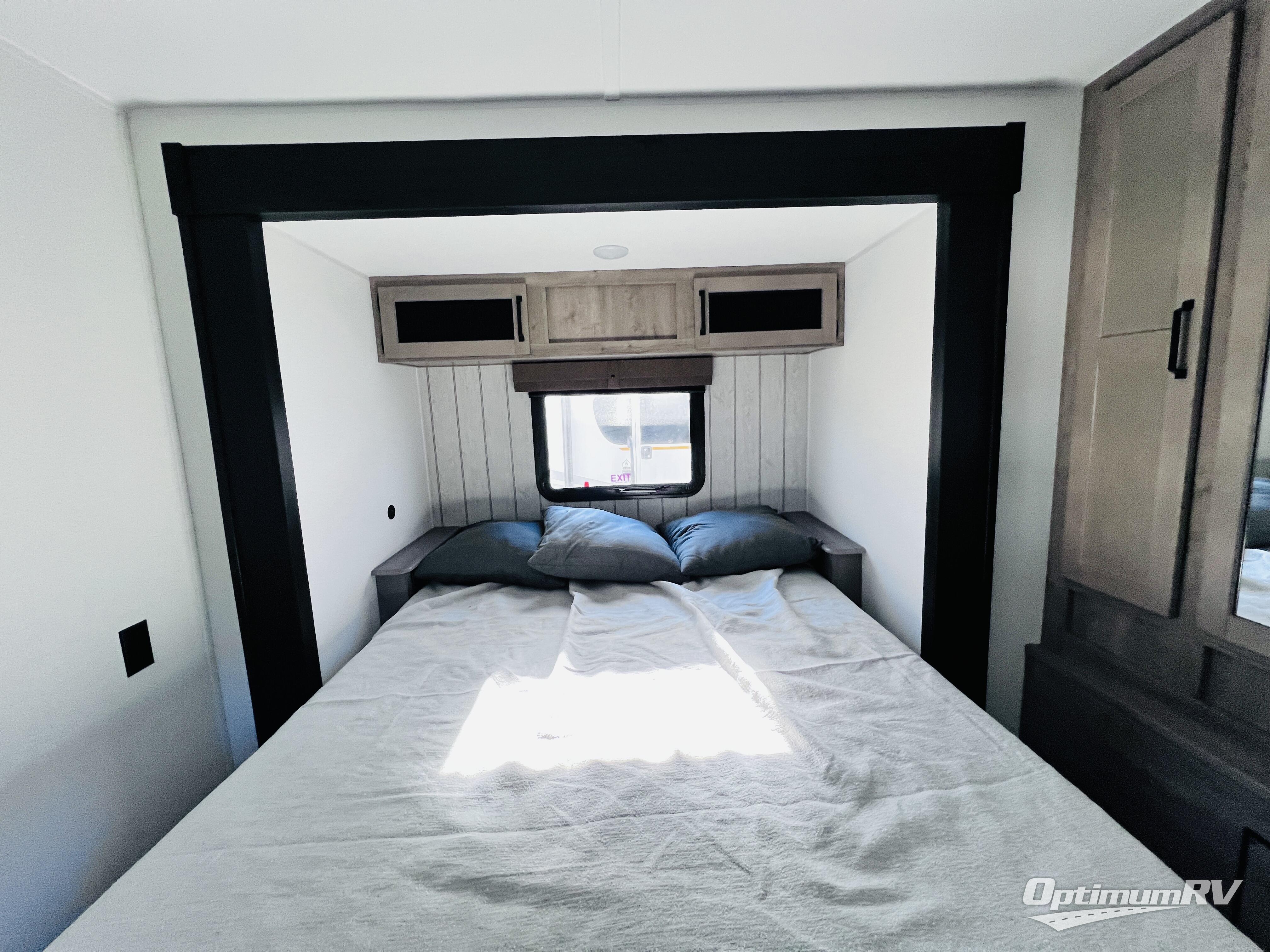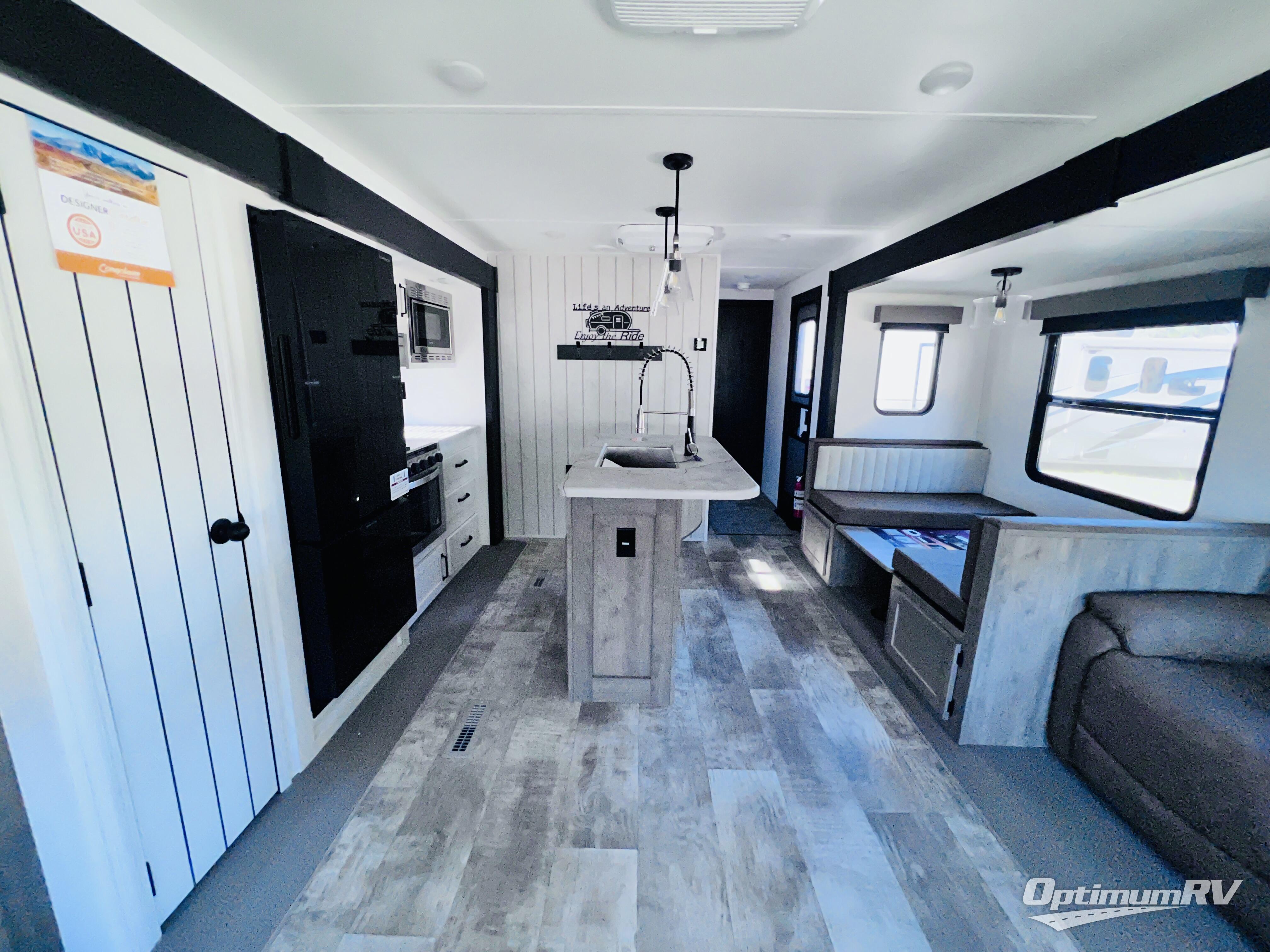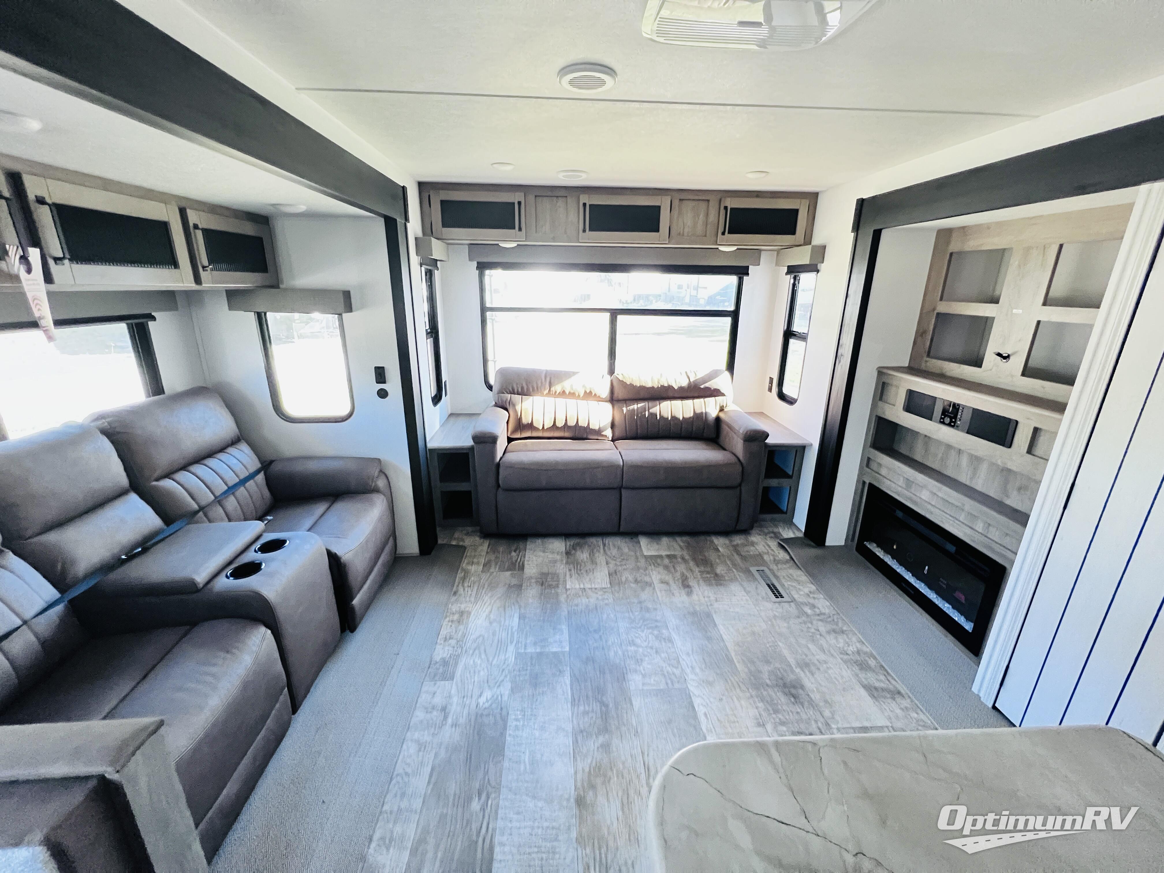 You're going to feel right at home in this travel trailer! The front private bedroom has a queen bed slide for a good night's rest, a dresser and front closet for your clothes, and another closet with washer and dryer prep. Freshen up each morning in the full bathroom with the 32" x 40" shower with a seat and then head to the kitchen to fry up some eggs on the three burner cooktop. You will also appreciate having a kitchen island for easier meal prep and a walk-in pantry to easily see your canned goods and snacks. The booth dinette offers a comfortable place to dine, play, and even sleep once converted. What better way to wind down your nights than to relax on either the rear sofa or in one of the two recliners across from the entertainment center with a fireplace!