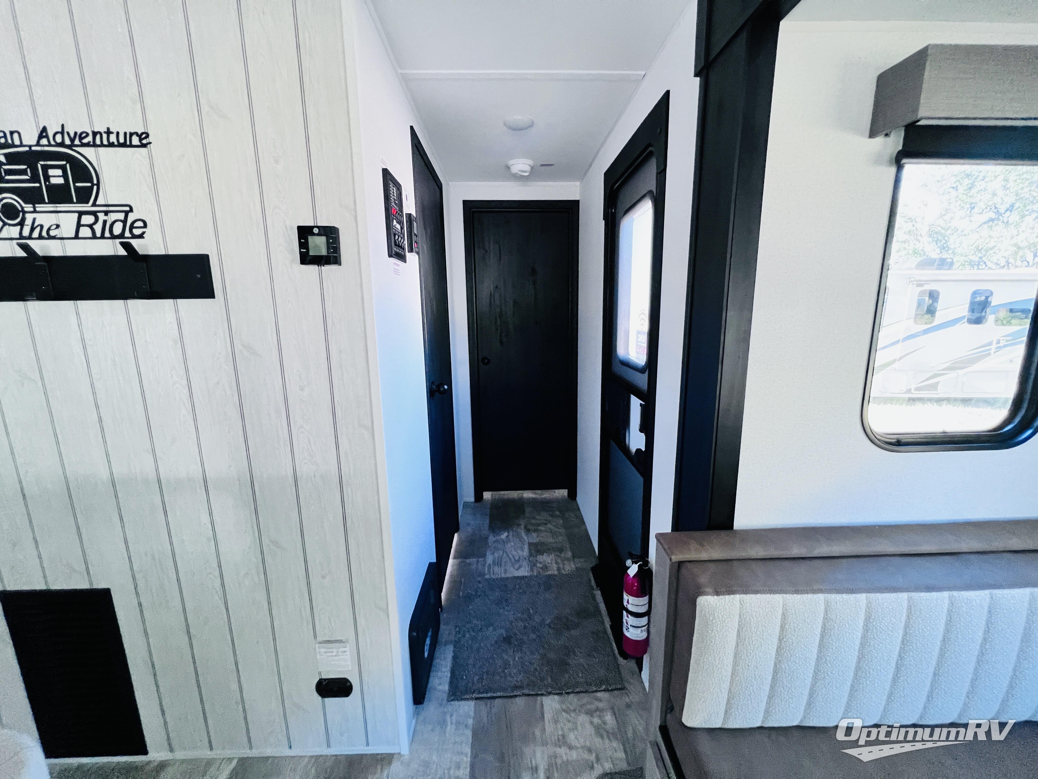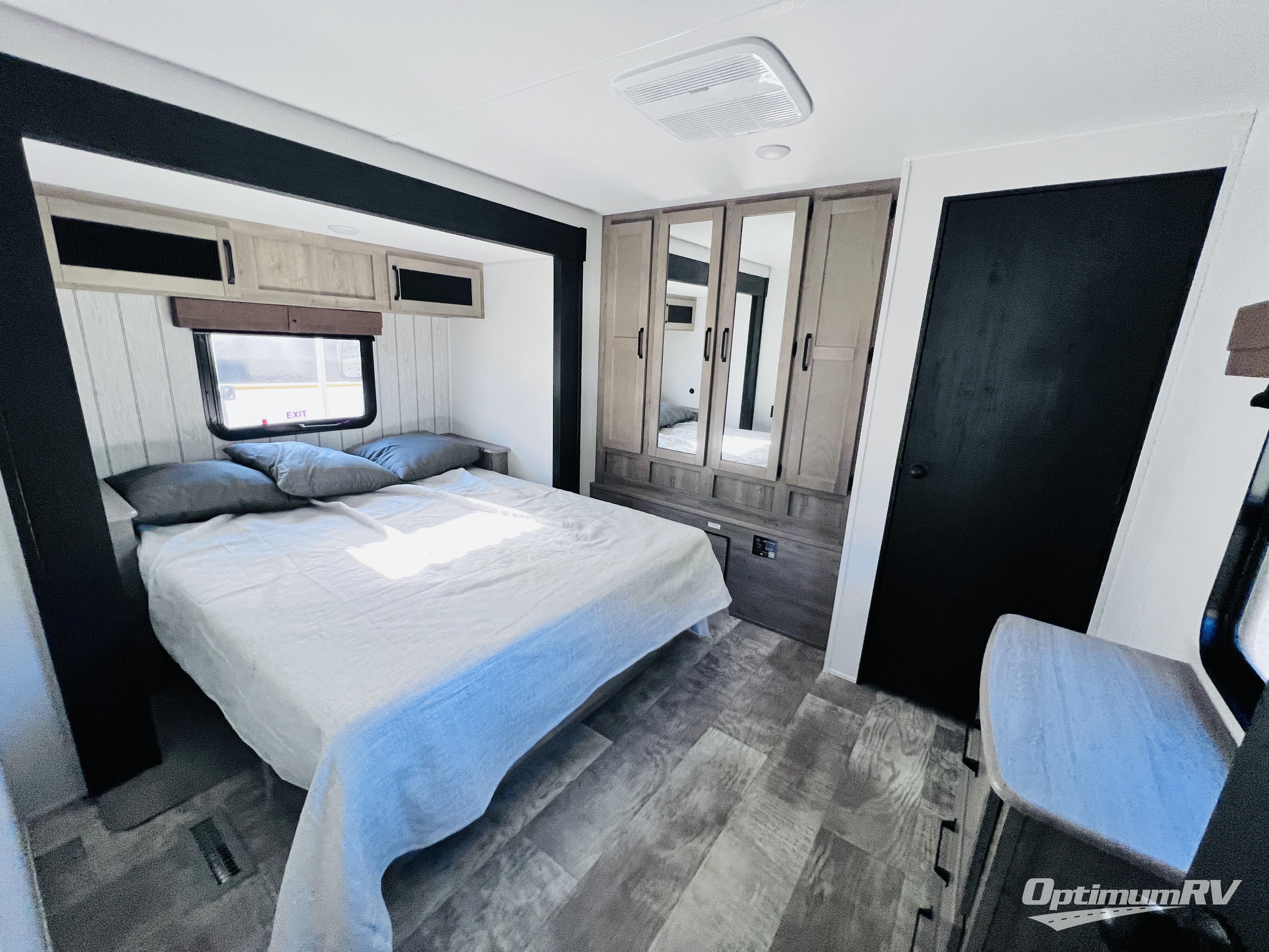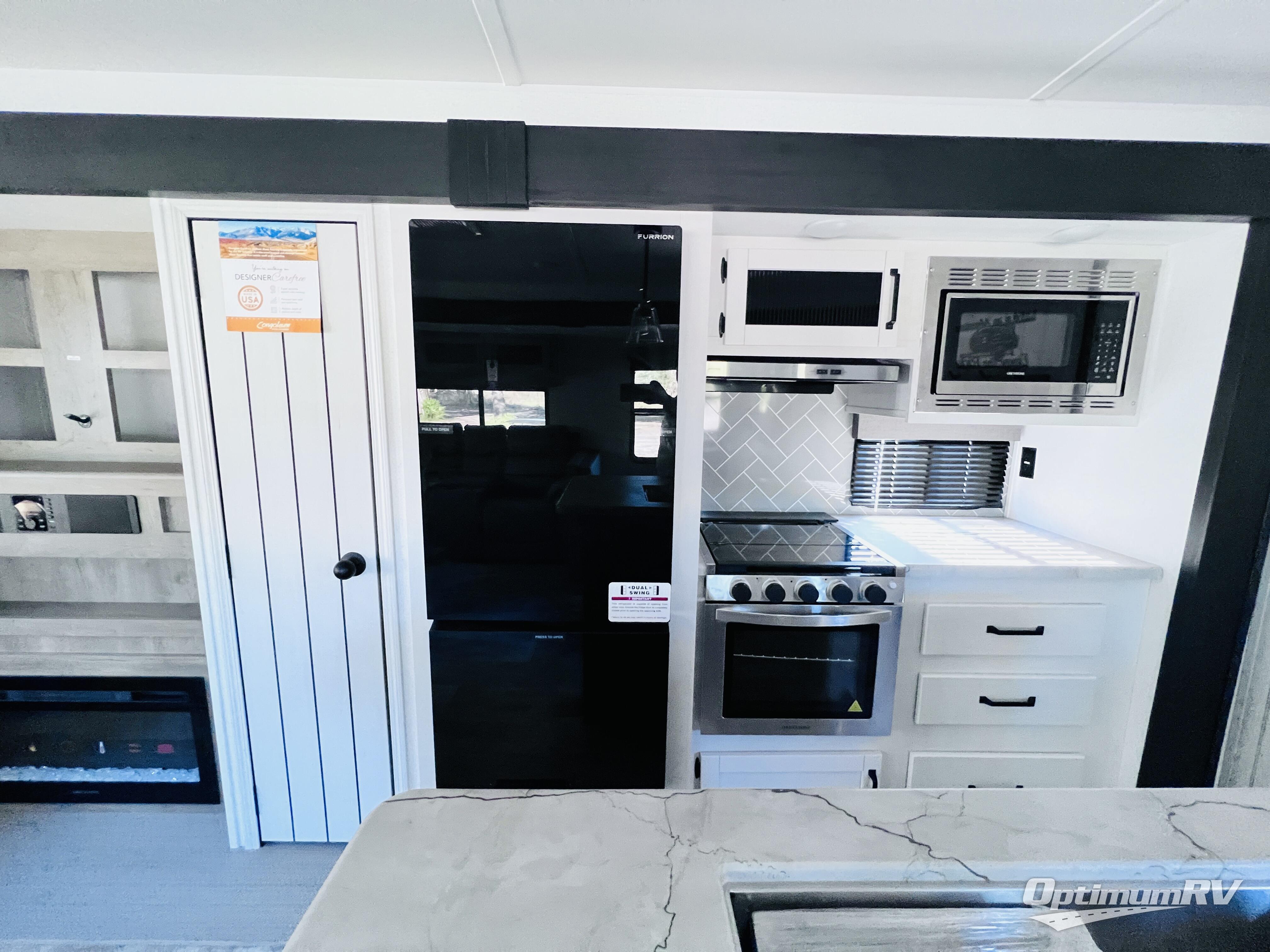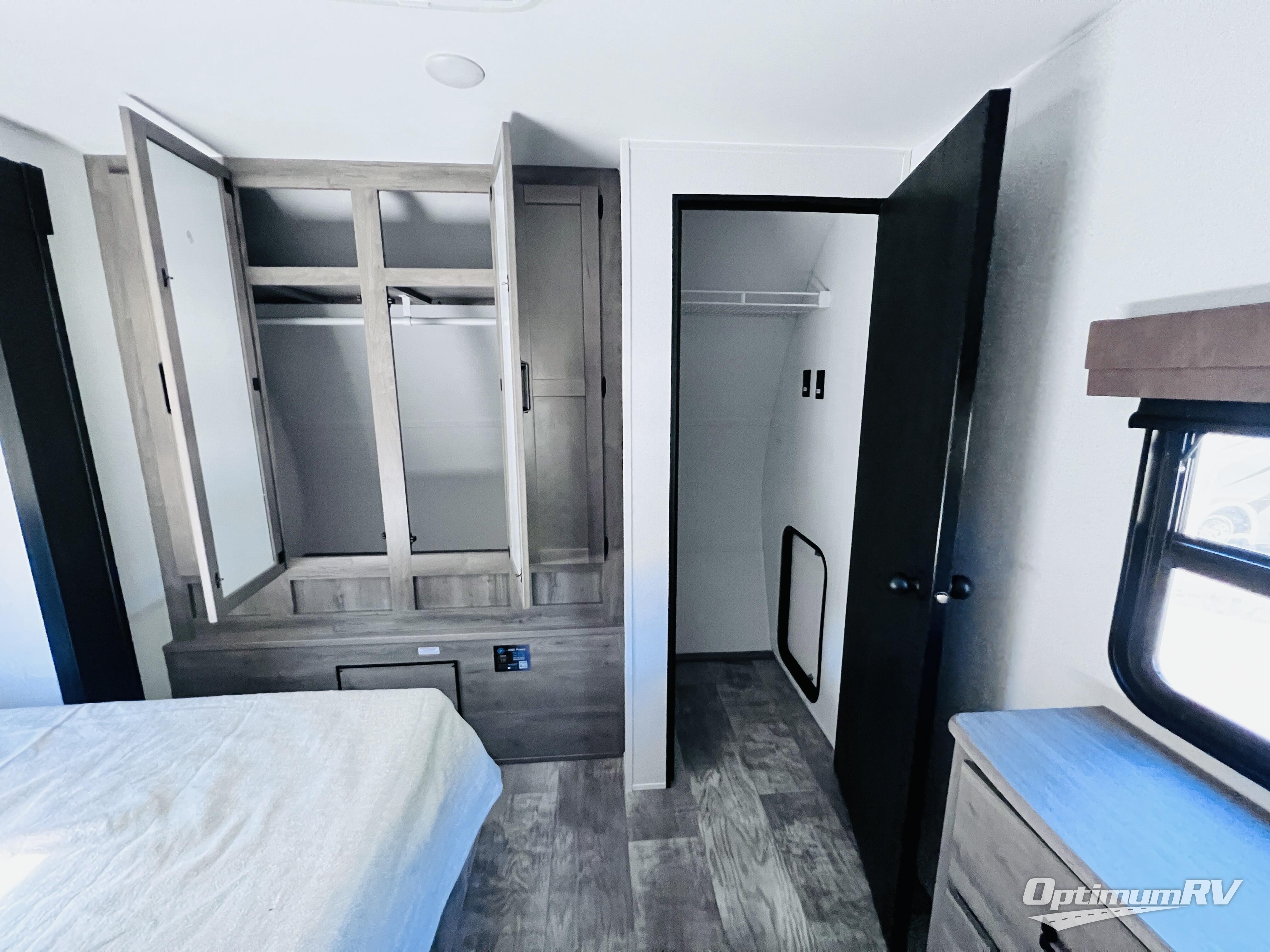 You're going to feel right at home in this travel trailer! The front private bedroom has a queen bed slide for a good night's rest, a dresser and front closet for your clothes, and another closet with washer and dryer prep. Freshen up each morning in the full bathroom with the 32" x 40" shower with a seat and then head to the kitchen to fry up some eggs on the three burner cooktop. You will also appreciate having a kitchen island for easier meal prep and a walk-in pantry to easily see your canned goods and snacks. The booth dinette offers a comfortable place to dine, play, and even sleep once converted. What better way to wind down your nights than to relax on either the rear sofa or in one of the two recliners across from the entertainment center with a fireplace!