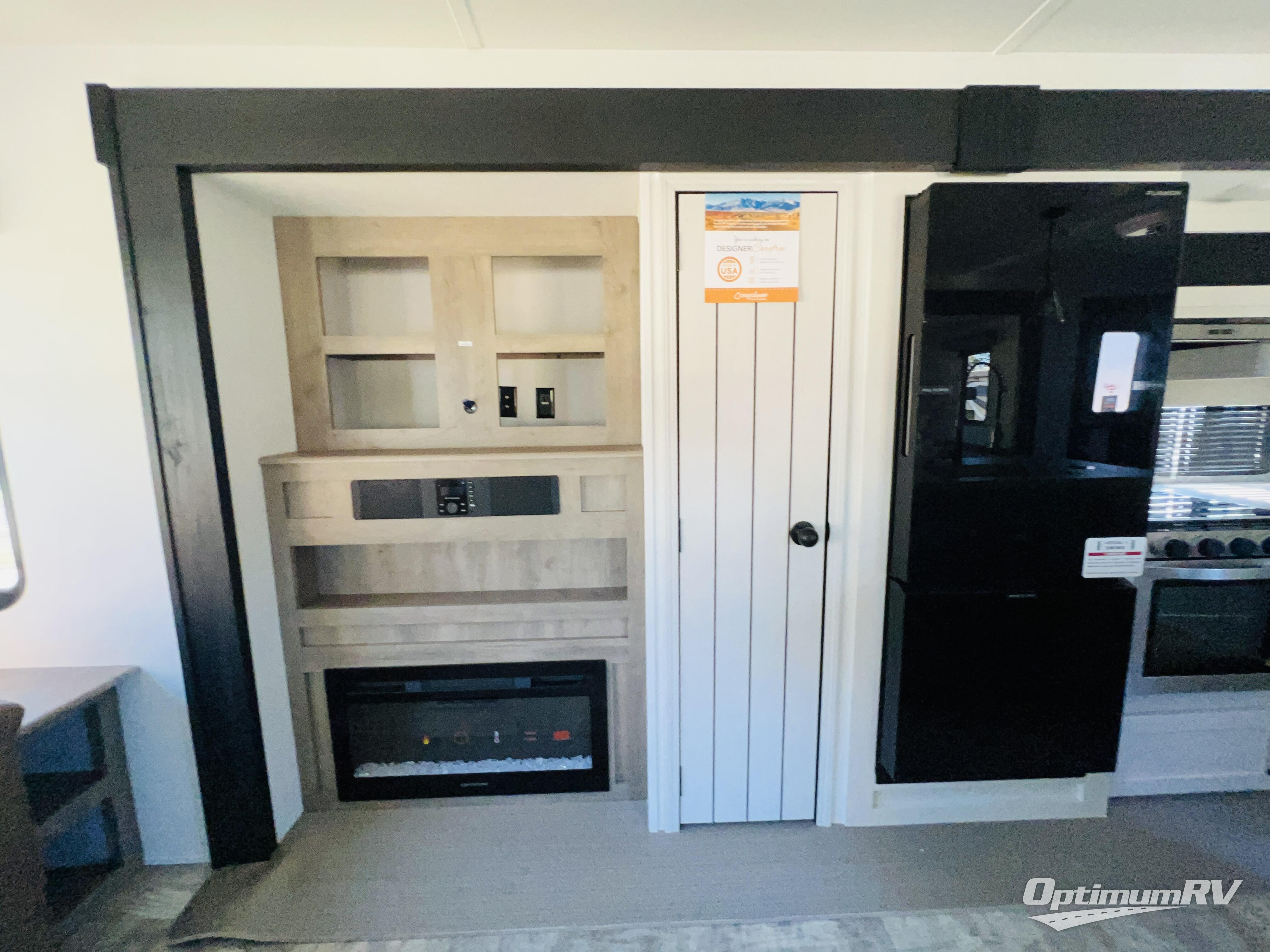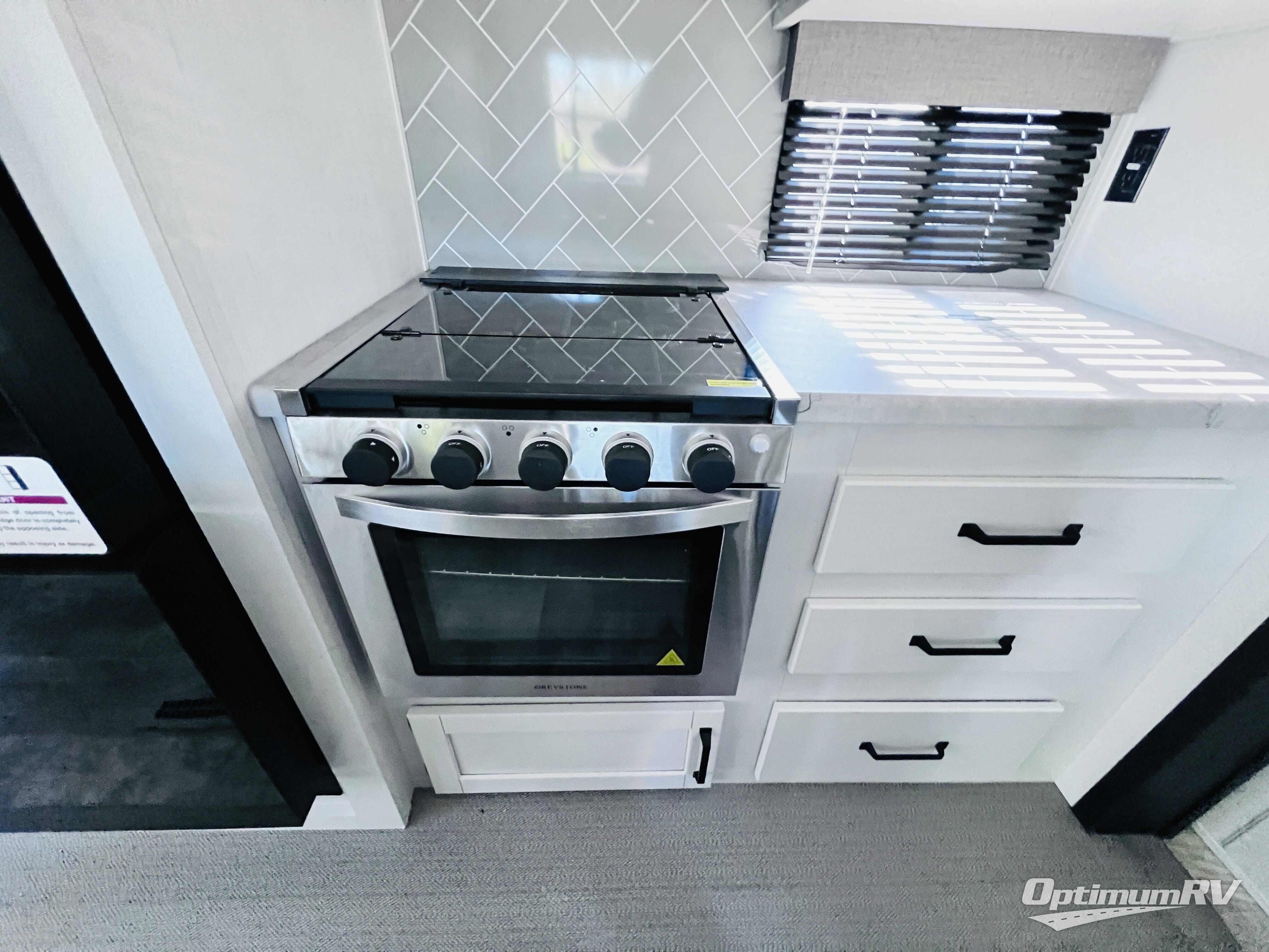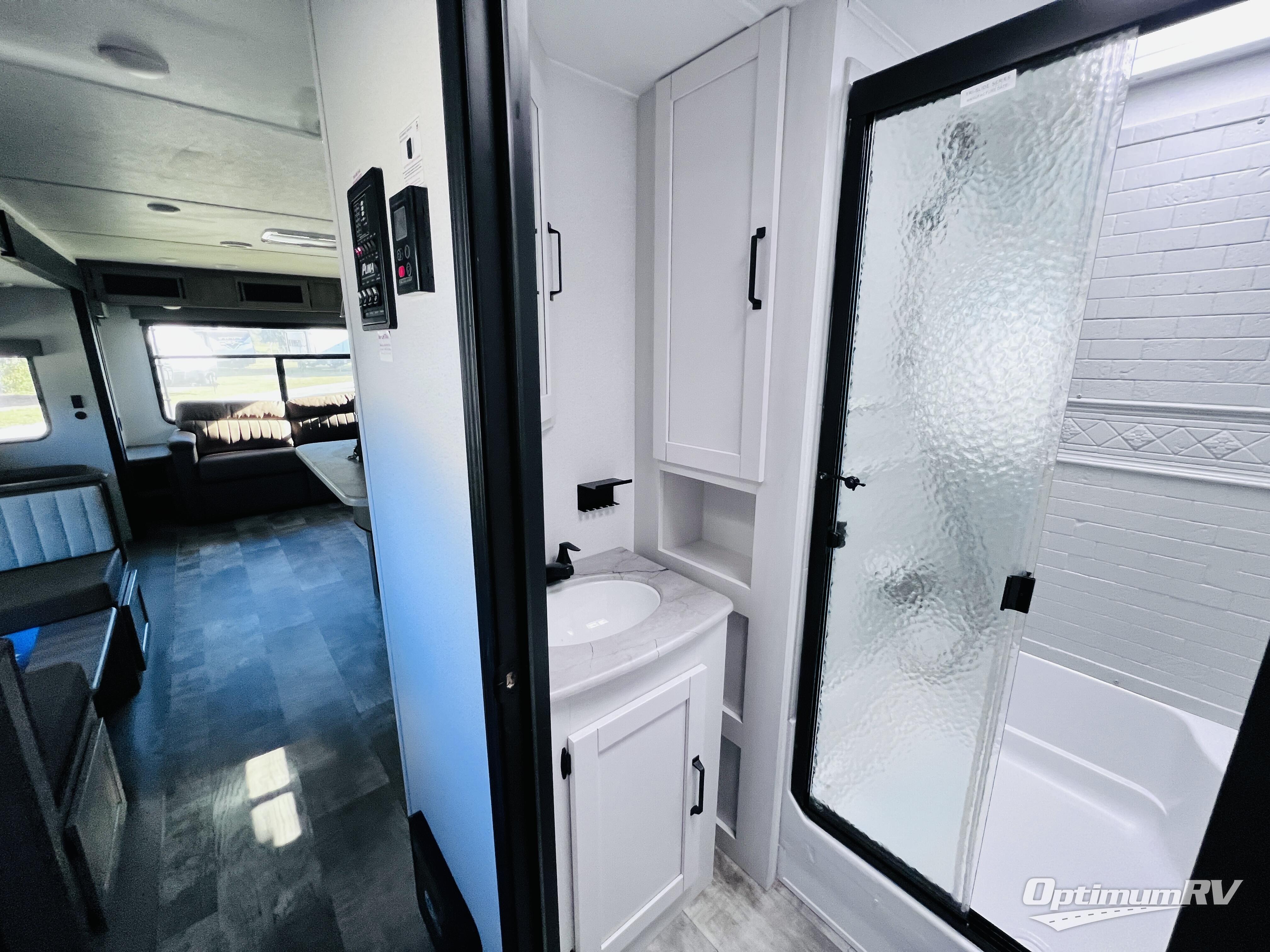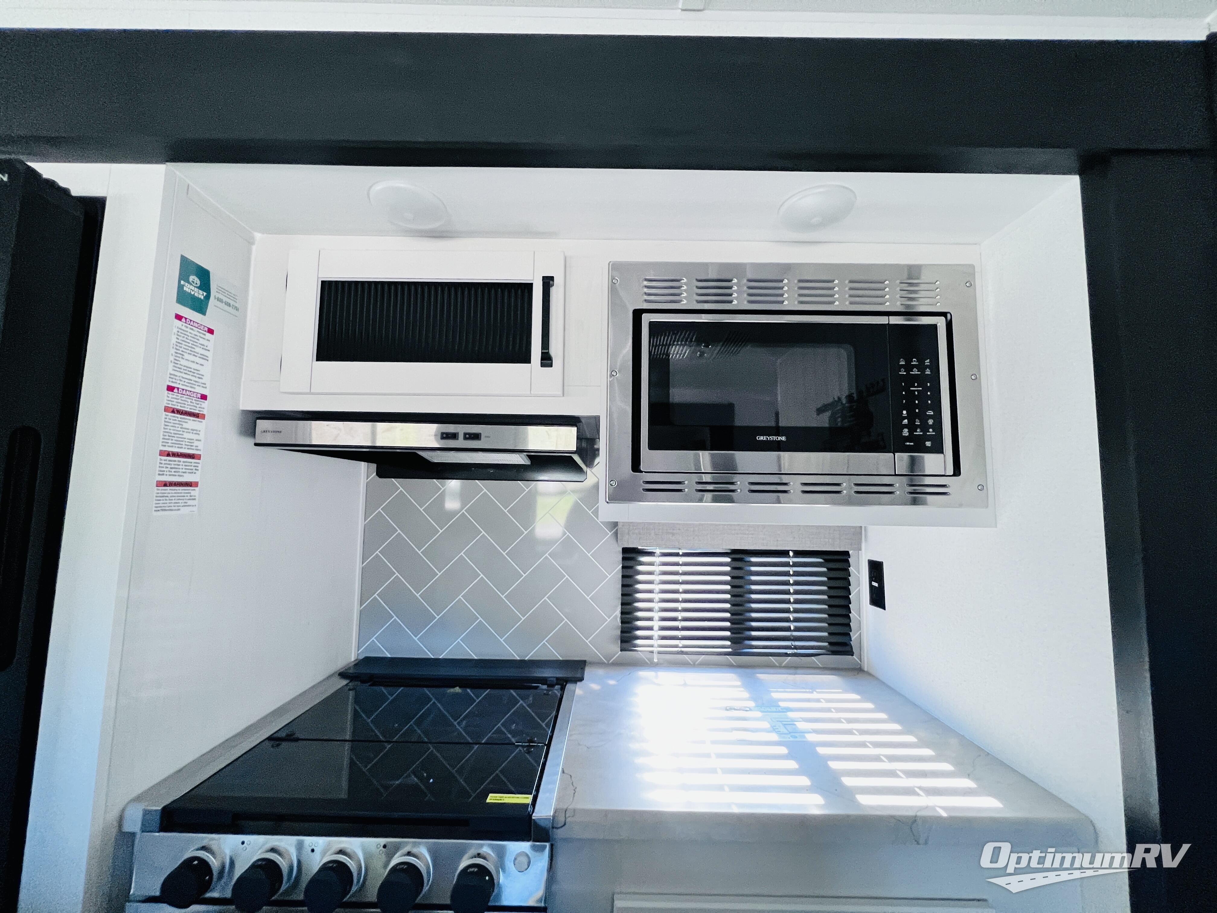 You're going to feel right at home in this travel trailer! The front private bedroom has a queen bed slide for a good night's rest, a dresser and front closet for your clothes, and another closet with washer and dryer prep. Freshen up each morning in the full bathroom with the 32" x 40" shower with a seat and then head to the kitchen to fry up some eggs on the three burner cooktop. You will also appreciate having a kitchen island for easier meal prep and a walk-in pantry to easily see your canned goods and snacks. The booth dinette offers a comfortable place to dine, play, and even sleep once converted. What better way to wind down your nights than to relax on either the rear sofa or in one of the two recliners across from the entertainment center with a fireplace!