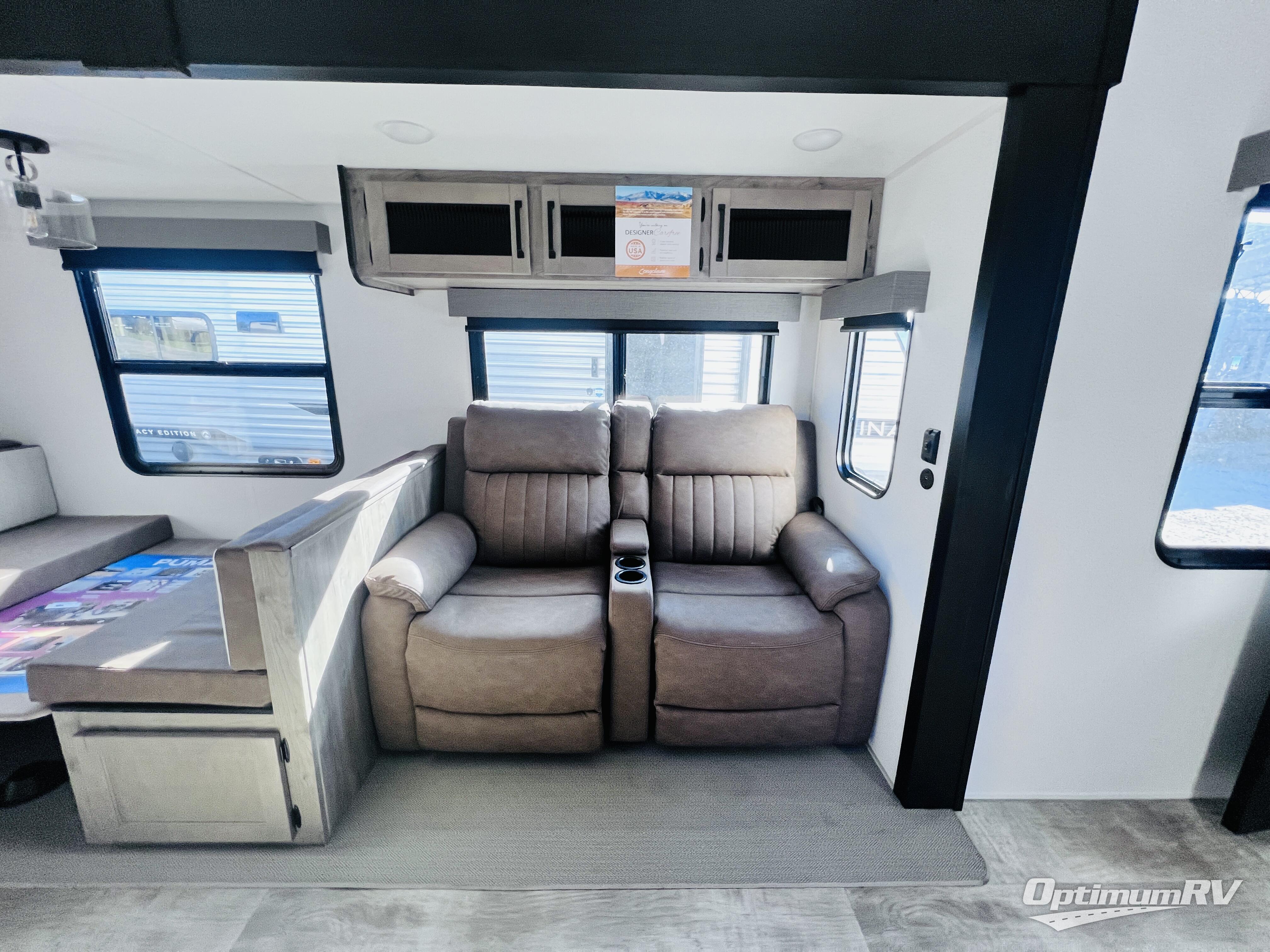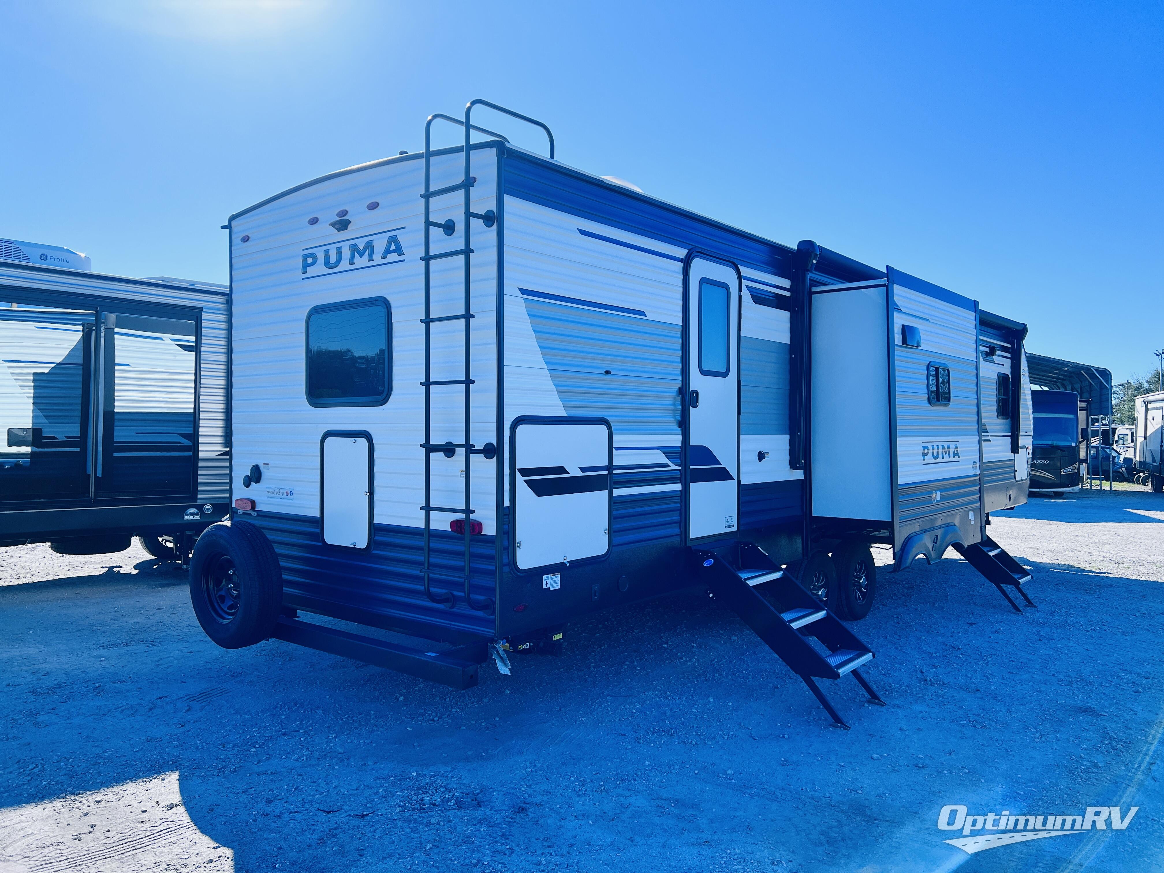 If you're looking for family-fun adventure then you need one of these Palomino Puma fifth wheels or travel trailers! They are built rugged, easy to tow, and jam packed with features. The Darco wrapped underbelly will protect your units vitals through every season and the AlphaPly roofing membrane covers it. They also have super lube axles and a powder coated frame. Their luxurious interiors feature a spice rack and built-in knife rack in the kitchen, USB charging ports to keep your electronics at 100%, and high density foam mattresses for a good night's rest. The required Advantage package comes with night roller shades for privacy at night, two outside speakers to crank up the tunes while you play cornhole, and an outside shower to keep the dirt outside where it belongs, plus so much more!