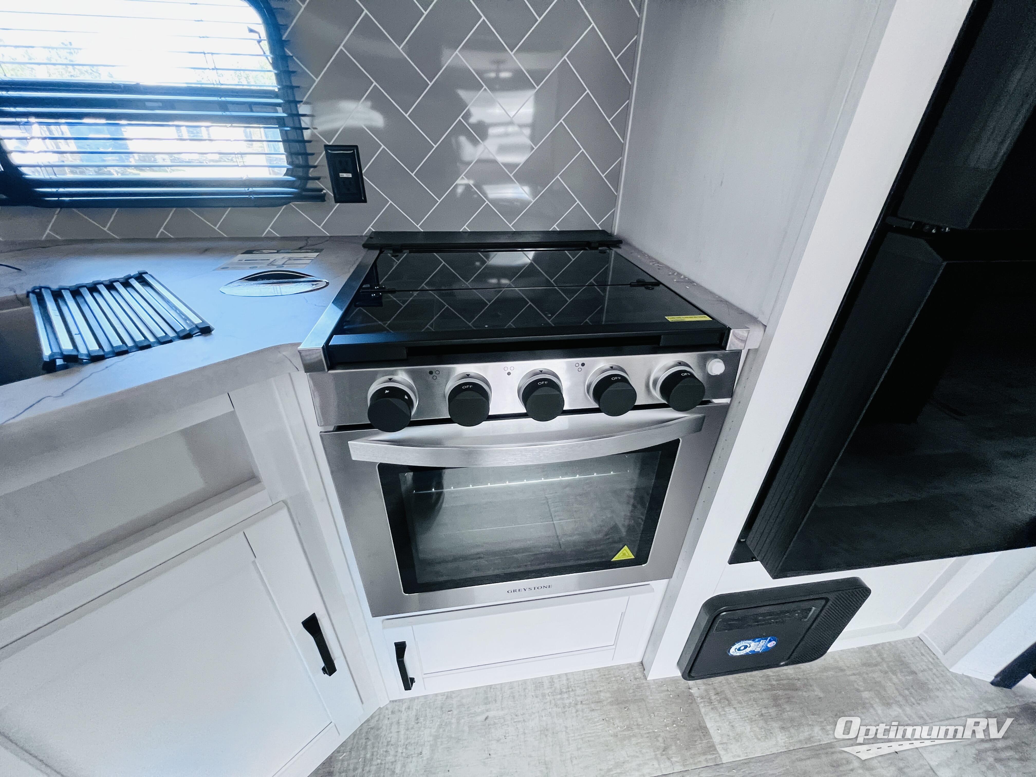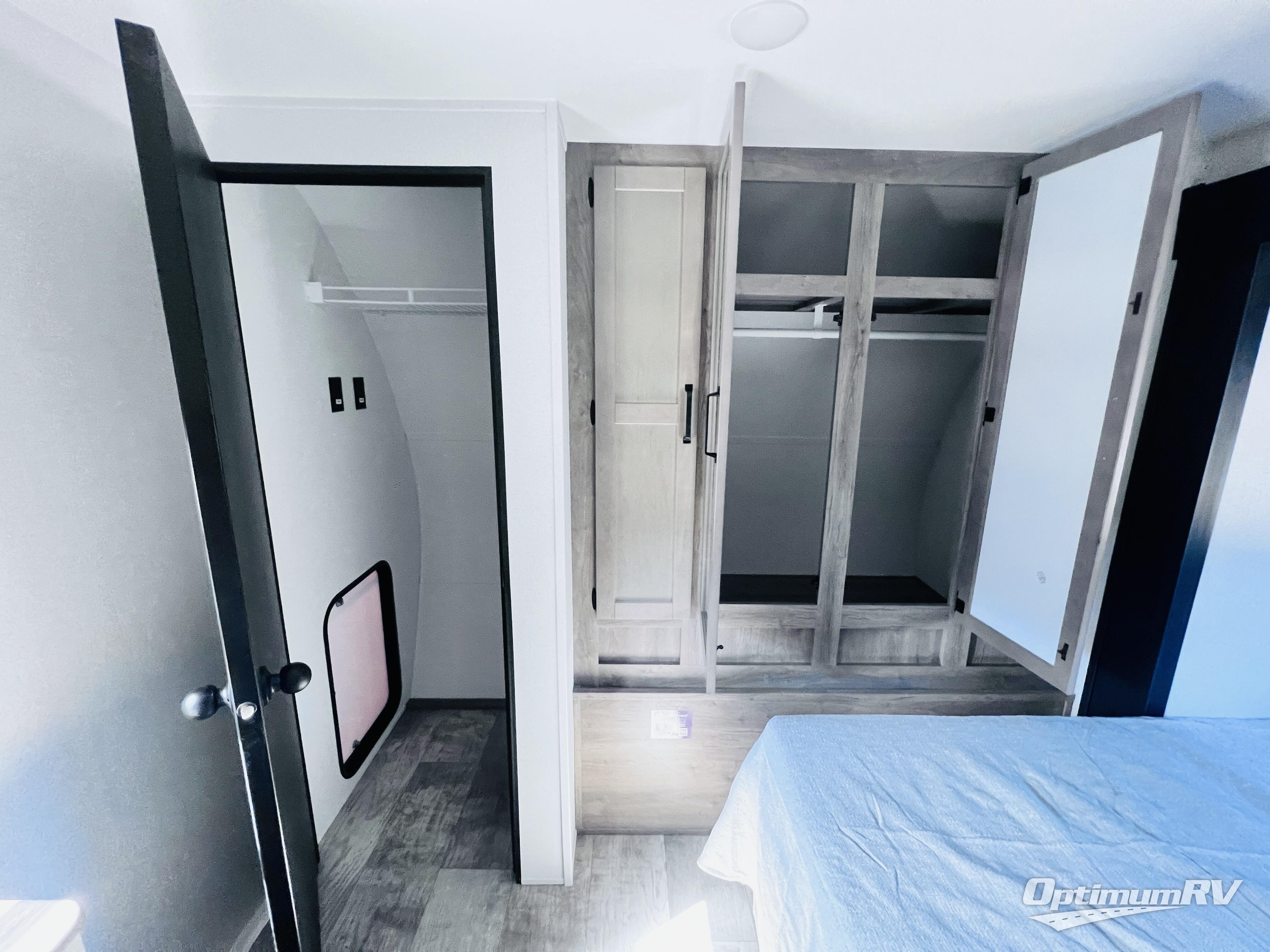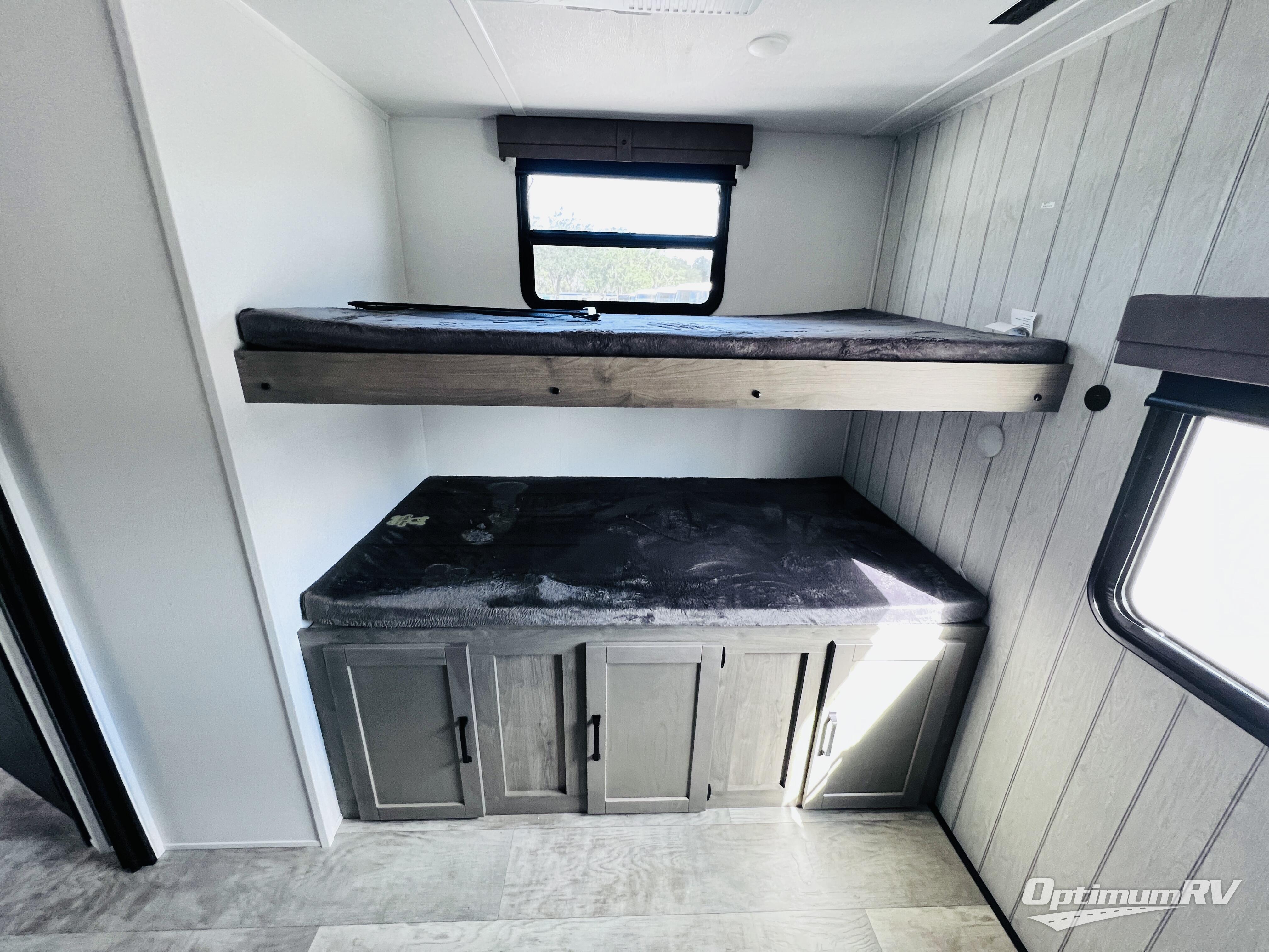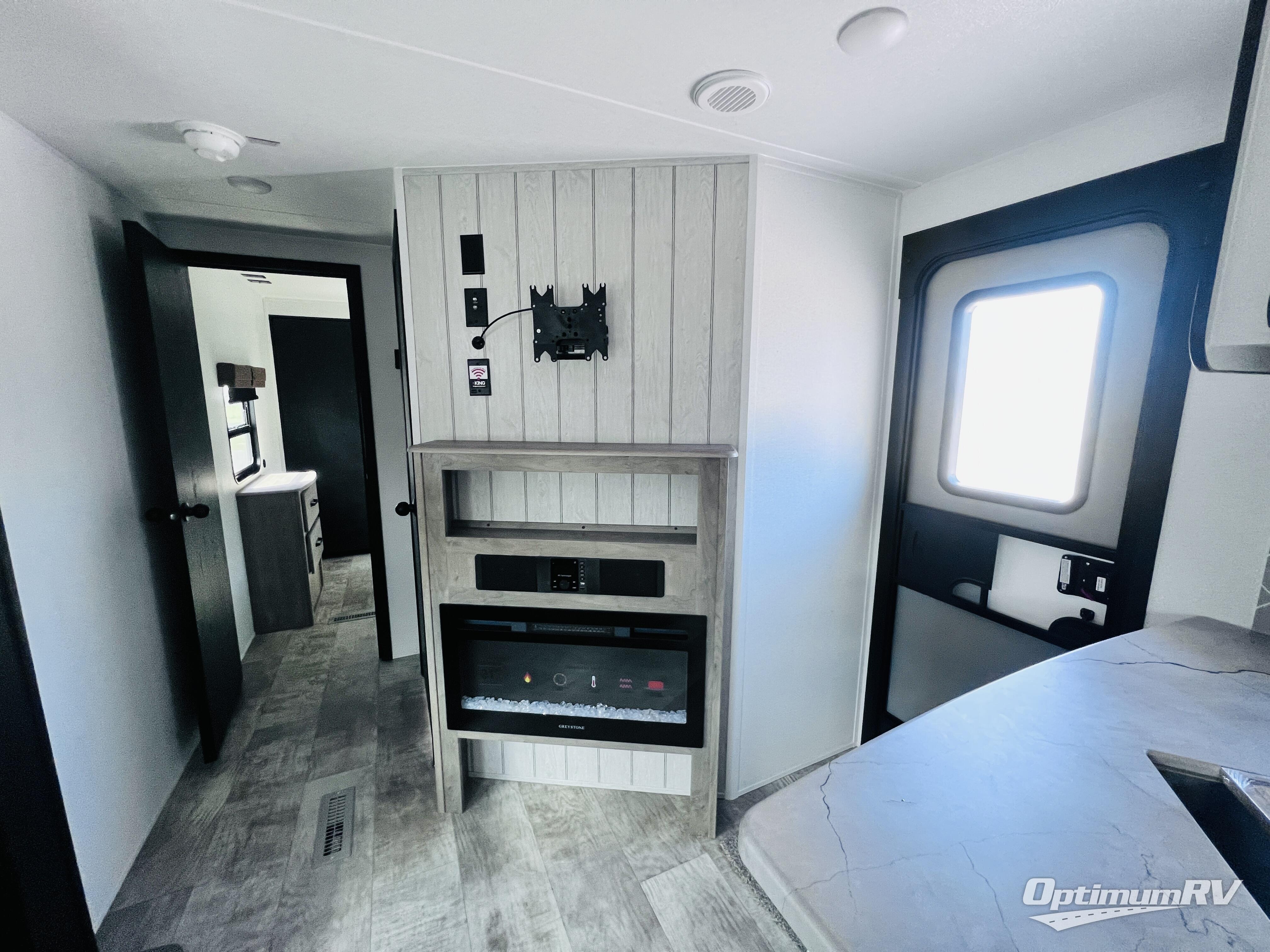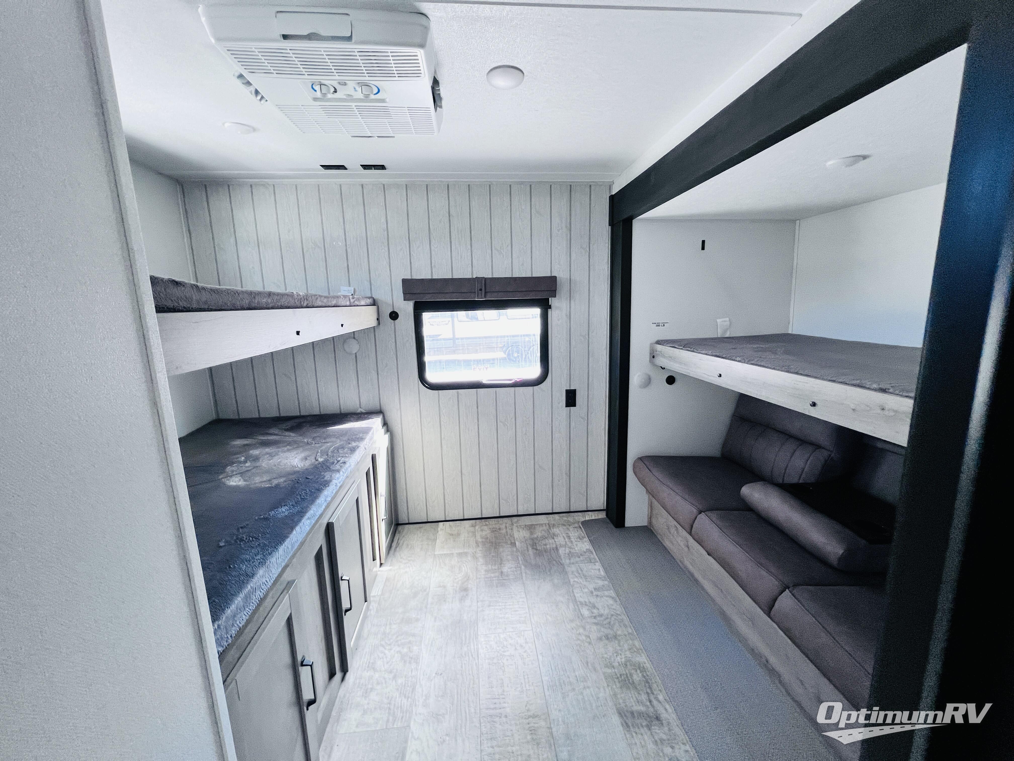 With dual entry doors and a bath and a half, you will have the ultimate in convenience with this travel trailer! The bedroom also has a front closet to keep your clothes looking their best and a queen bed slide for you to sleep your best. Everyone can freshen up in the full bathroom with the 34" x 34" radius shower and fill their bellies with scrambled eggs cooked on the three burner cooktop. Enjoy your meals, play games, and even sleep at the booth dinette or relax on the sofa while watching a movie with the entertainment center and fireplace. And your guests will love the rear private bunkhouse with three bunks, a jiffy sofa, and a slide out for more space! This model also includes an optional outside mini kitchen with a griddle!