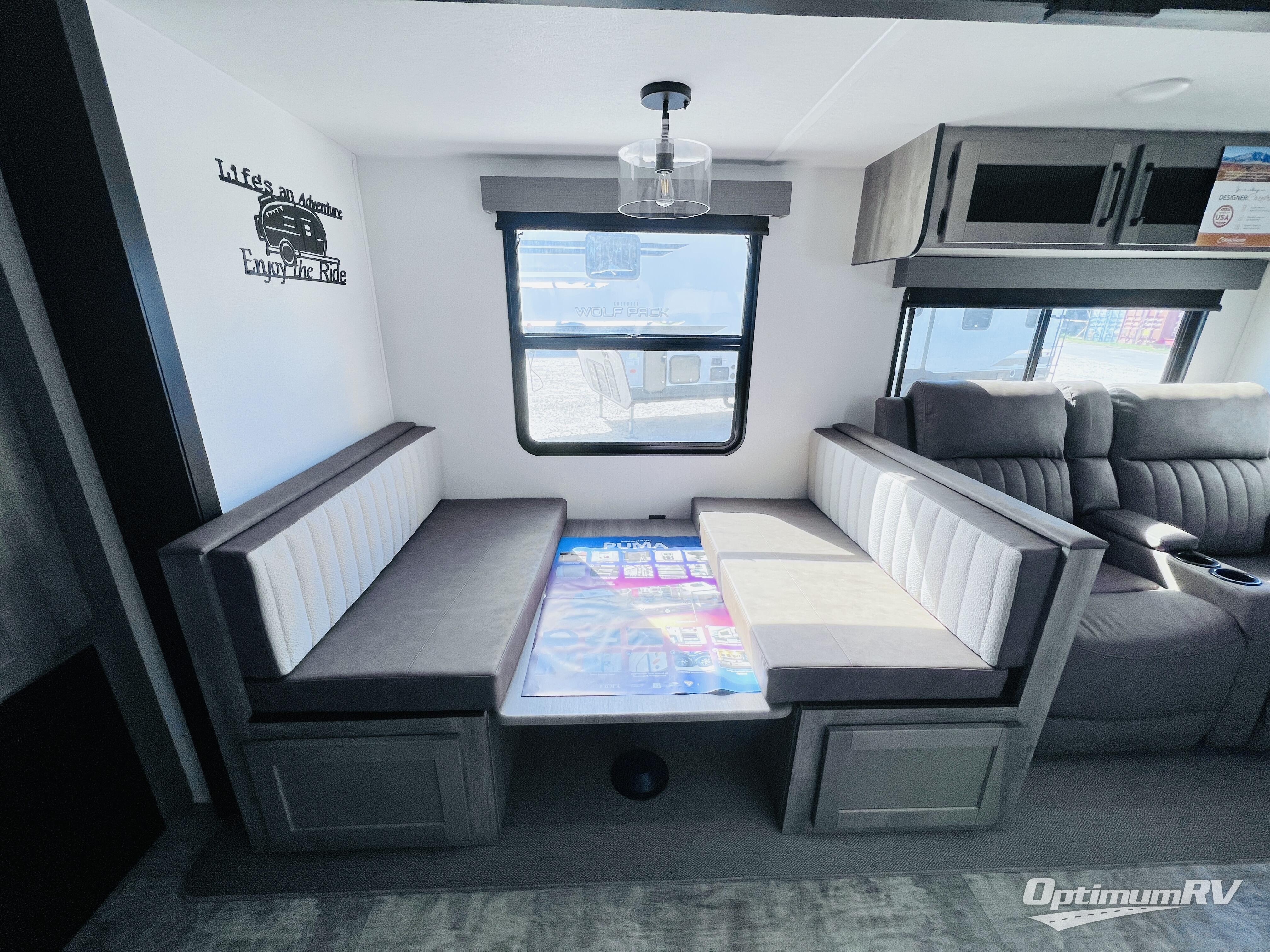 If you're looking for family-fun adventure then you need one of these Palomino Puma fifth wheels or travel trailers! They are built rugged, easy to tow, and jam packed with features. The Darco wrapped underbelly will protect your units vitals through every season and the AlphaPly roofing membrane covers it. They also have super lube axles and a powder coated frame. Their luxurious interiors feature a spice rack and built-in knife rack in the kitchen, USB charging ports to keep your electronics at 100%, and high density foam mattresses for a good night's rest. The required Advantage package comes with night roller shades for privacy at night, two outside speakers to crank up the tunes while you play cornhole, and an outside shower to keep the dirt outside where it belongs, plus so much more!
