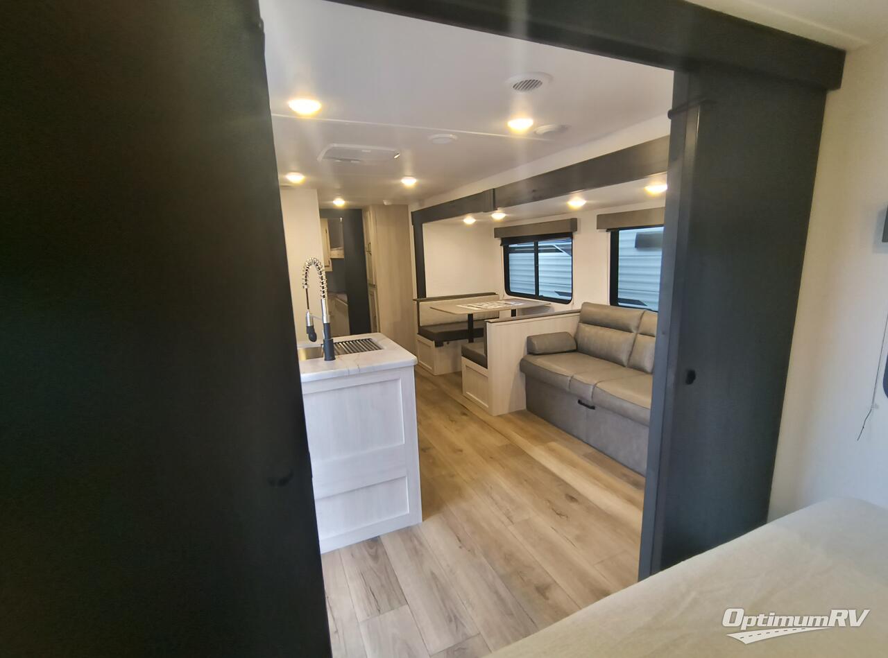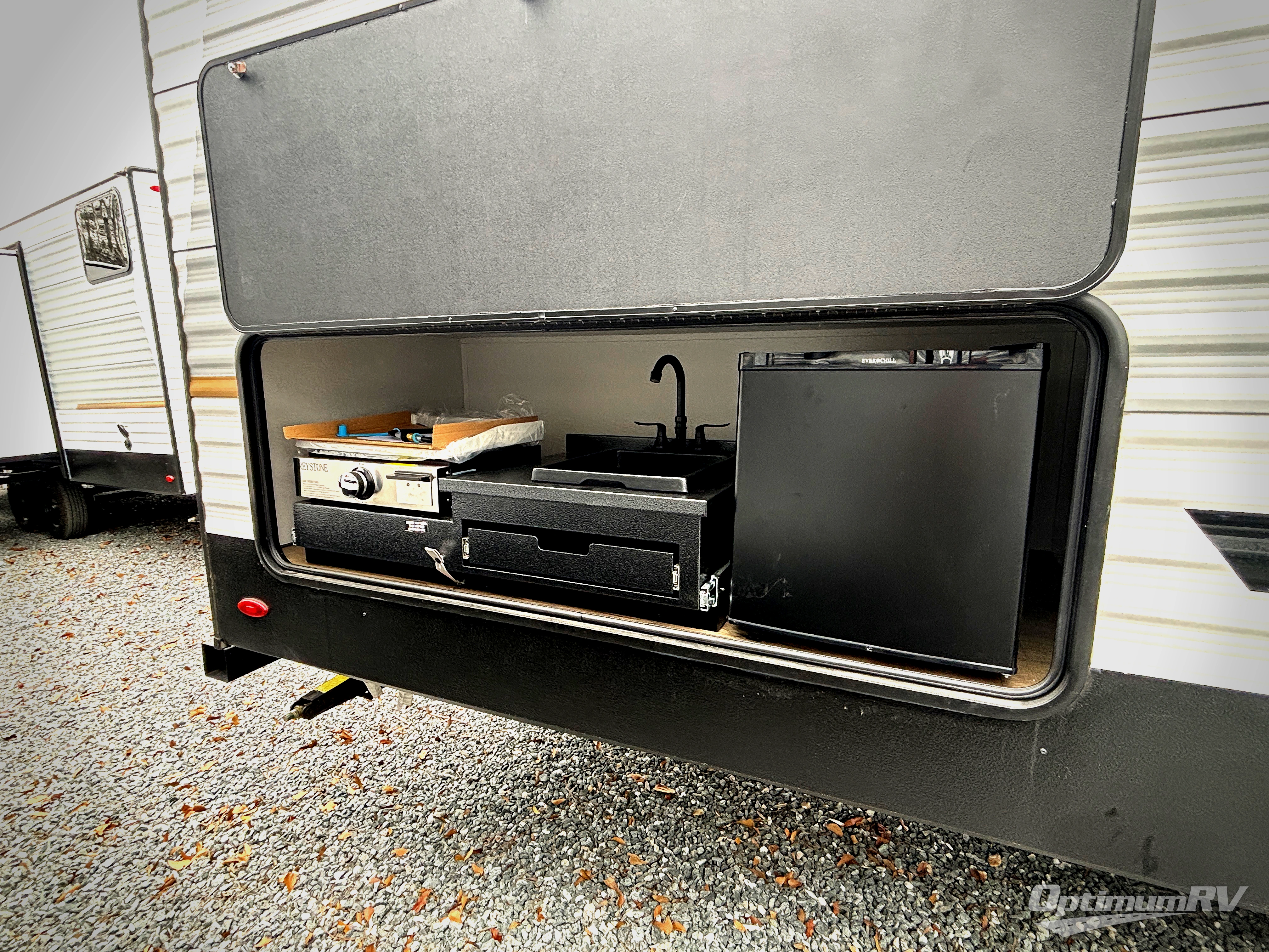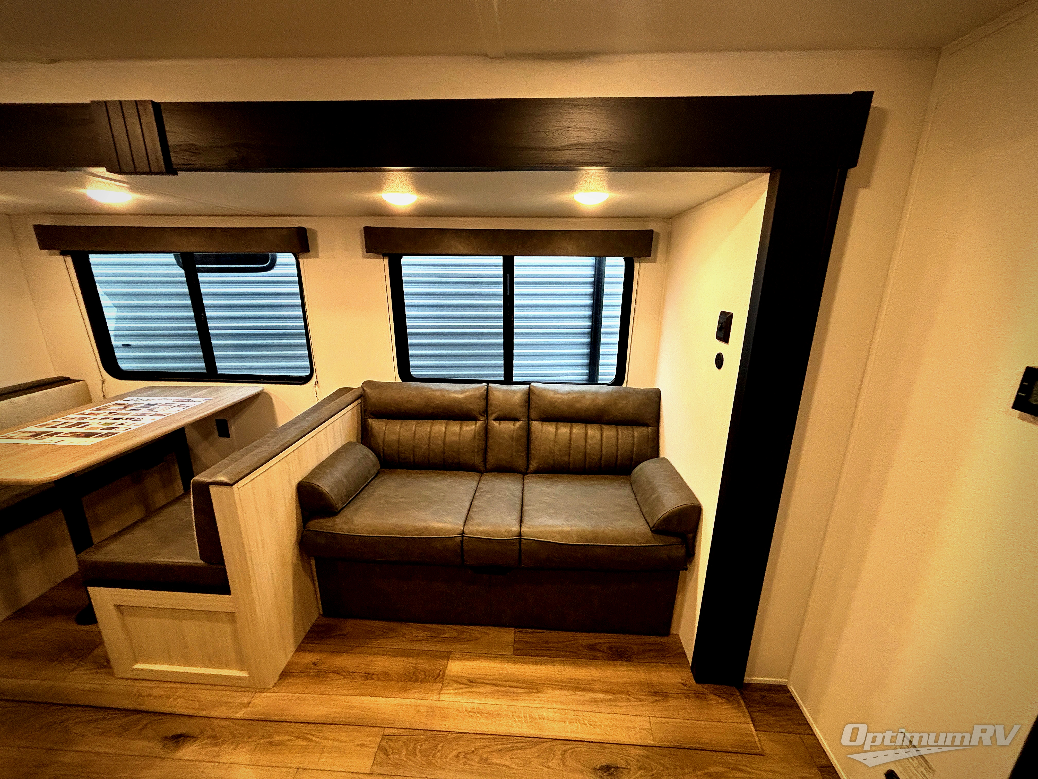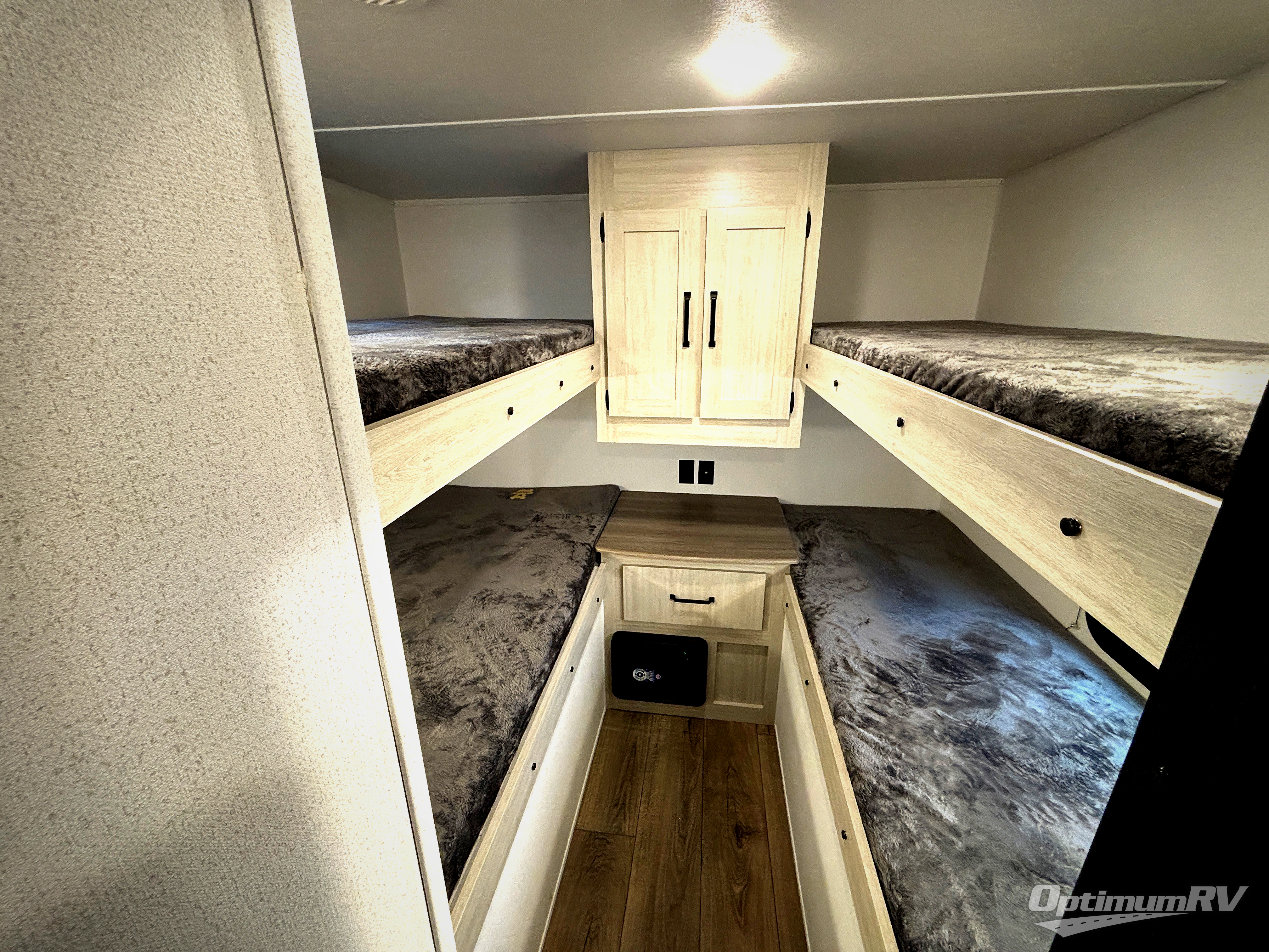 If you're looking for more space, this double axle unit features a large slide so you can walk about freely. Here, you'll find the booth dinette and sofa, which sit across from the optional TV if you want to enjoy movie nights. The full kitchen includes a stainless microwave and three burner cooktop to make meals, plus a pantry and 12V refrigerator for food storage. And an optional outside kitchen with a griddle can be added if you enjoy cooking outdoors! Your guests or littles are sure to enjoy the rear private bunkhouse with four bunk beds and a wardrobe for their things!