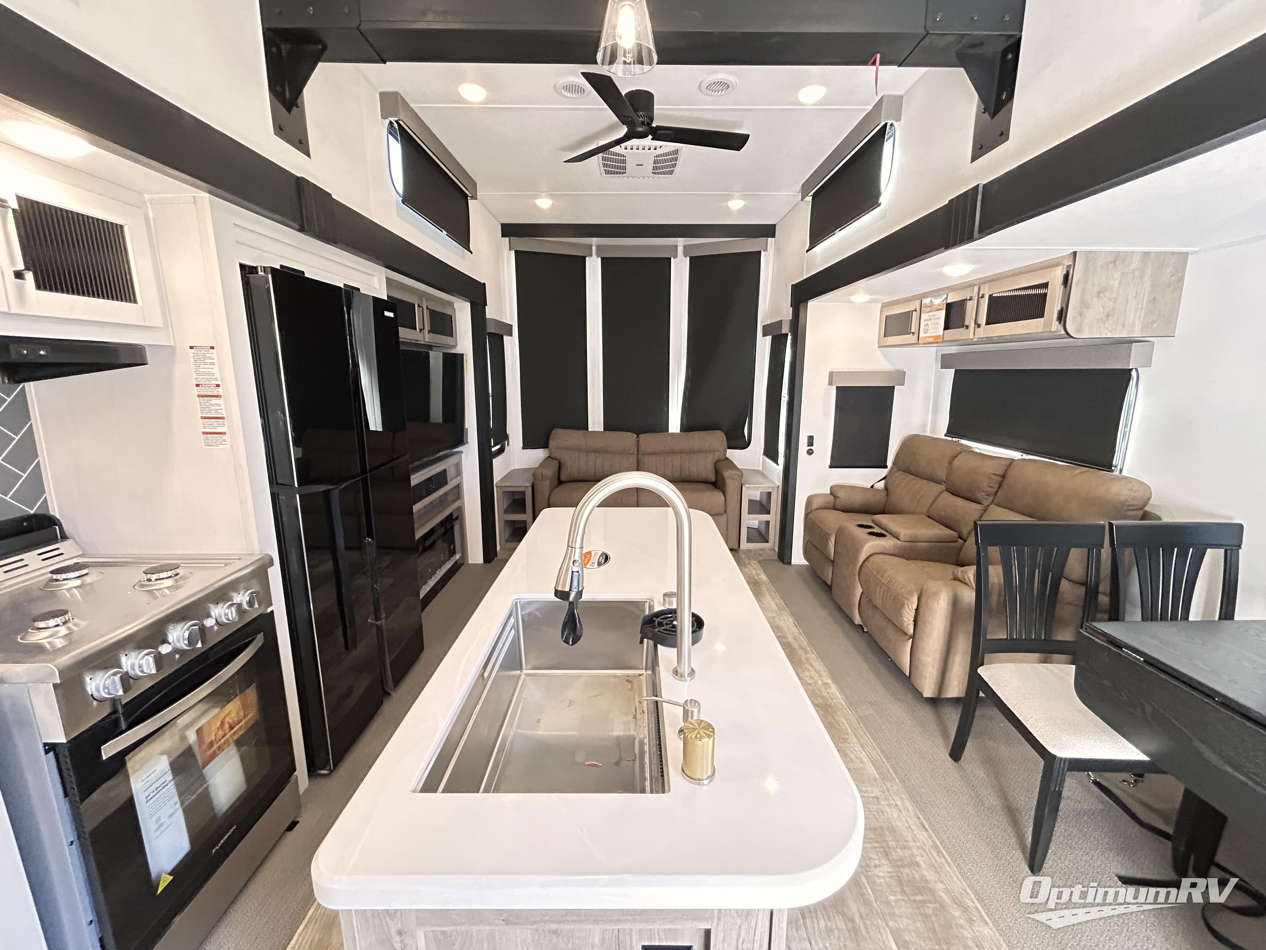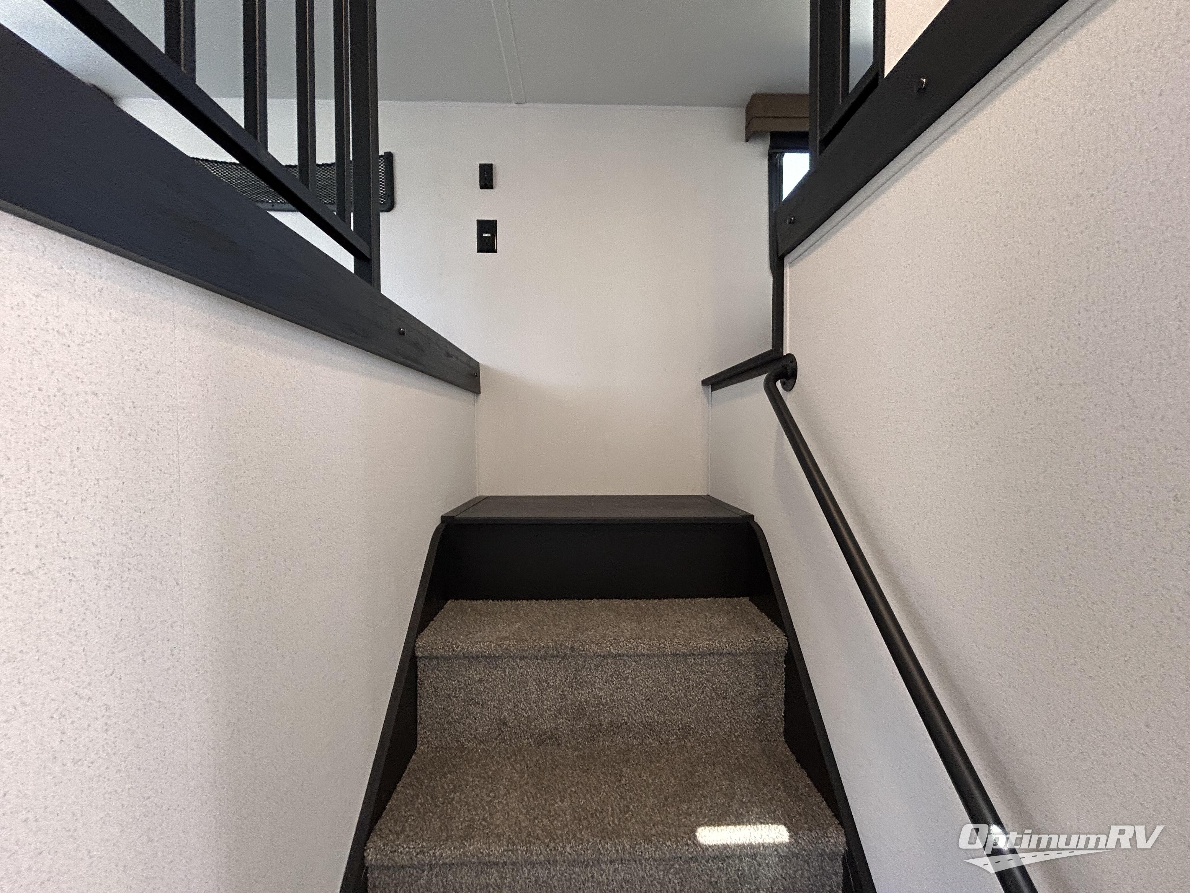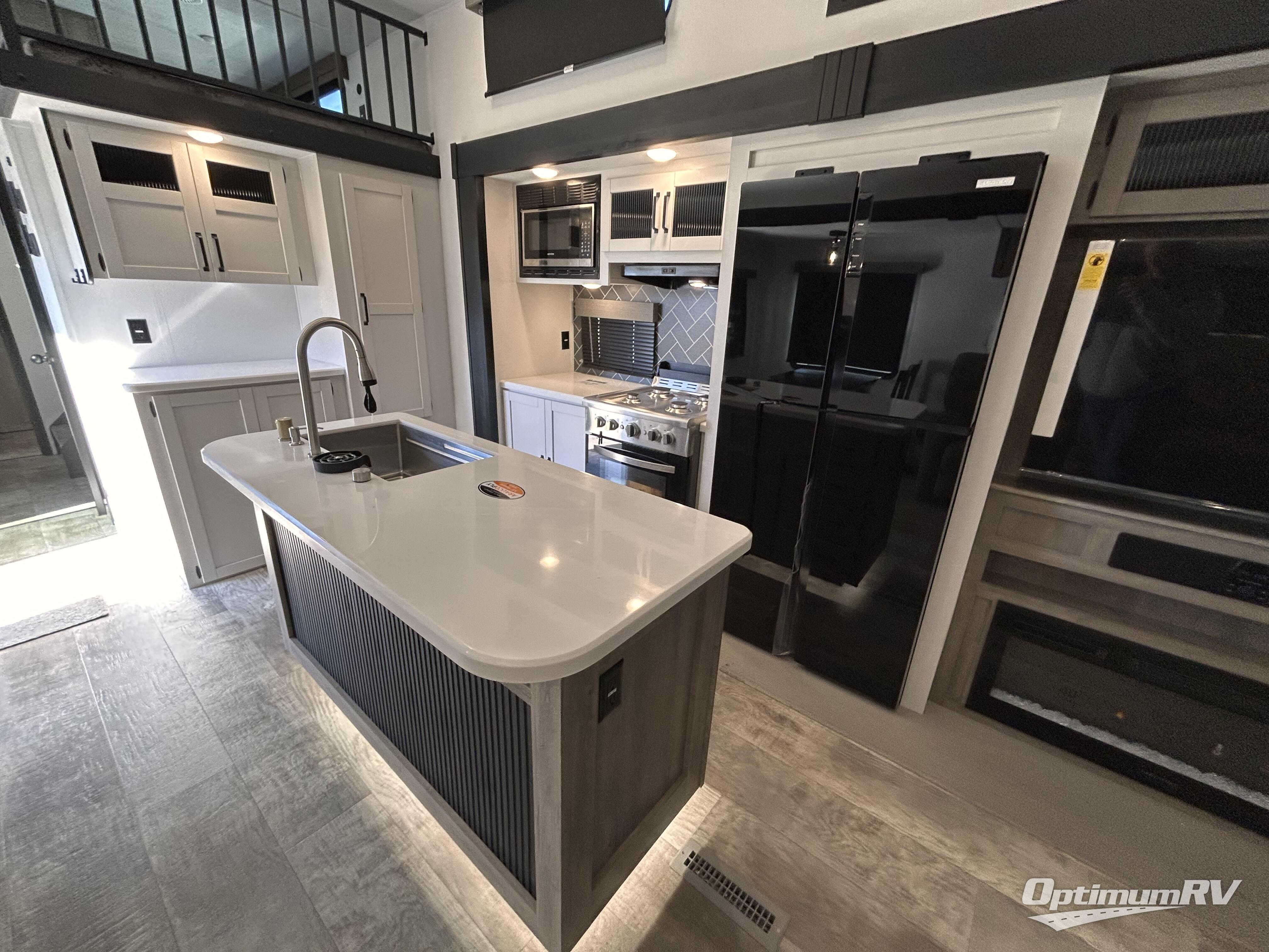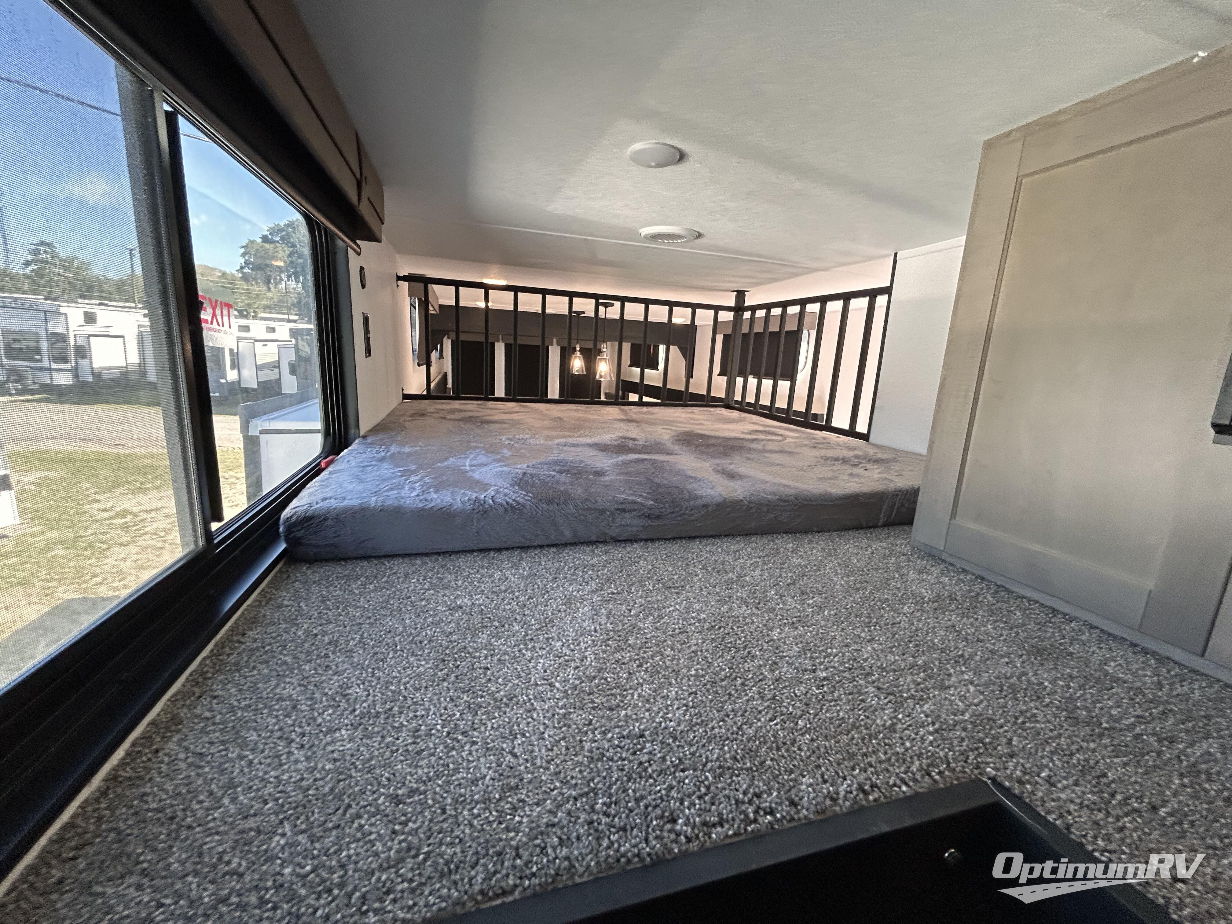 Wherever your destination may be, you can be sure to enjoy it to the fullest with this trailer in tow! With two entry doors, you can enter in through the rear private bedroom or the main living area. The bedroom includes a king bed slide out, a wardrobe/closet to keep your clothes organized, plus a closet with the option to add washer and dryer prep. Just outside this room are steps that lead to the large loft area with a 58" x 58" bunk mat and a cabinet on one side, plus two 32" x 69" bunk mats on the other. There is also a cabinet and a wardrobe/closet for plenty of storage space. Once you've headed back downstairs, you can relax on the dual recliners, front sofa, or free-standing table with a bench and two seats. And the chef of your group will love the kitchen with its residential style refrigerator and pantry, kitchen island, and four burner cooktop!