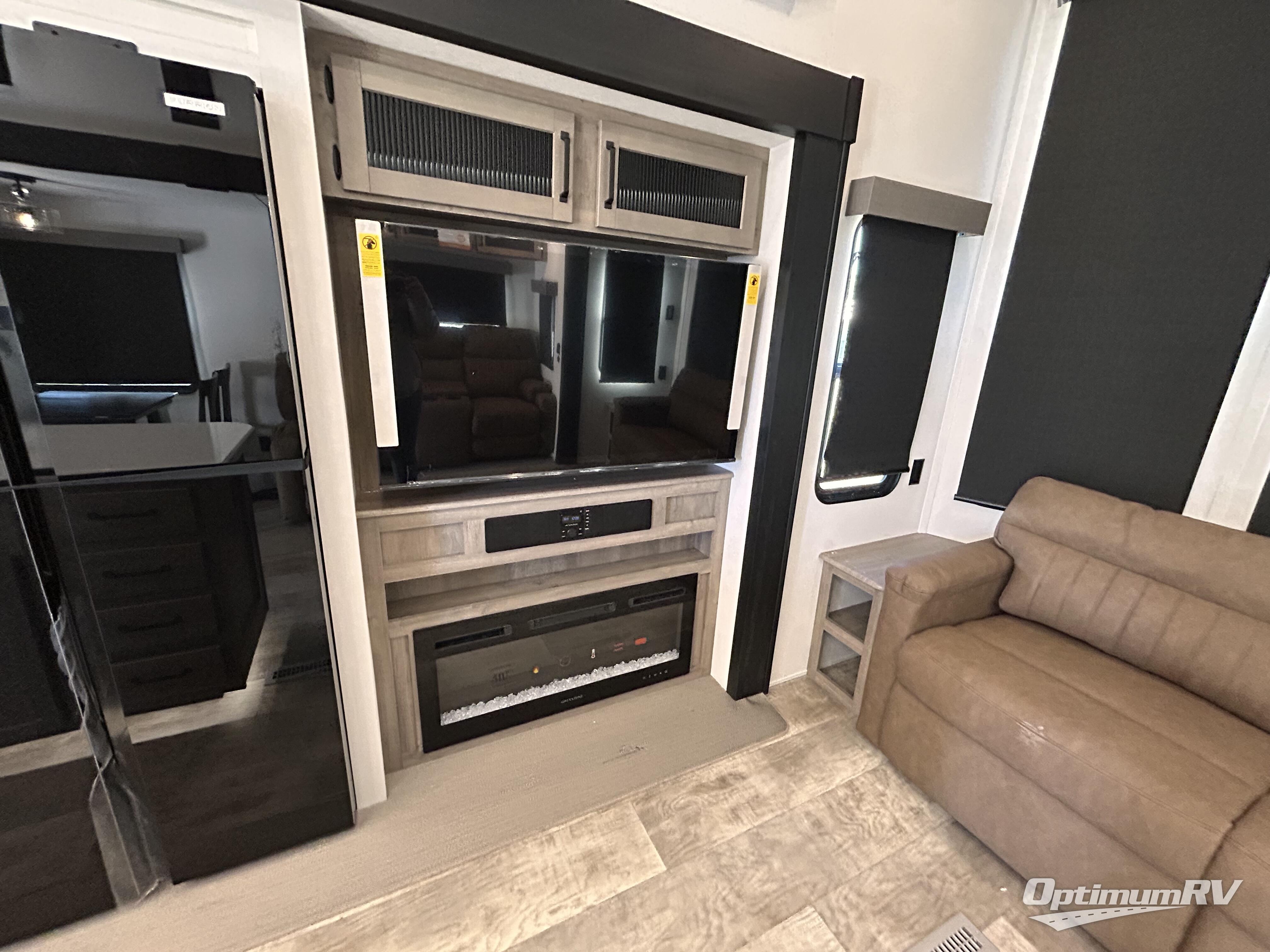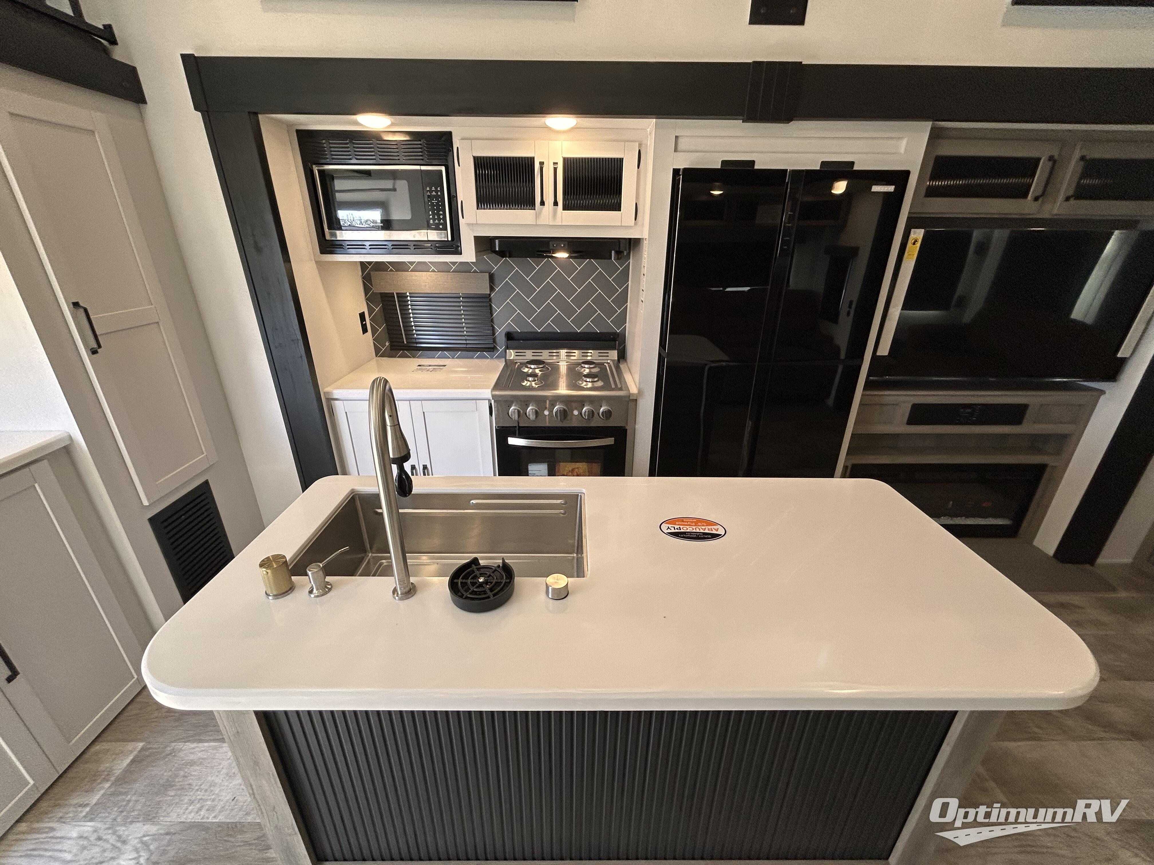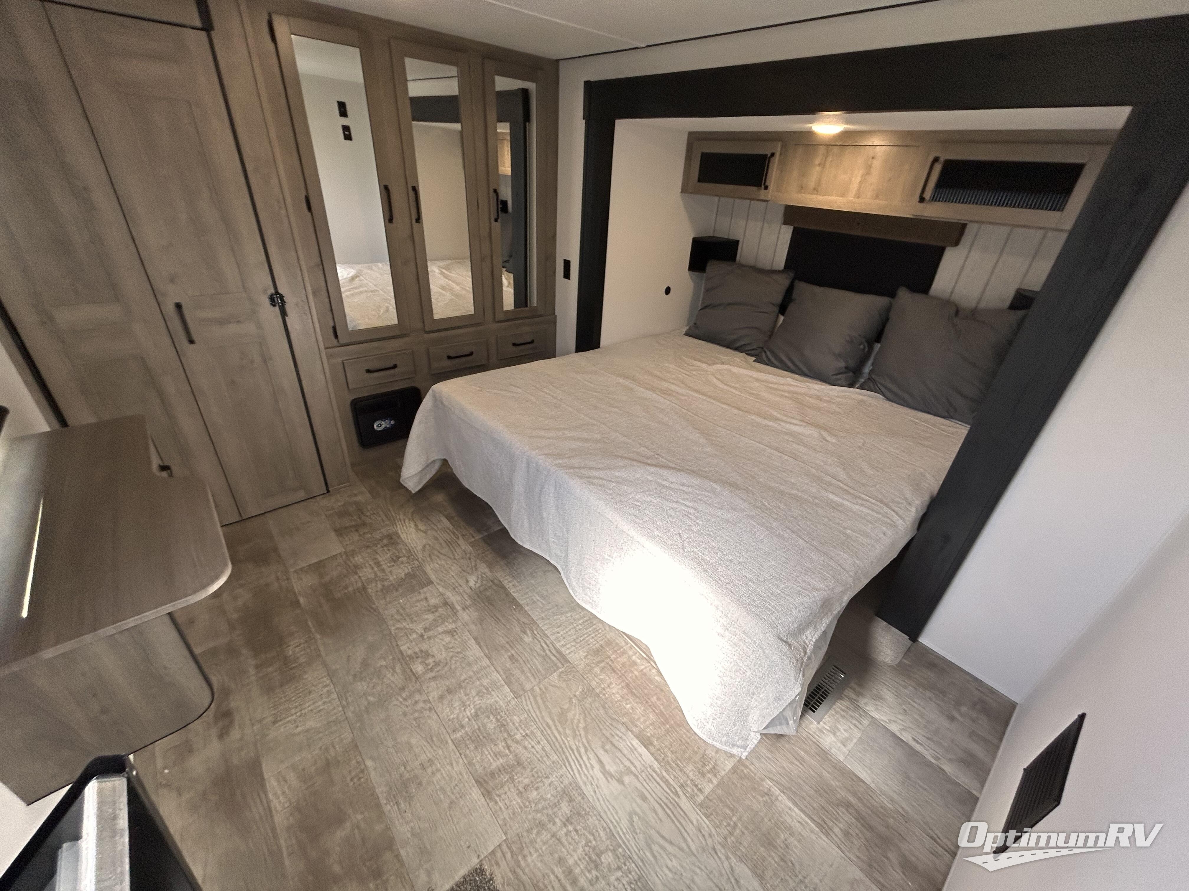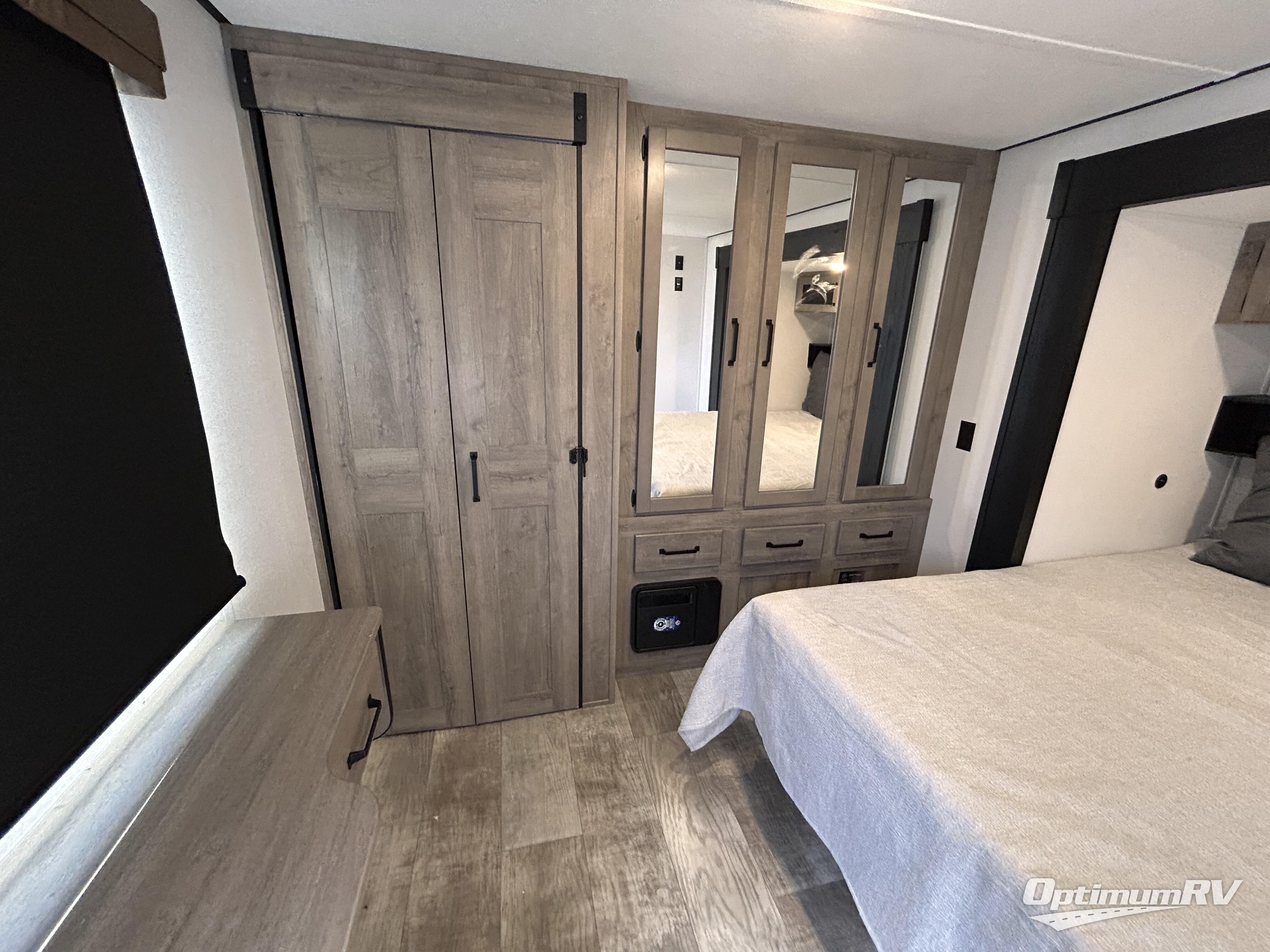 Wherever your destination may be, you can be sure to enjoy it to the fullest with this trailer in tow! With two entry doors, you can enter in through the rear private bedroom or the main living area. The bedroom includes a king bed slide out, a wardrobe/closet to keep your clothes organized, plus a closet with the option to add washer and dryer prep. Just outside this room are steps that lead to the large loft area with a 58" x 58" bunk mat and a cabinet on one side, plus two 32" x 69" bunk mats on the other. There is also a cabinet and a wardrobe/closet for plenty of storage space. Once you've headed back downstairs, you can relax on the dual recliners, front sofa, or free-standing table with a bench and two seats. And the chef of your group will love the kitchen with its residential style refrigerator and pantry, kitchen island, and four burner cooktop!